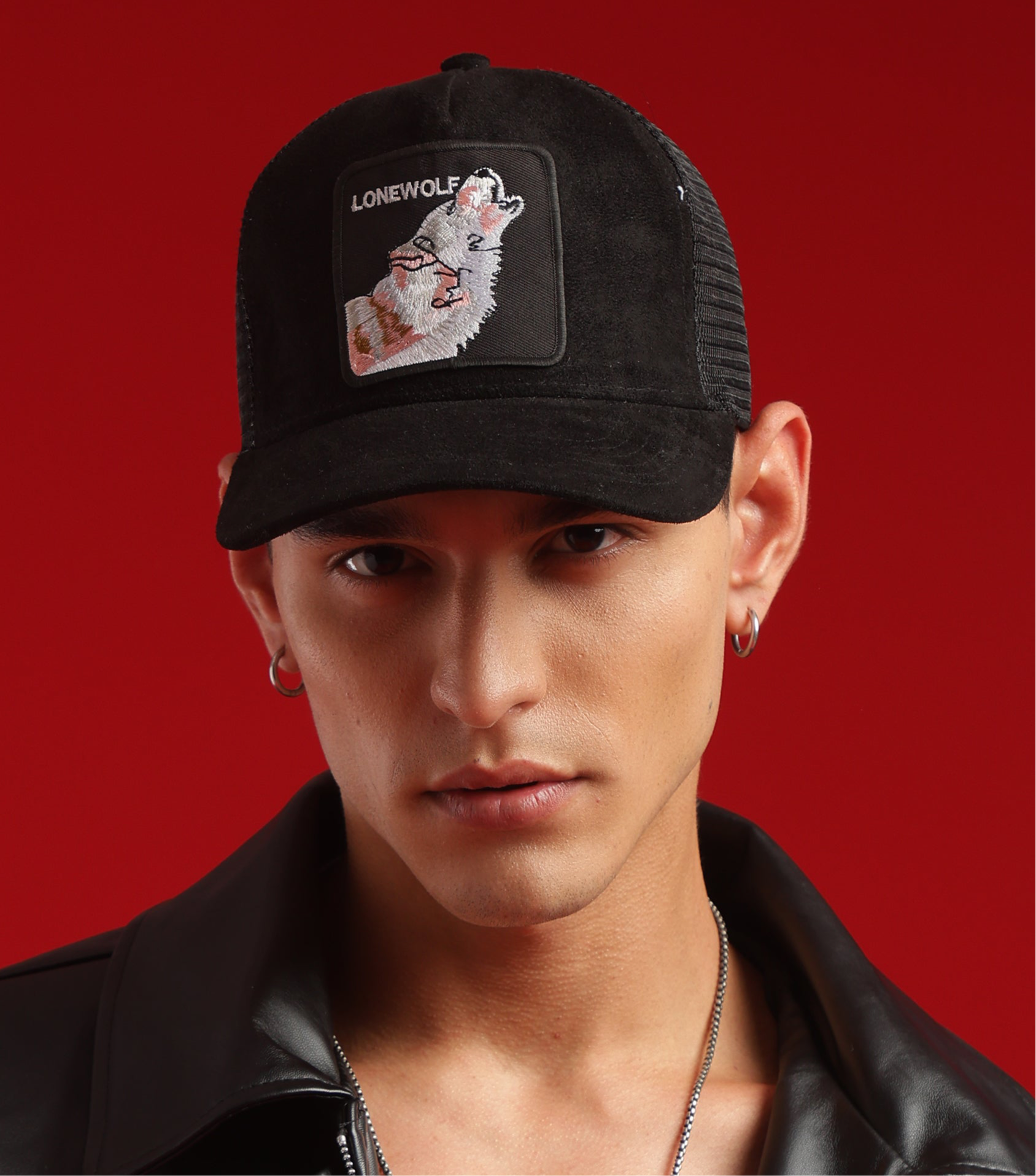 Suede Trucker Cap with Lone Wolf patch Embroidery Patch. This 5 panel A shape gives a stylish fit. This makes it a go to pick for any casual outing.