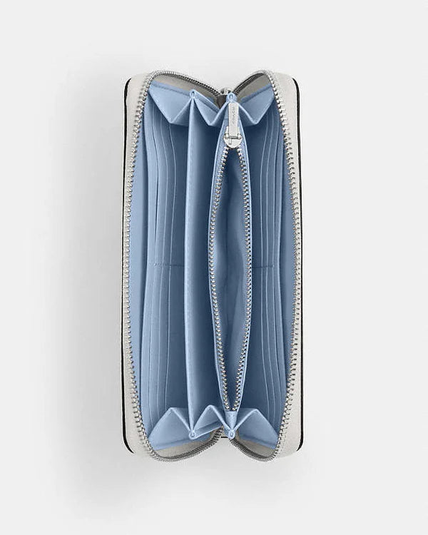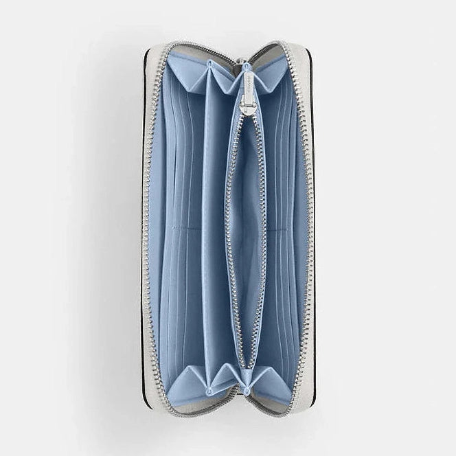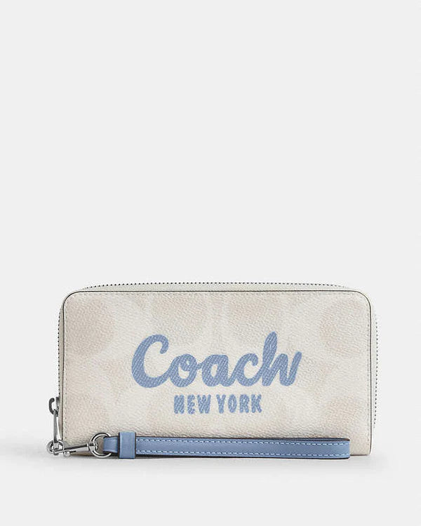 The Coach Long Zip Around Wallet in Signature Canvas features a distinctive graphic print in a stylish chalk and bluebell color palette. Crafted with durable signature canvas, this wallet offers organized storage with multiple card slots, a zippered coin compartment, and ample room for bills. Its secure zip-around closure ensures your essentials stay protected, combining functionality with iconic Coach design for everyday use.