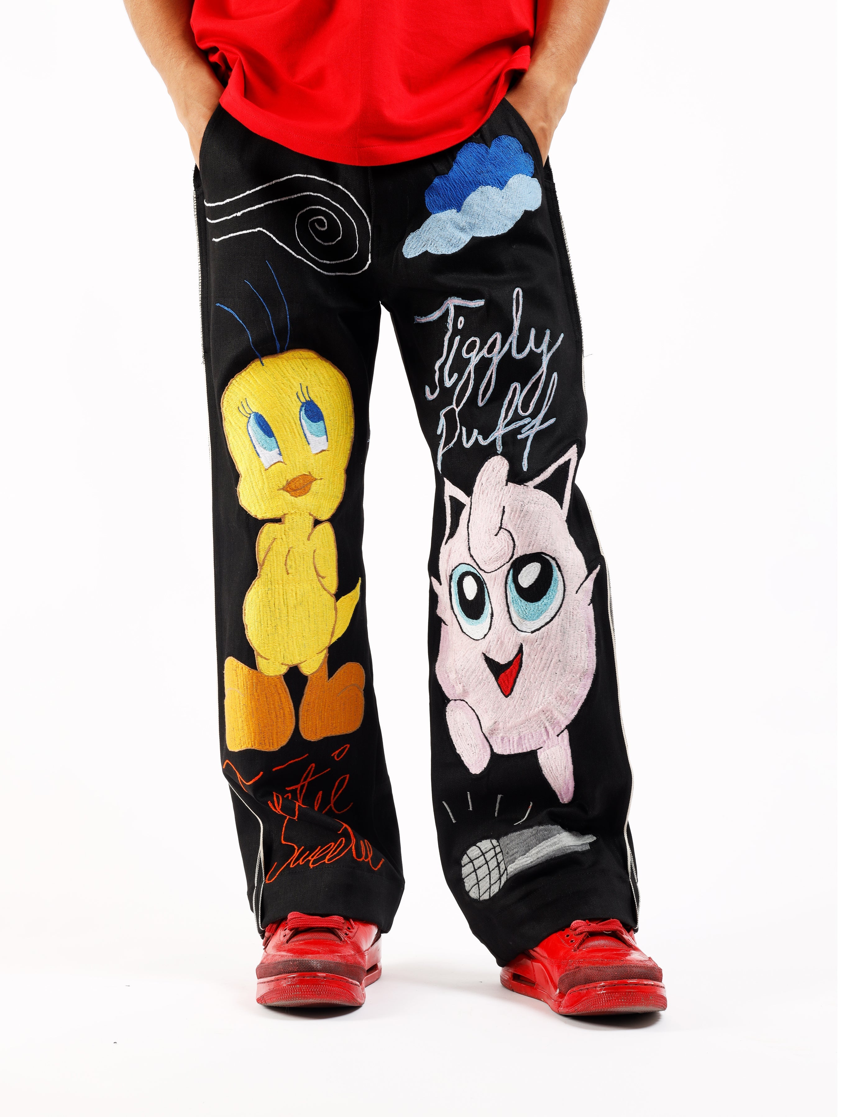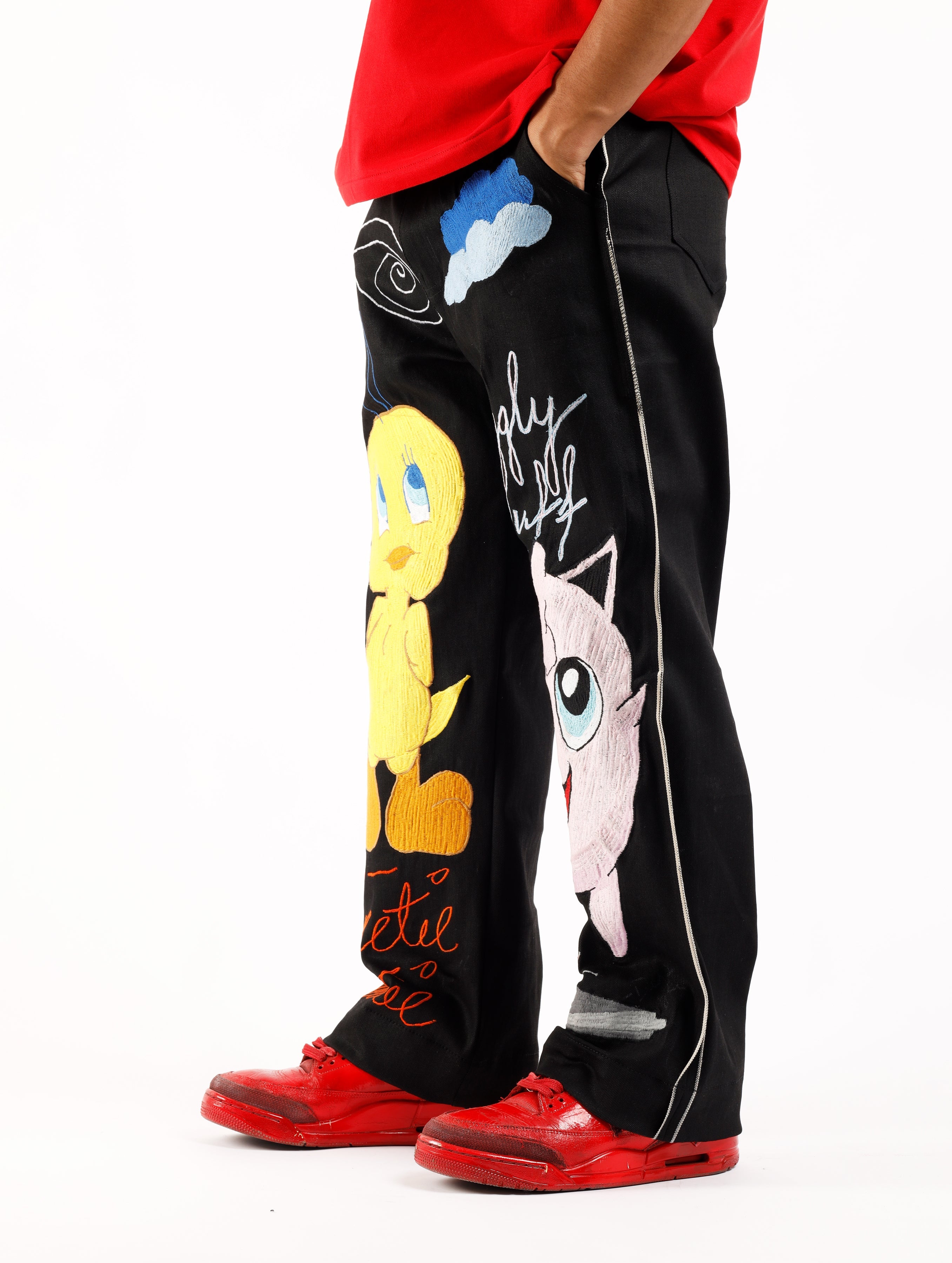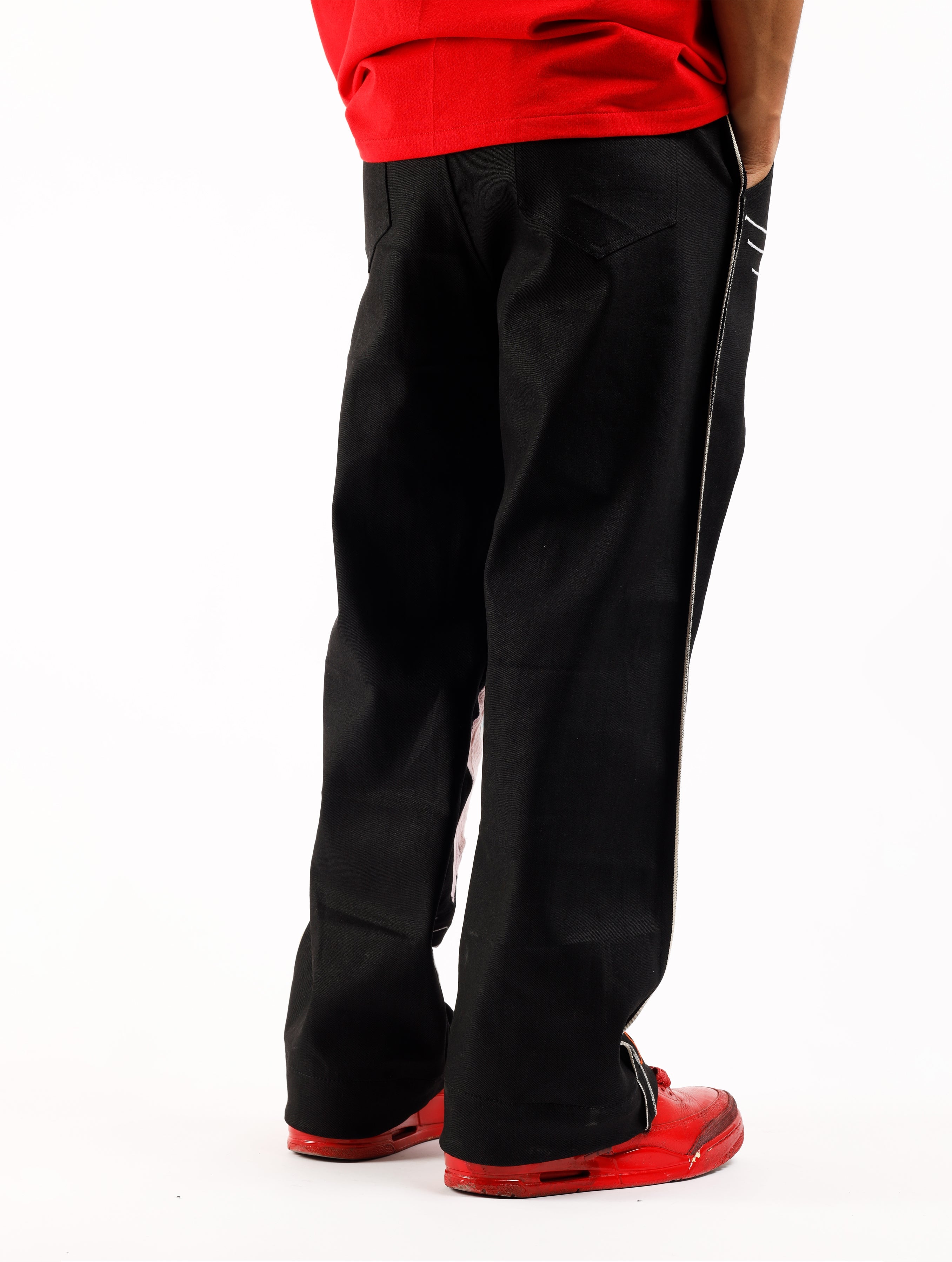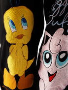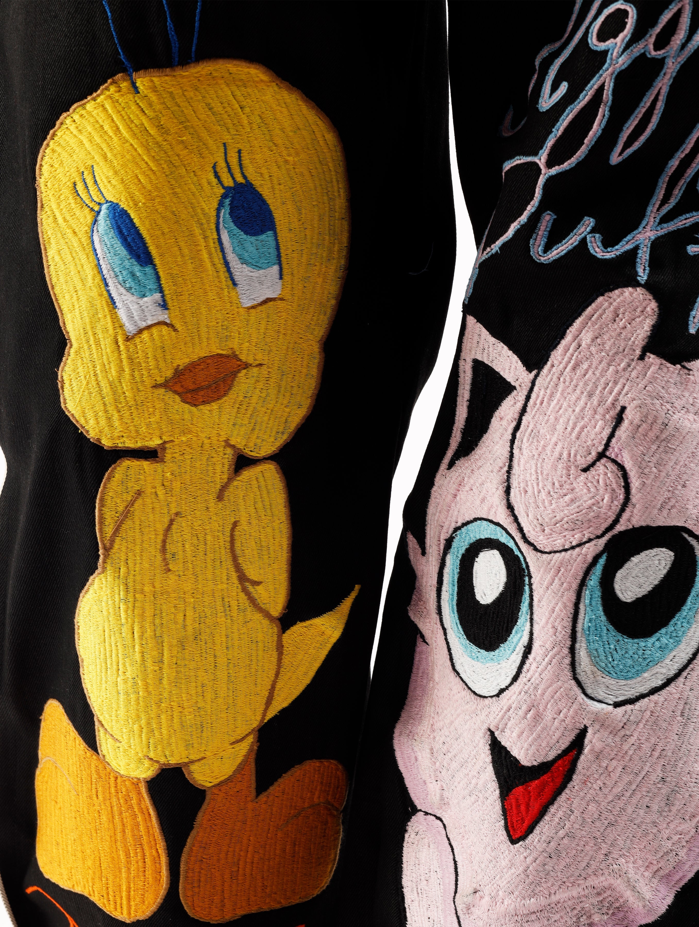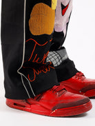 Retro cartoon inspired artwork on black selvedge denim