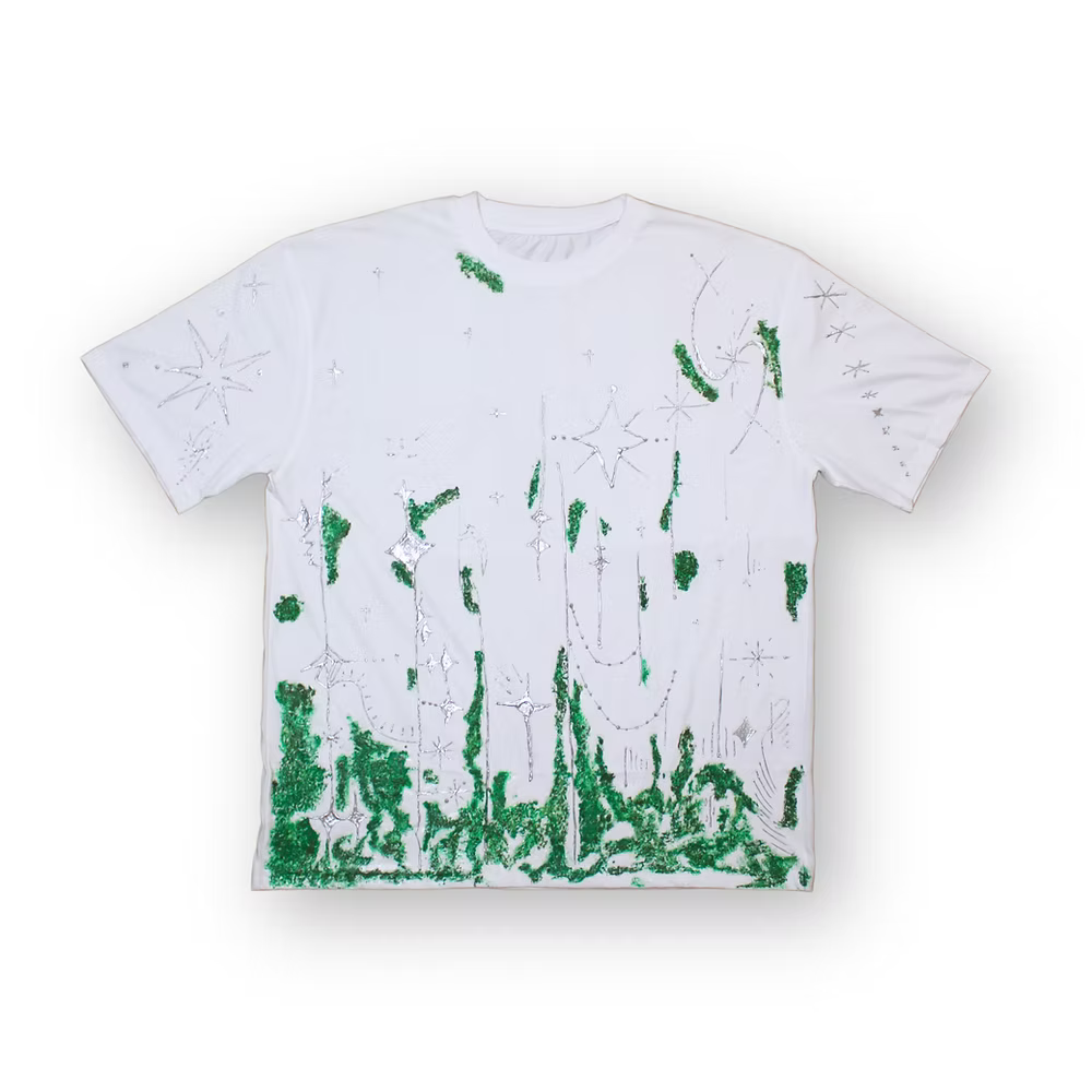 Envision yourself donning the pristine white t-shirt, its surface a canvas of mysteries and wonders. Here, amidst the intricate patterns crafted with glue and painted in shimmering silver, lies the silhouette of a futuristic city, its towering spires reaching towards the heavens. But look closer, and you'll see nature's relentless advance, reclaiming the cityscape with tendrils of lush greenery, reclaiming what was once lost to progress.