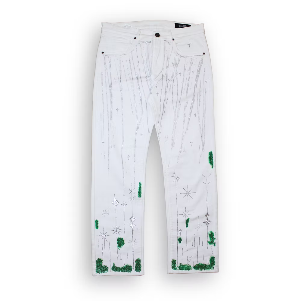 Yet, it's on the matching white denim jeans that the true narrative unfurls. Silver streaks cascade down like torrents of rain, a harbinger of destruction unleashed upon the metropolis. The once-mighty structures crumble before the onslaught, their reflections shimmering in the metallic downpour, a testament to the fragility of human ambition in the face of nature's inexorable power.