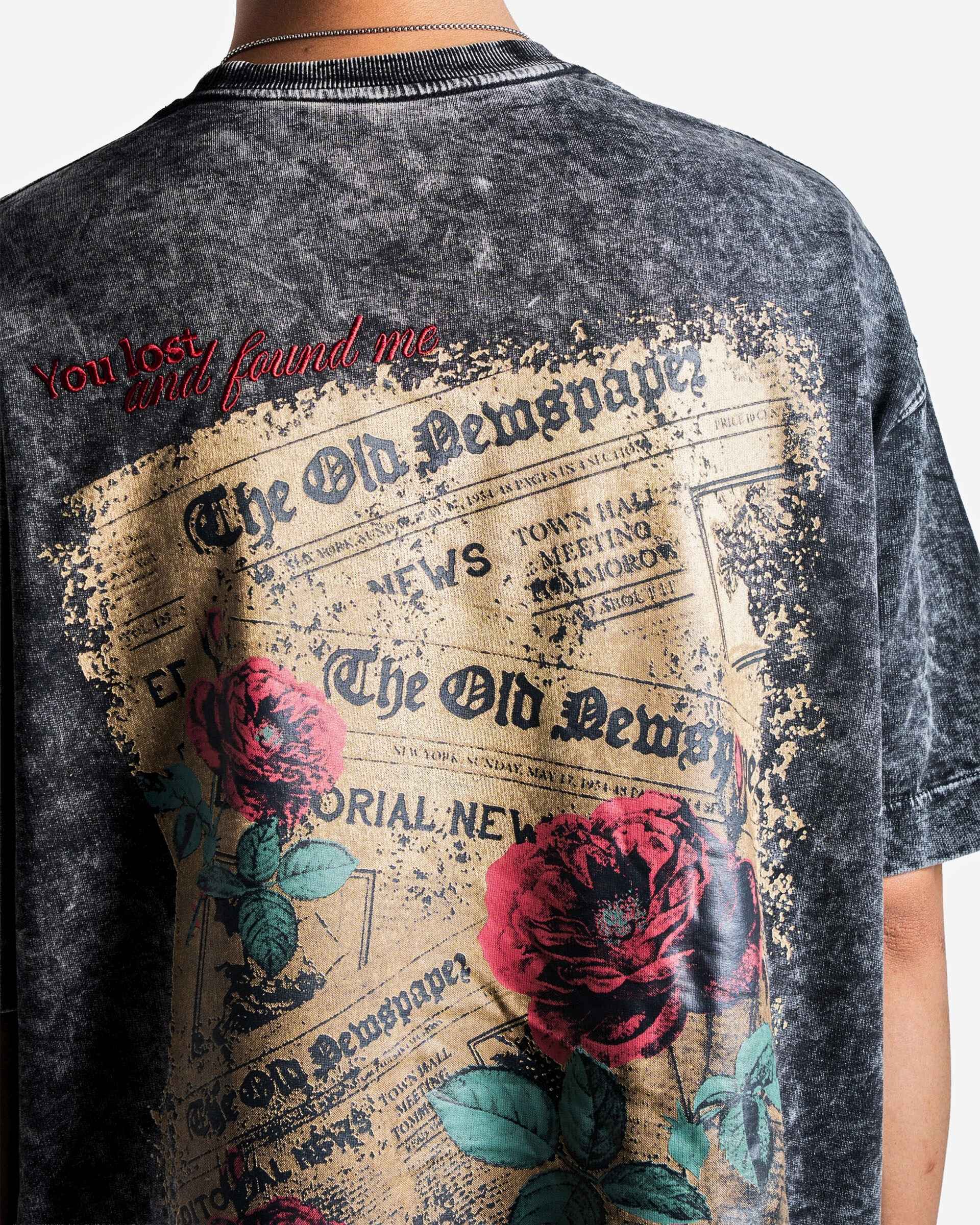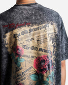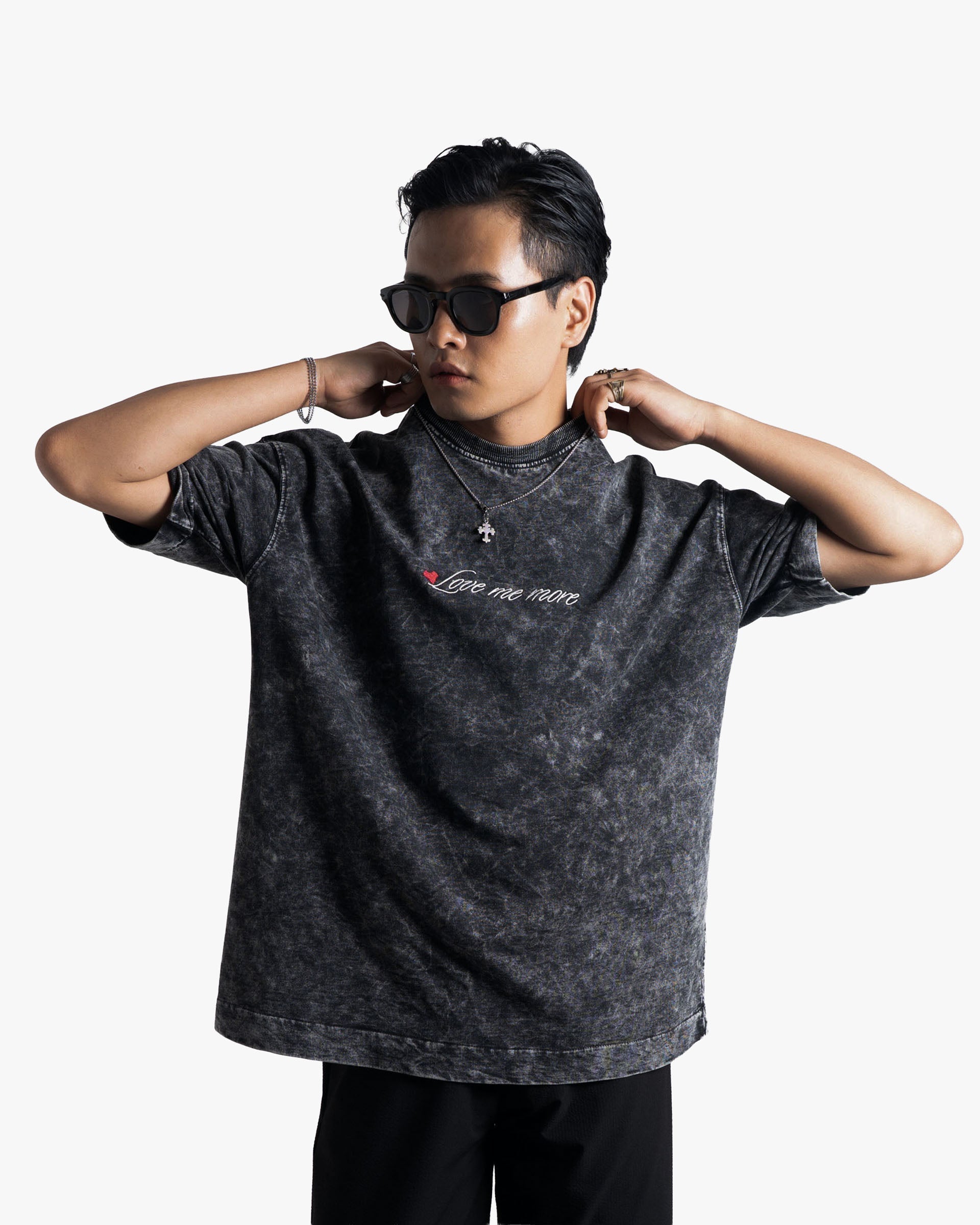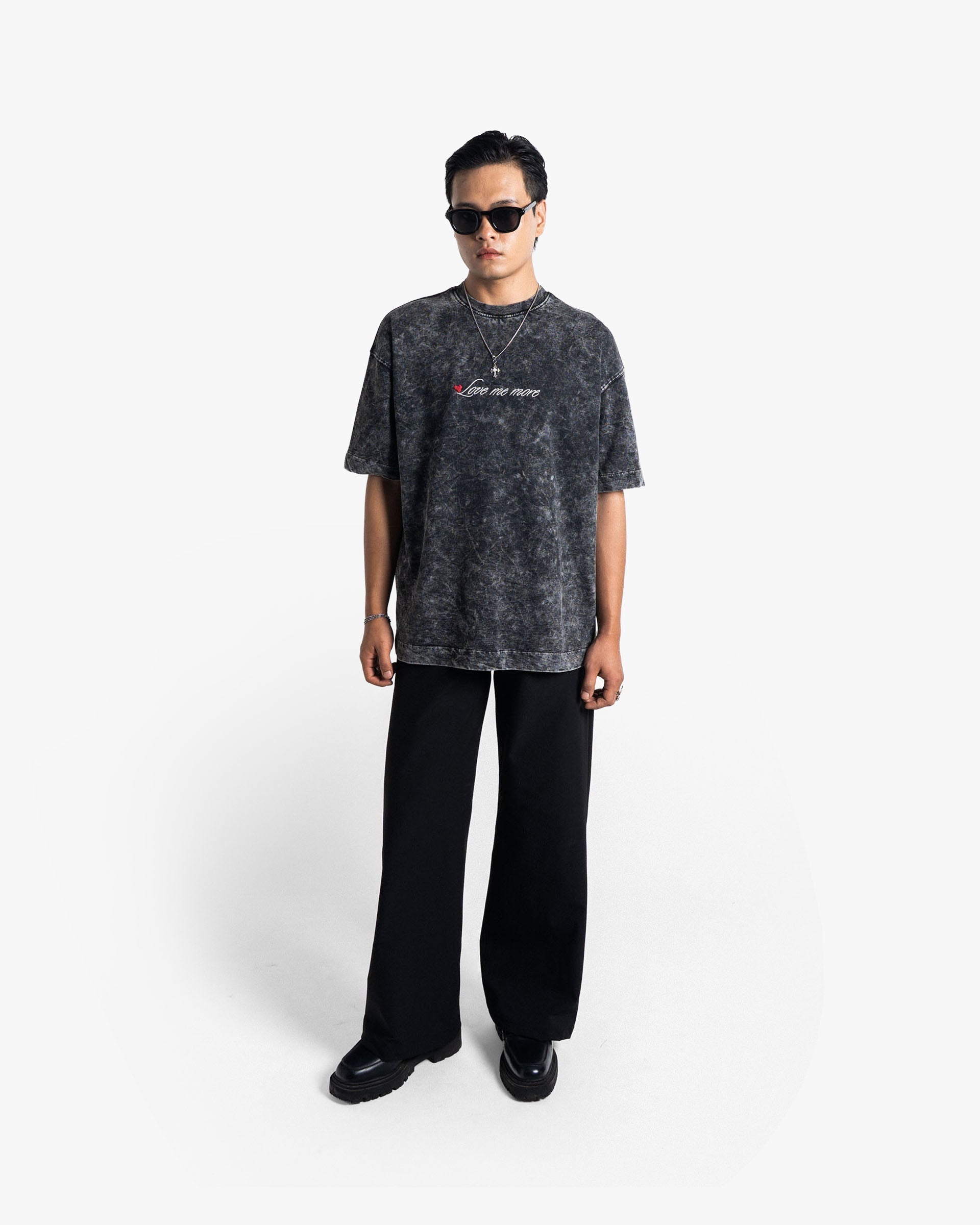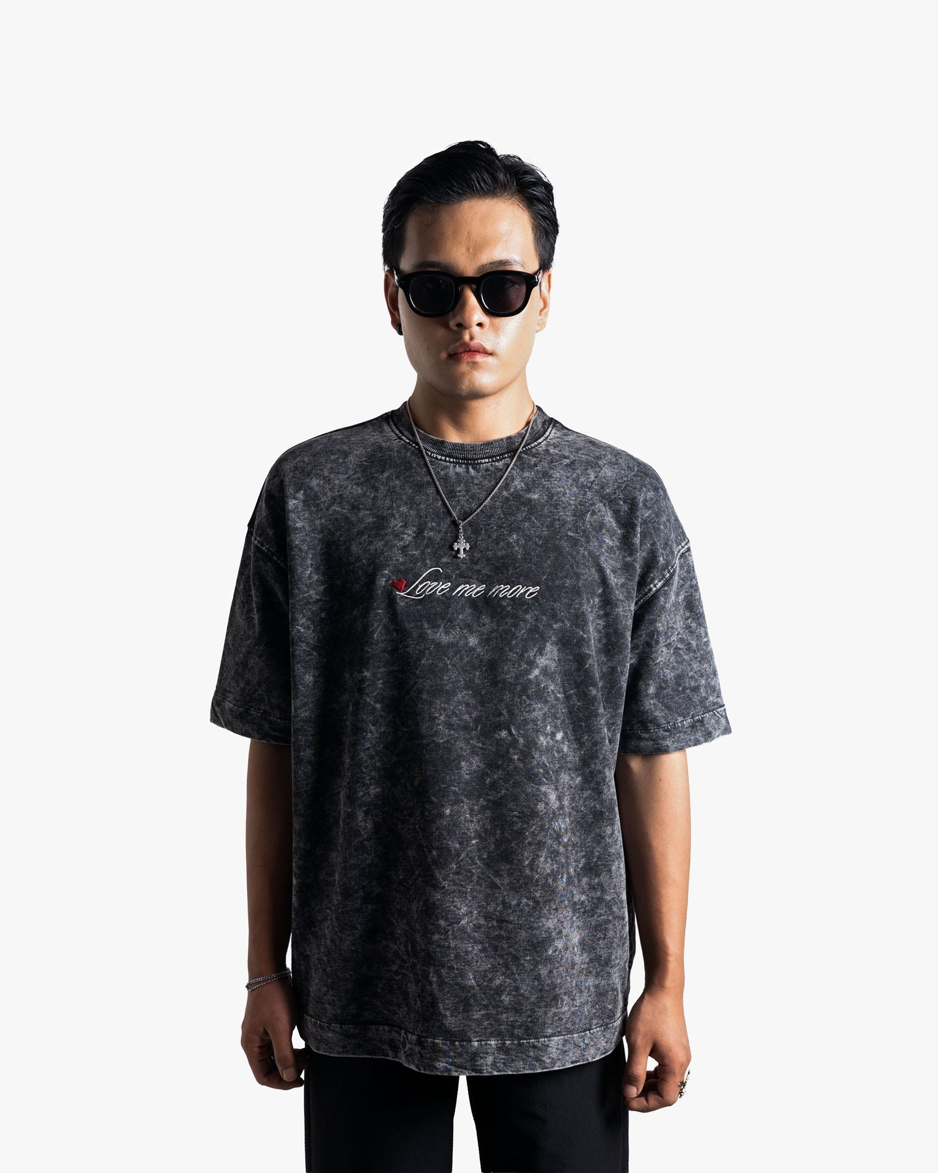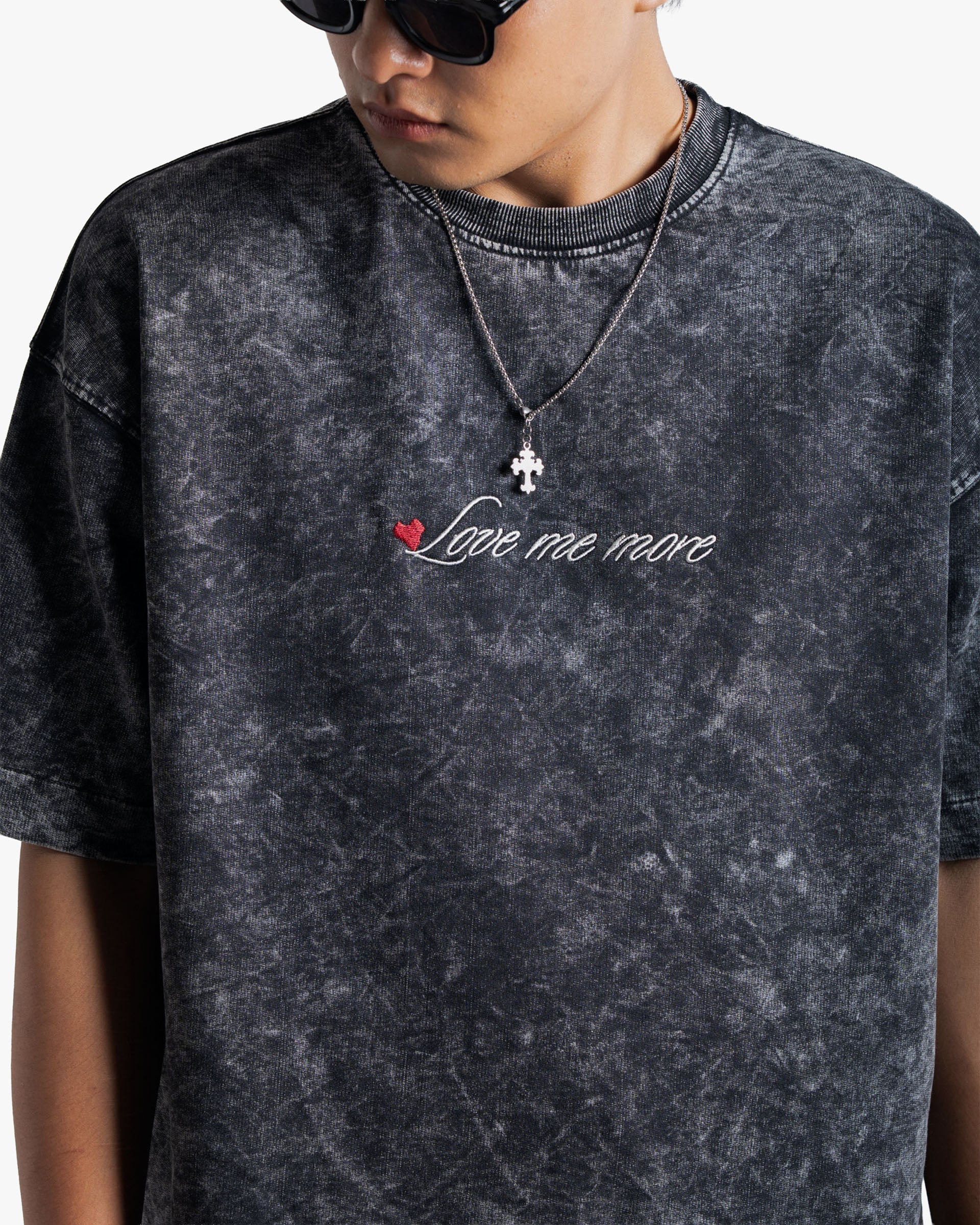 Featuring a delicate embroidered “Love me more” script, accented subtly with a heart detail, this tee balances gritty texture with understated elegance—the ideal graphic tee for expressive and effortless styling.
