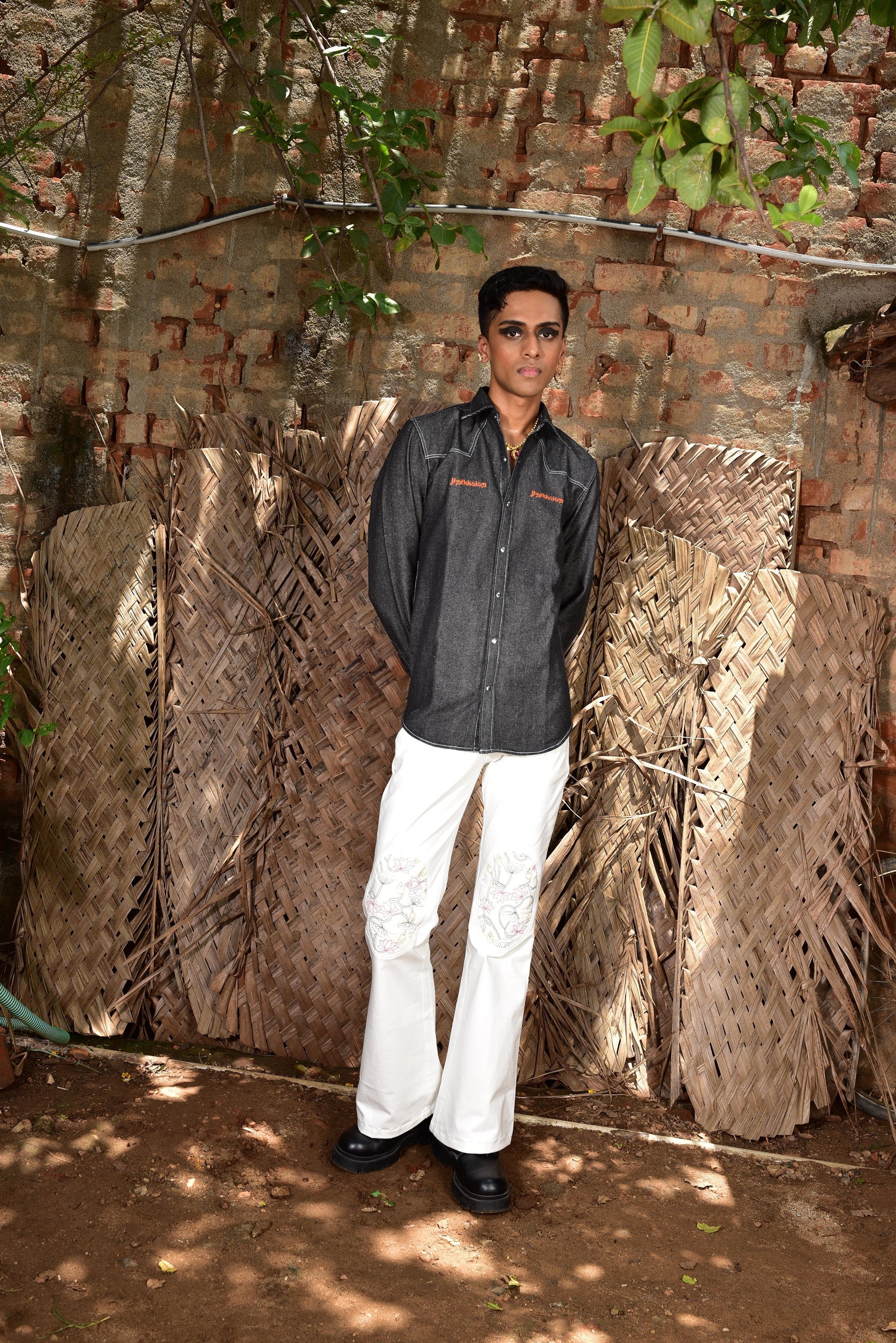 Inspired by the 70s, designed for today. "Lover Man" is our white twill fabric pants featuring fill-thread embroidered pockets. The pants also have unique appliqué knee design embroidered with minimal thread work on both the sides. The shape of the pants fits you so perfectly with Bootcut leg, a slim fit from the waist to the thigh, with wide, flared hem. High waist with a zipper and button.