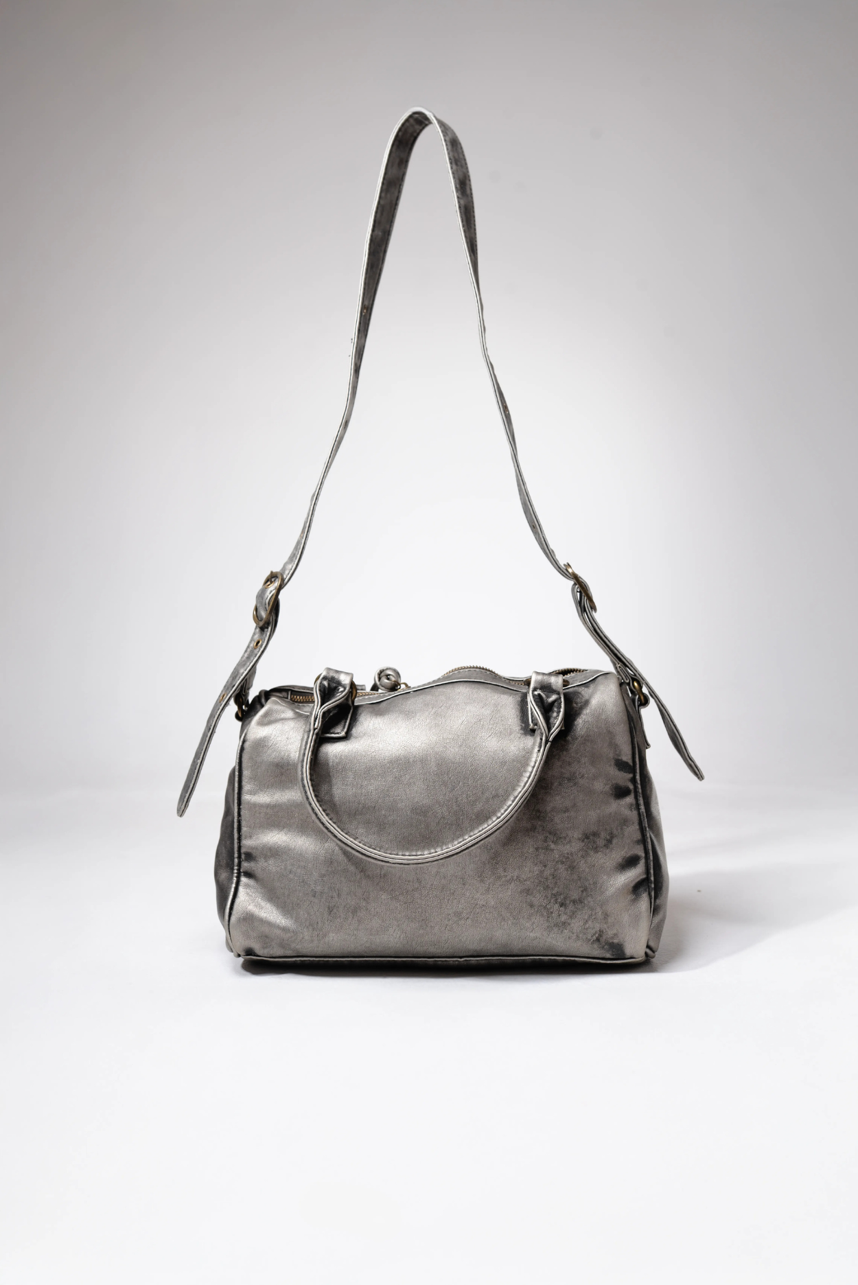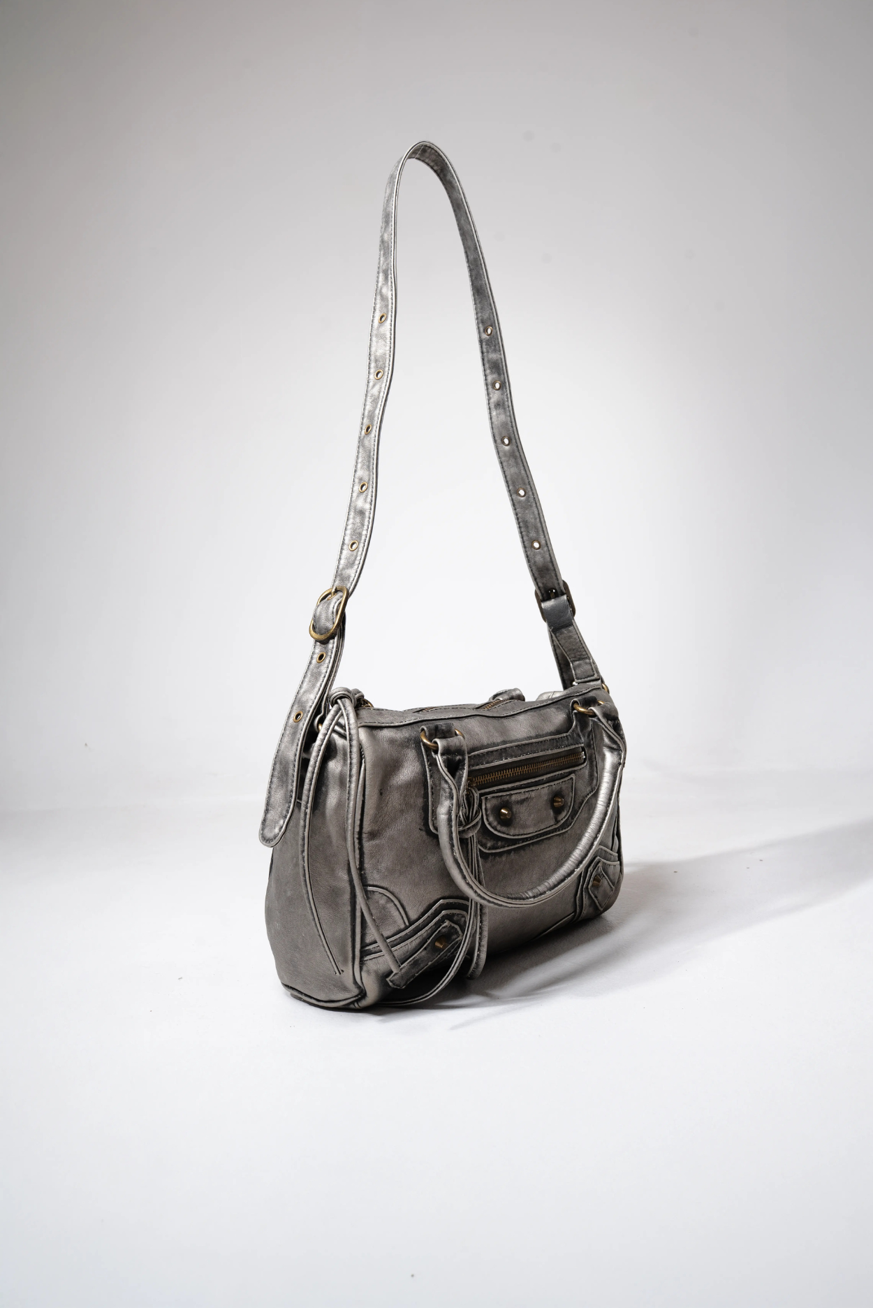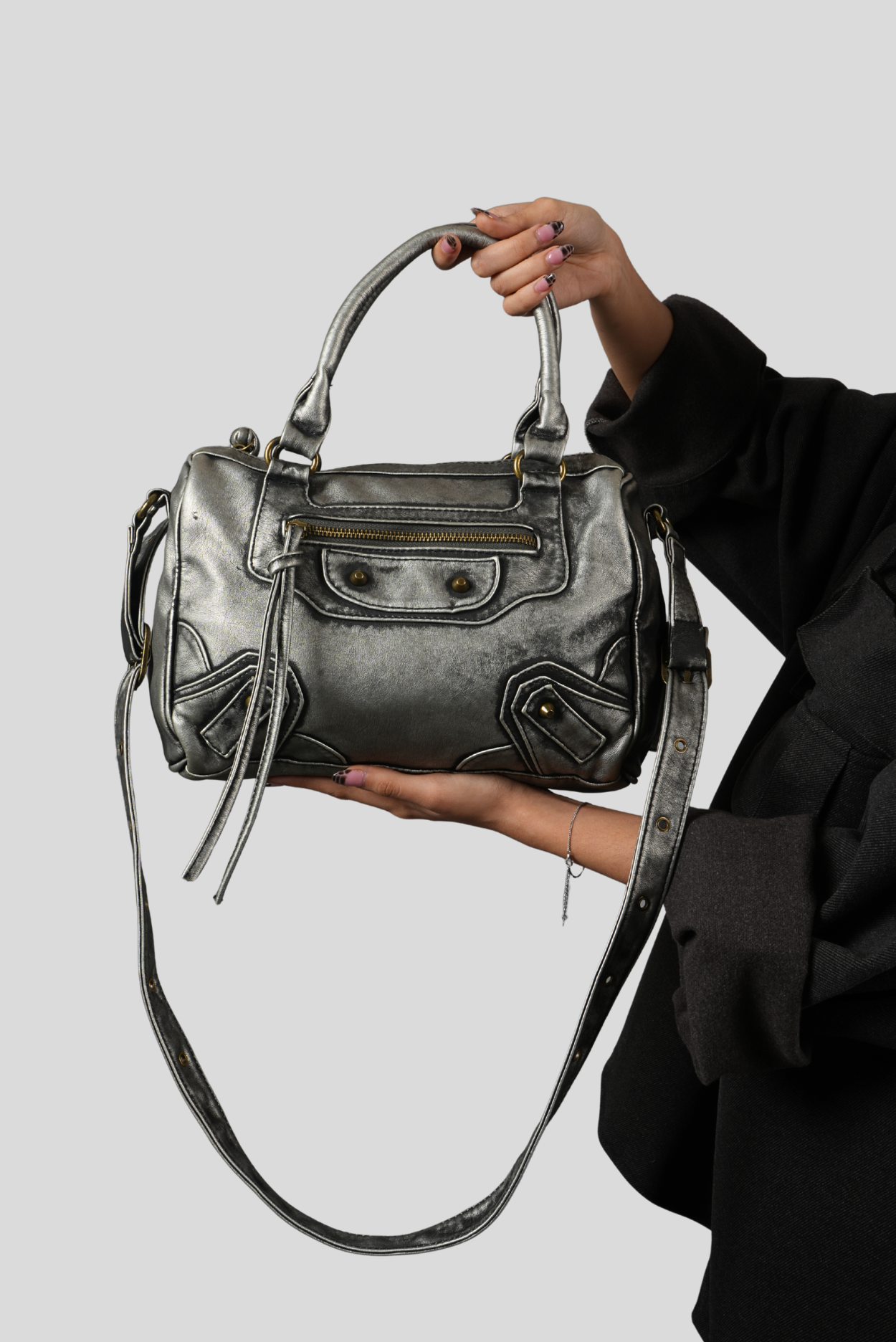 The MANACA Steelpulse Bag is built like a weapon for the streets—metallic, raw, and unapologetically bold. Its distressed silver finish and studded accents give it a gritty, armored presence, while the compact silhouette keeps it functional for everyday chaos. With dual handles and an adjustable strap, Steelpulse adapts to your rhythm—carry it on the shoulder or in-hand for a sharper edge. Rugged, versatile, and futuristic, this bag hits like steel and moves like pulse.