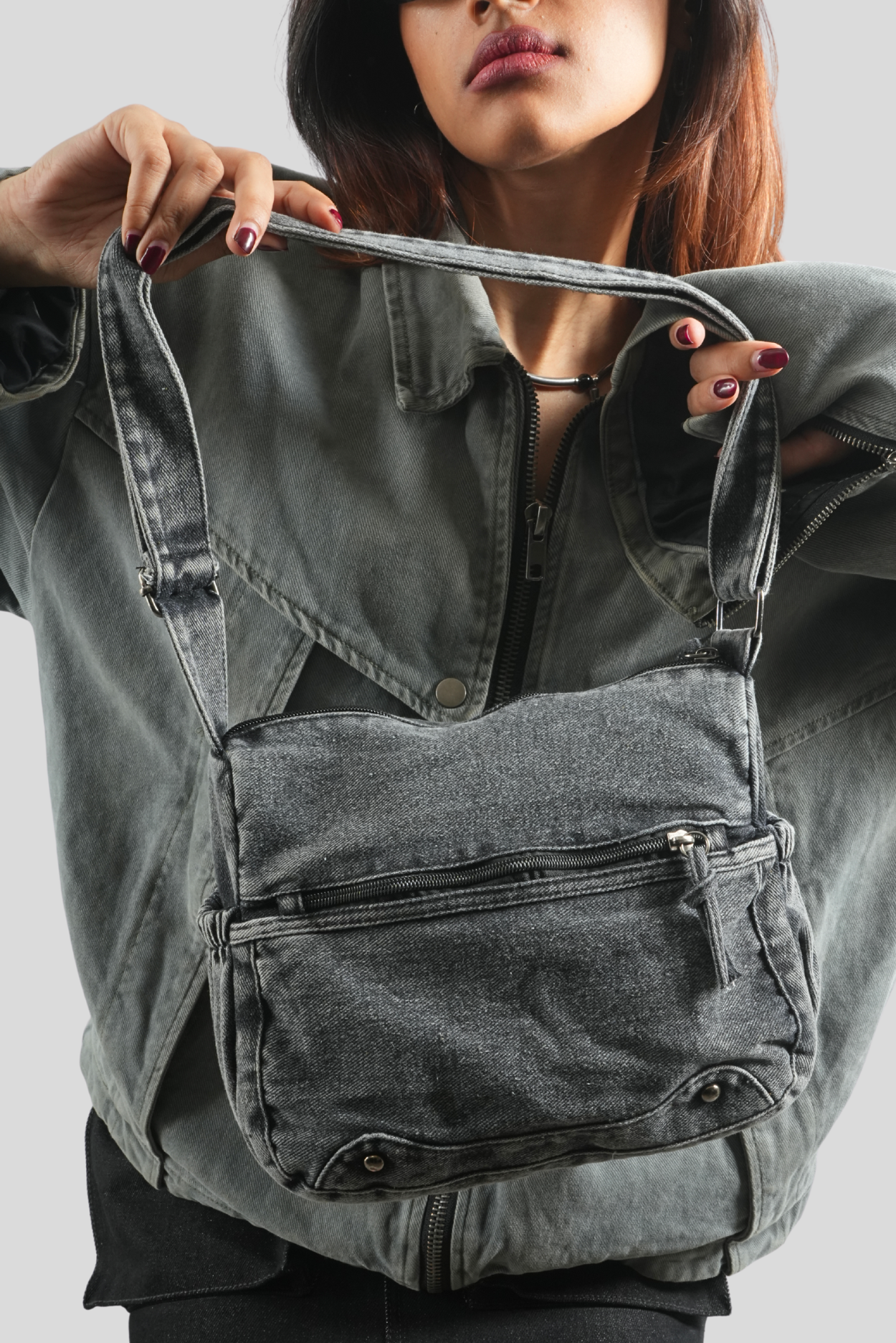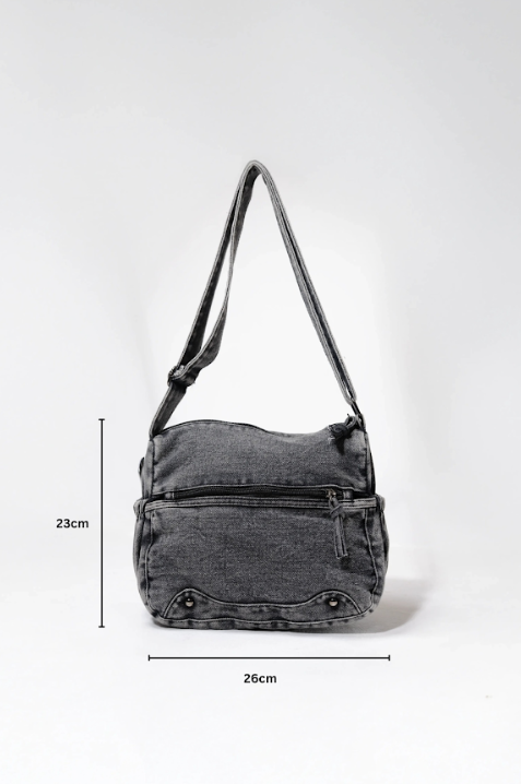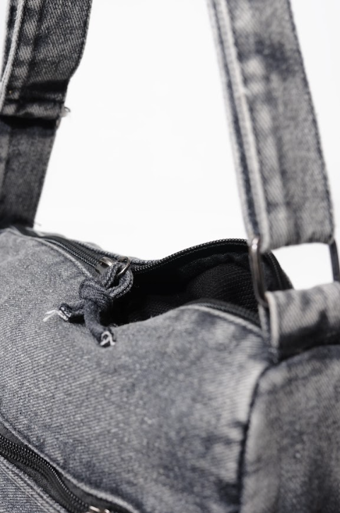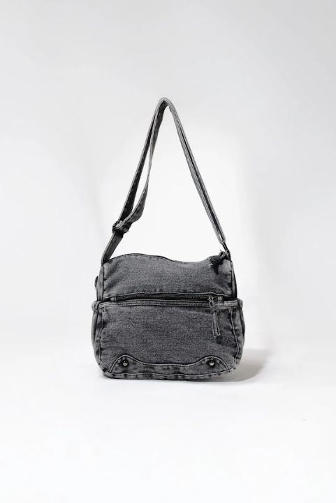 Built to match your grind. The MANACA Venom Drip Bag channels a washed-out noir aesthetic with street-soaked functionality. Crafted in a rugged black denim build, this bag features a prominent zip pocket layered with knotted rope pulls, finished with a curved panel detailed with heavy-duty rivets that elevate the aggression. The single-strap format allows you to sling it and dip, while the curved volume gives it a tough but clean silhouette — smooth enough for the city, raw enough for the underground.