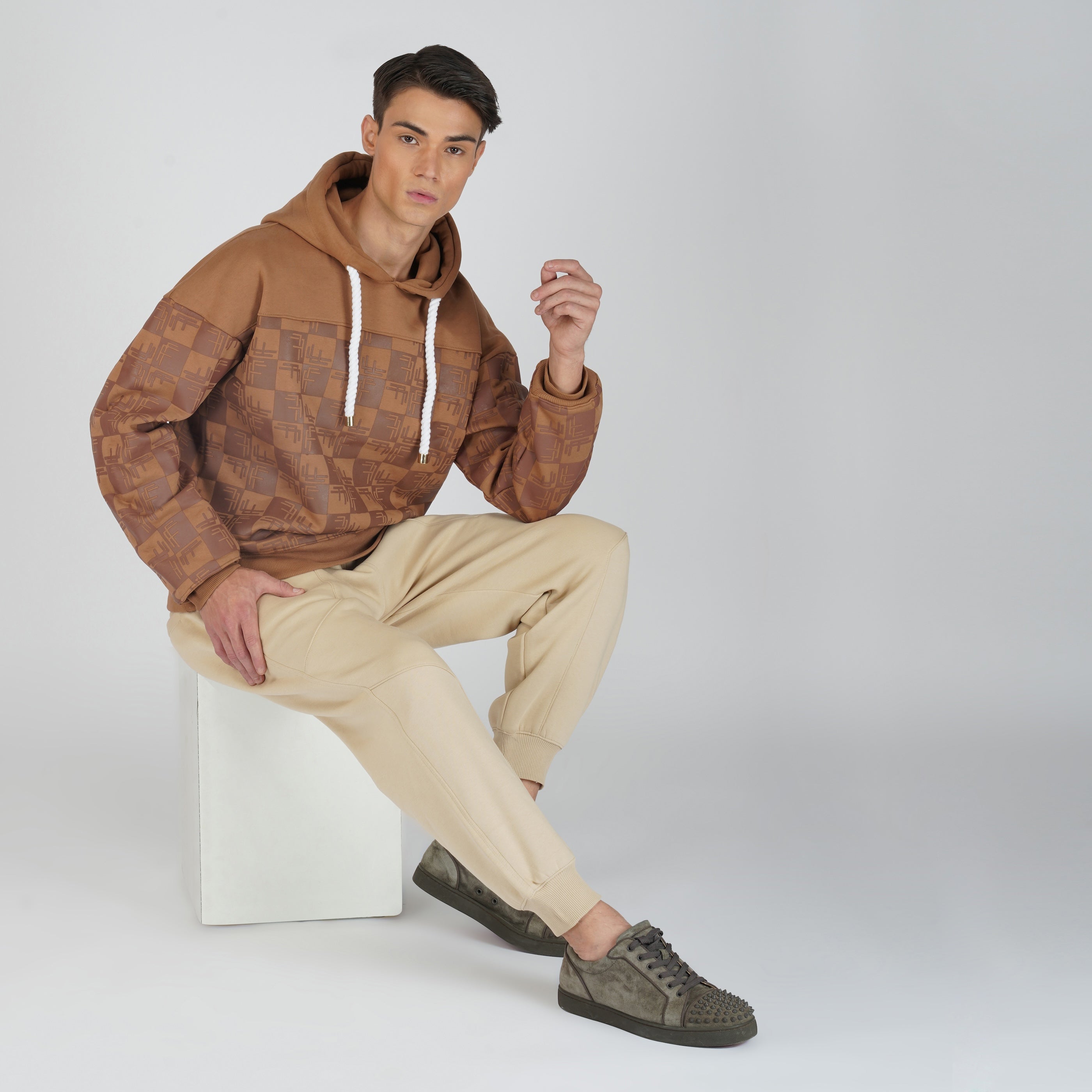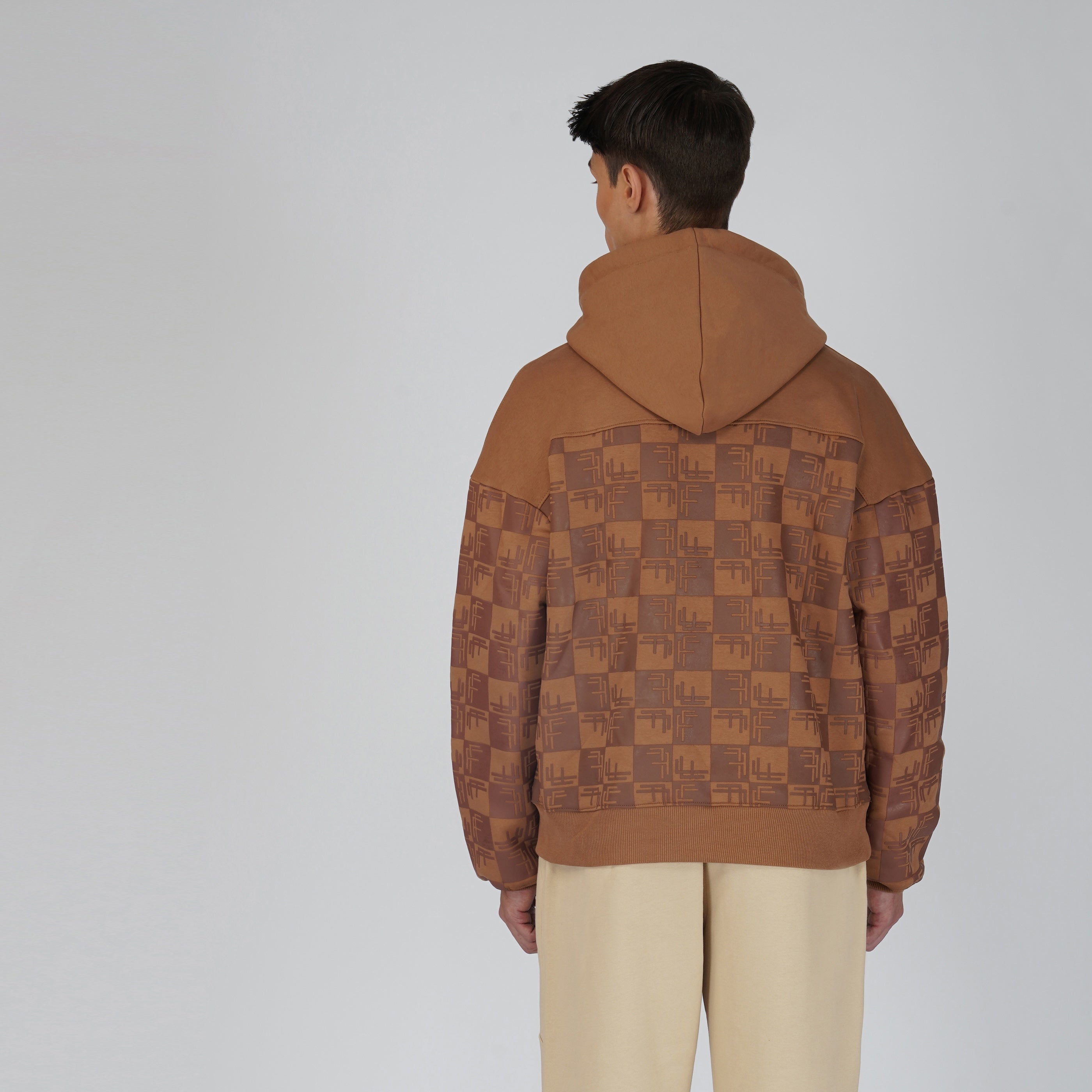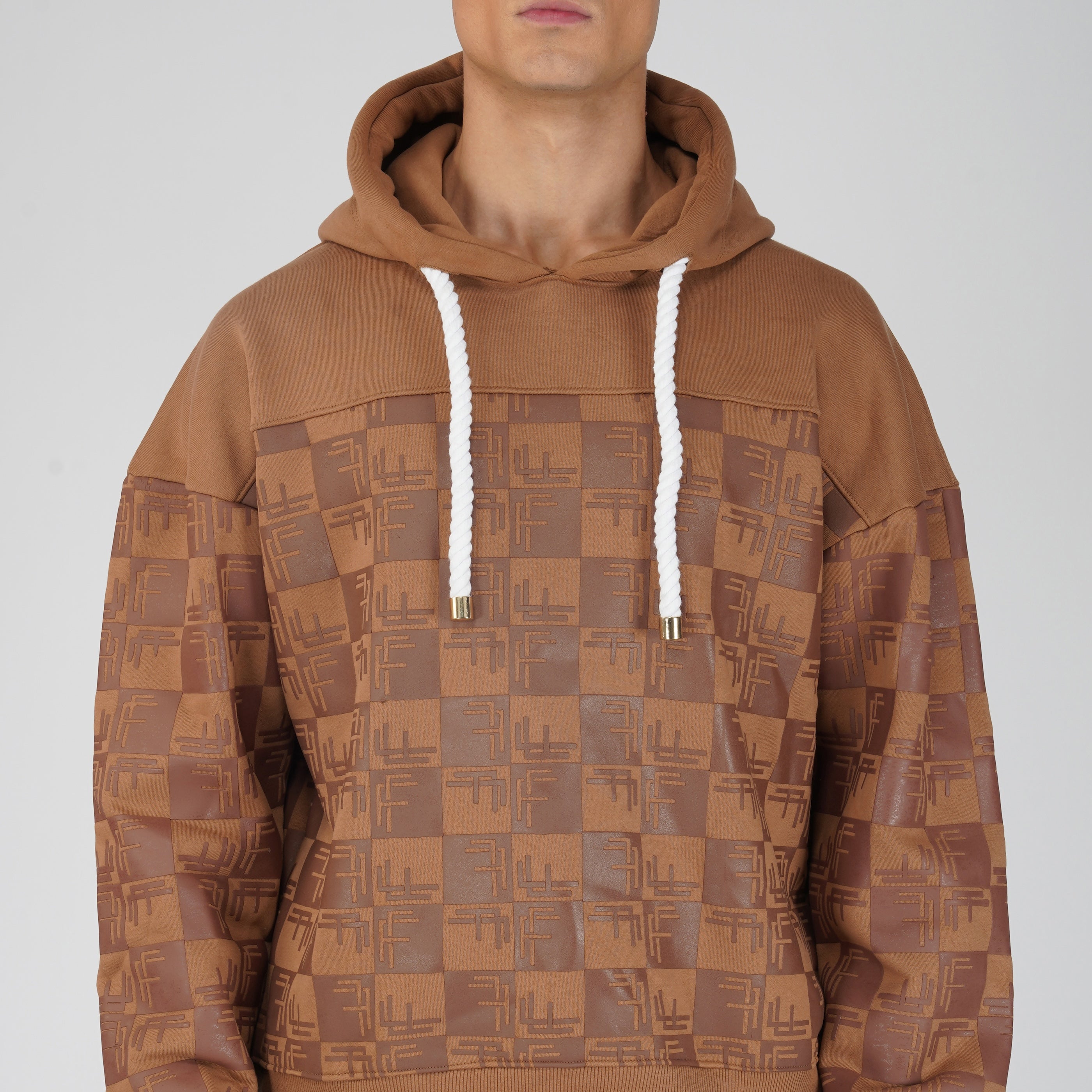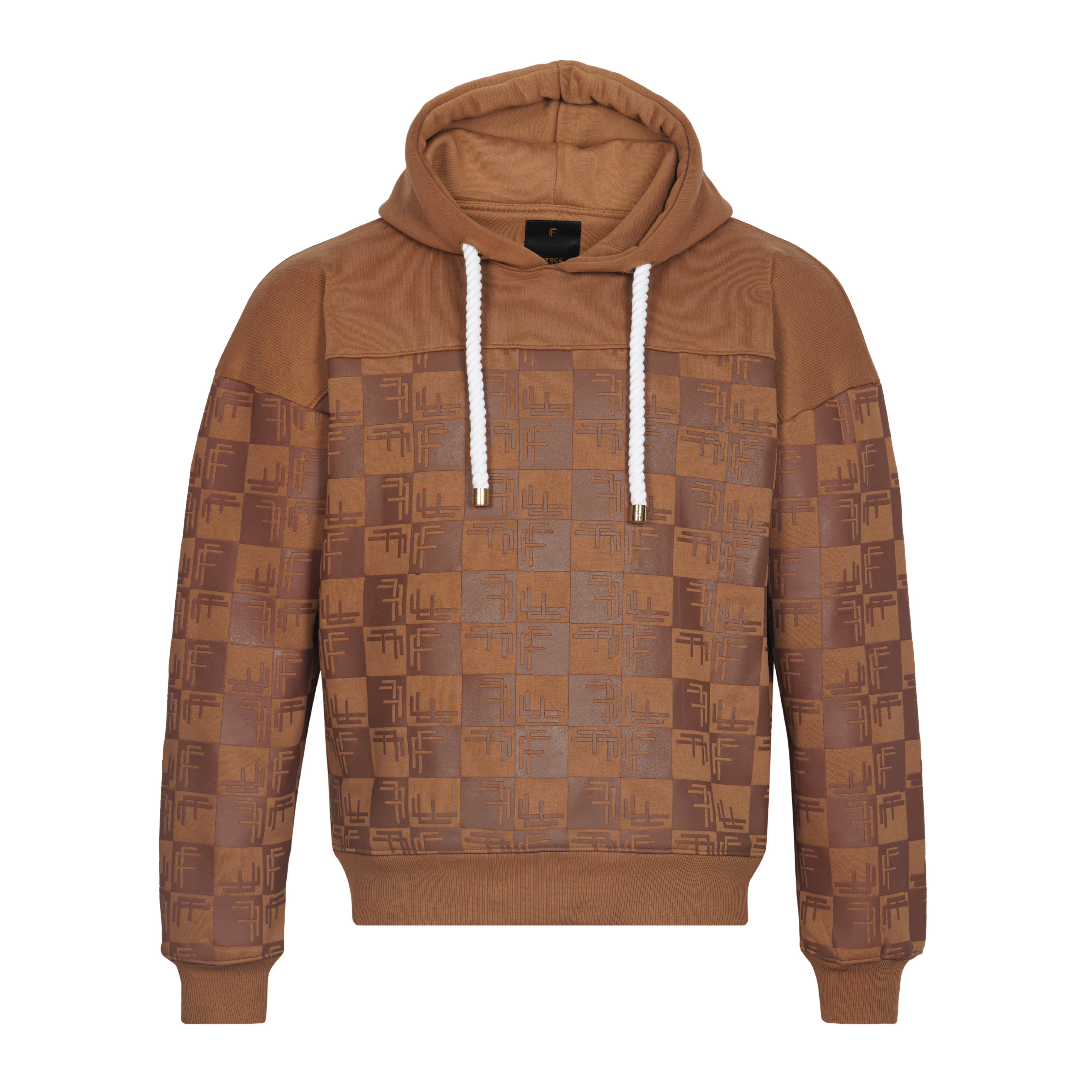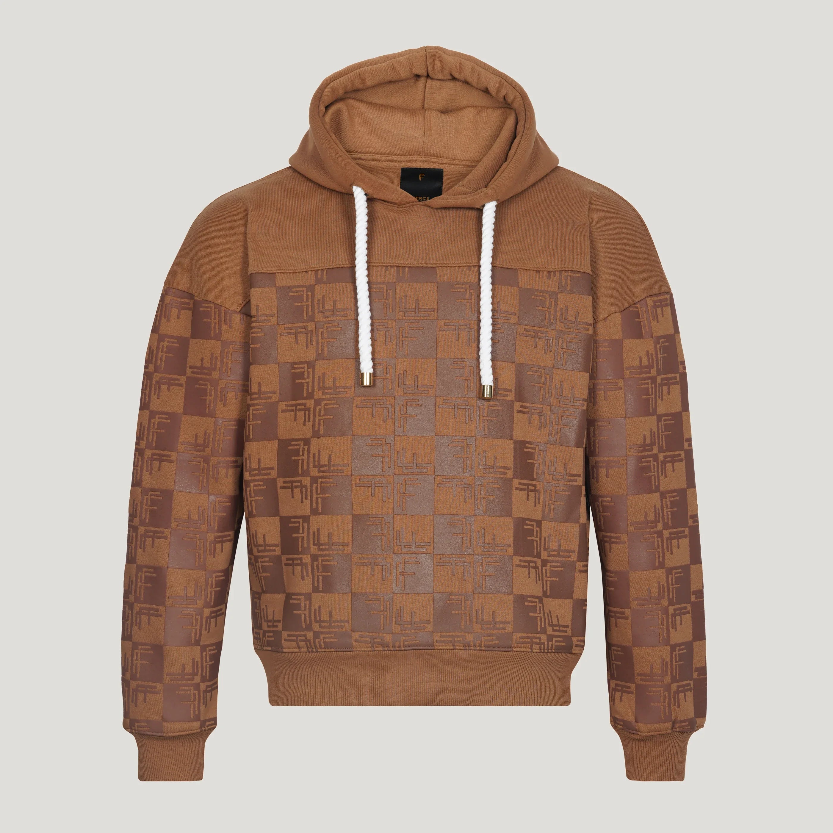 This smart pecan brown hoodie features the Mayfair Matrix in a dark leather-like print. It is crafted from heavyweight cotton blend fabric with luxurious fleece on the inside. It features the iconic Regent’s Cord in white with Gold metallic detailing.