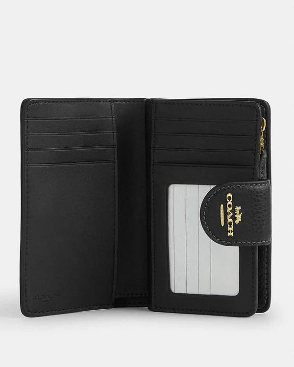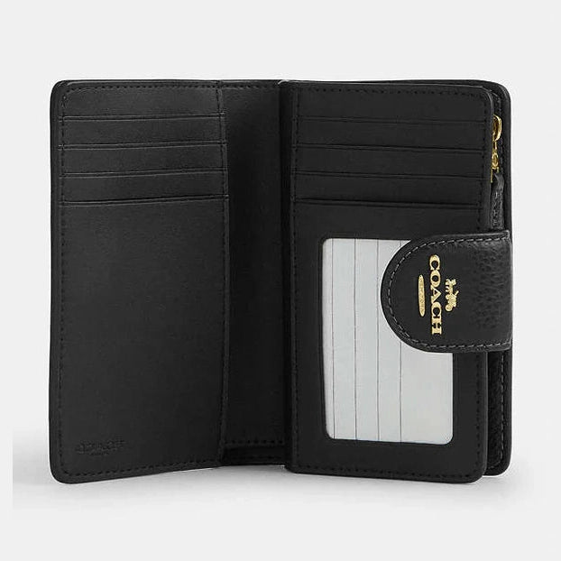 Add a touch of wild sophistication to your essentials with the Coach Medium Corner Zip Wallet in leopard print pebbled leather. Featuring a striking gold and leopard multi pattern, this wallet perfectly combines bold style with practical organization. The secure zip-around design keeps your cards and cash safe, making it an indispensable accessory for those who appreciate fashion and function.