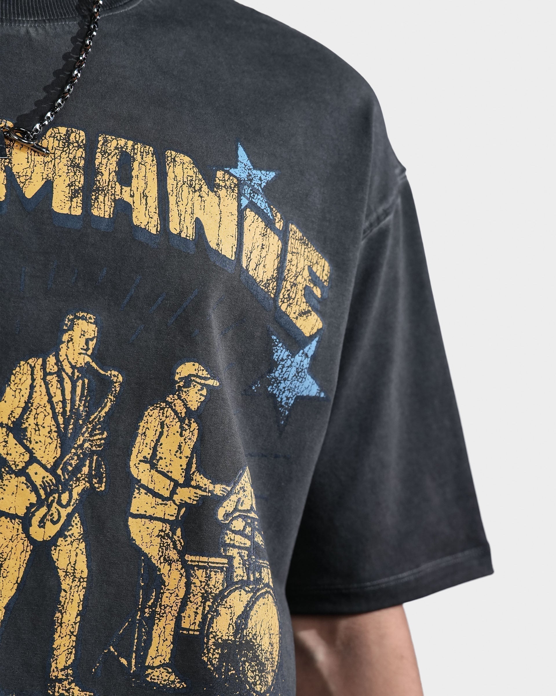 A tribute to timeless sound and rhythm, the Melomanic Tee captures the raw energy of live performances and the nostalgia of vintage band culture. Featuring bold retro artwork with a pigment-washed finish, it delivers a lived-in look that feels effortlessly authentic. Built from heavyweight cotton with added stretch, this piece balances comfort, durability, and street-ready styling.