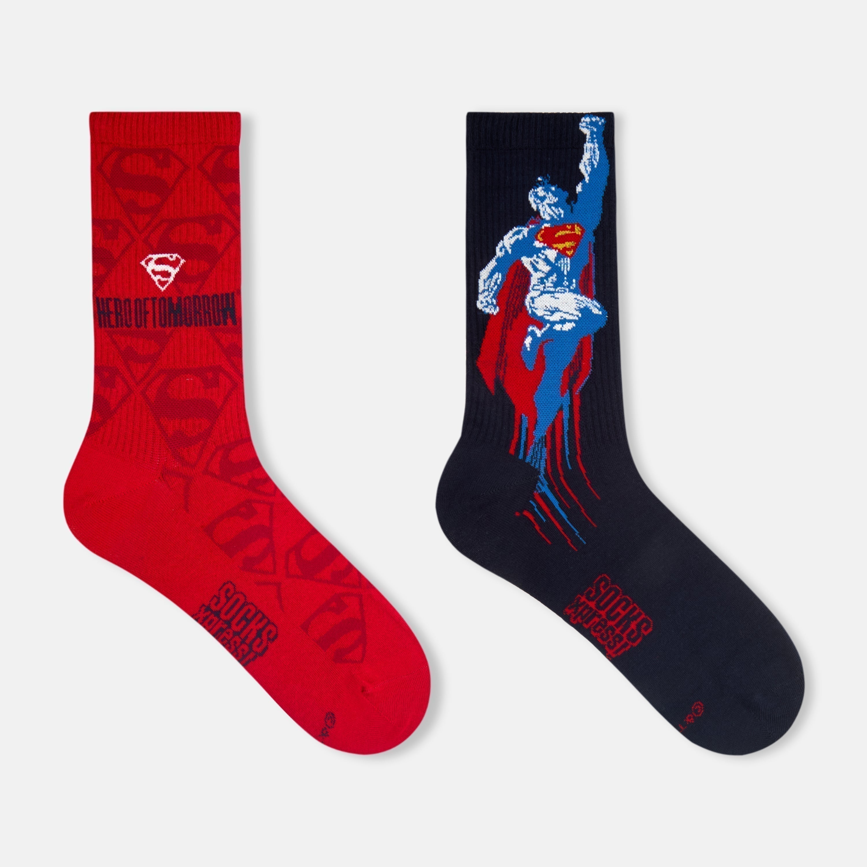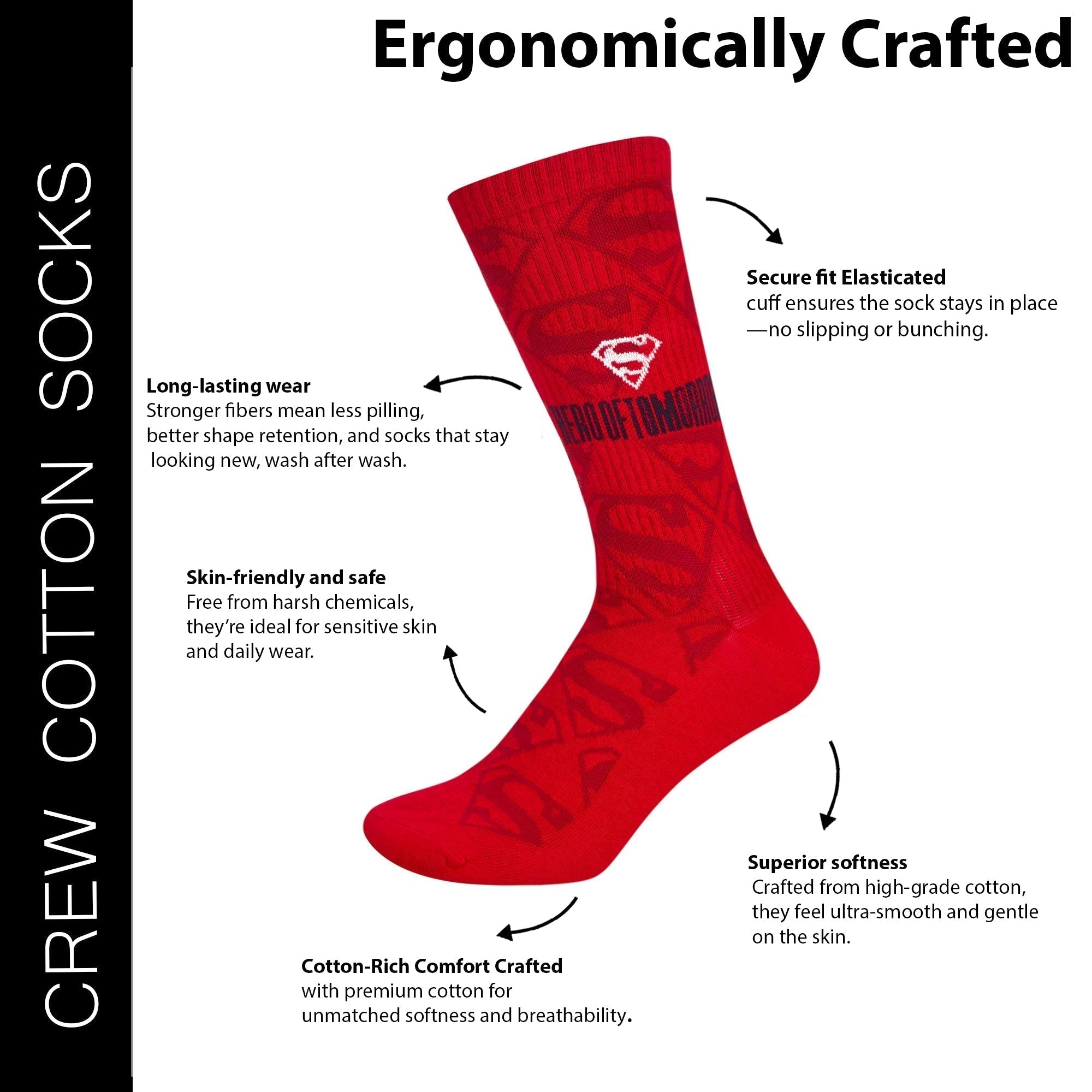 | Crafted from a premium blend of combed cotton, nylon, spandex, and elastic, these Superman Crew Socks deliver unparalleled comfort, stretch, and durability. Designed for those who want to channel the strength of the Man of Steel, these socks offer a superior fit for both action-packed days and laid-back moments. Whether you're taking on your workout, running errands, or proudly displaying your fandom, these socks provide the support and resilience you need, just like Superman facing any challenge. Step into confidence and power with these socks by your side. |