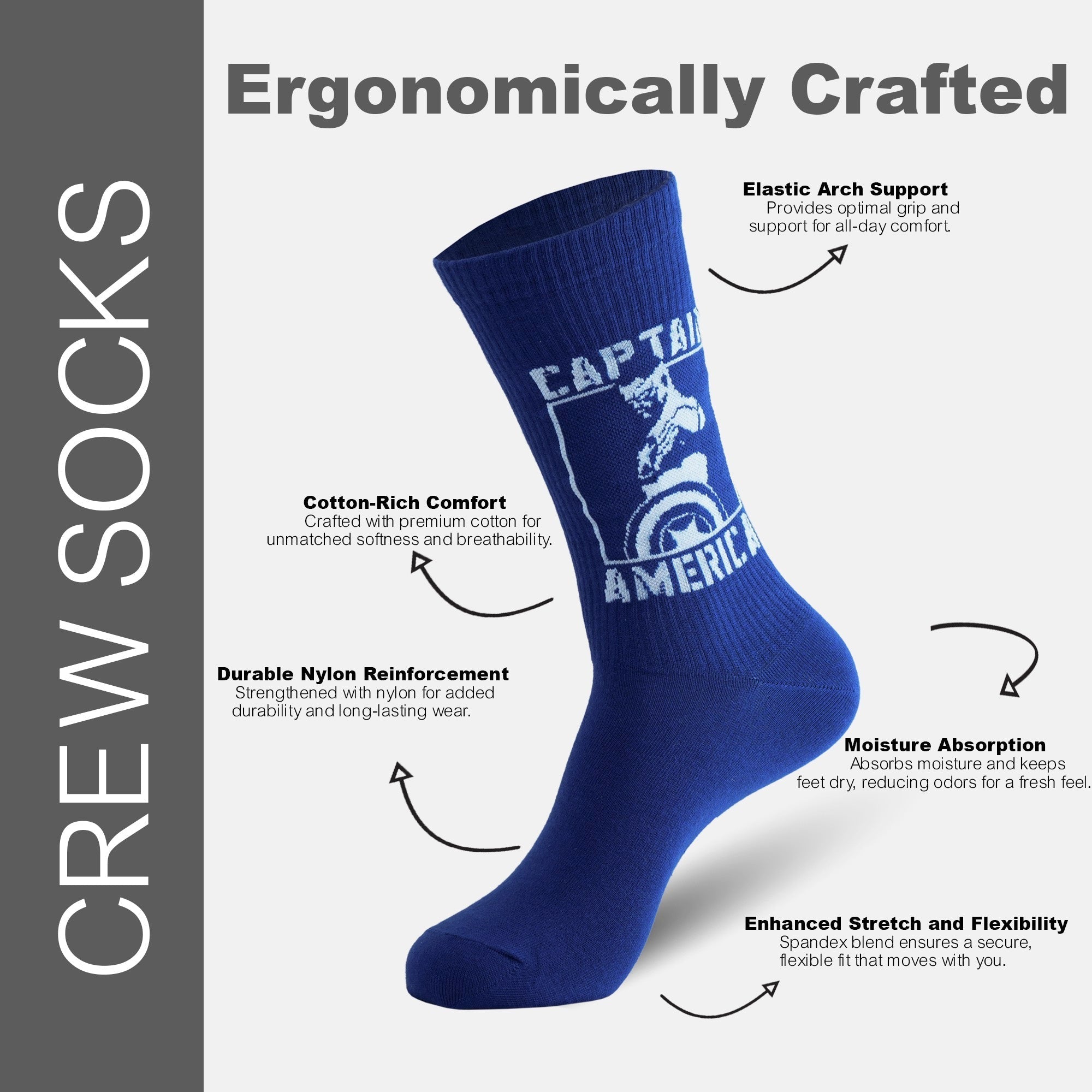 Power up your every step with the Special Edition Captain America Crew Socks, designed for true Marvel fans! Featuring bold, high-impact designs inspired by the First Avenger, these socks bring legendary strength, comfort, and style to your everyday wear. Crafted from premium combed cotton, nylon, spandex, and elastic, they offer superior breathability, stretch, and grip, making them perfect for workouts, casual wear, or assembling with fellow Marvel fans. Whether you're leading with courage like Steve Rogers or making a bold style statement, these socks are built to keep up with every mission. Step into action today!