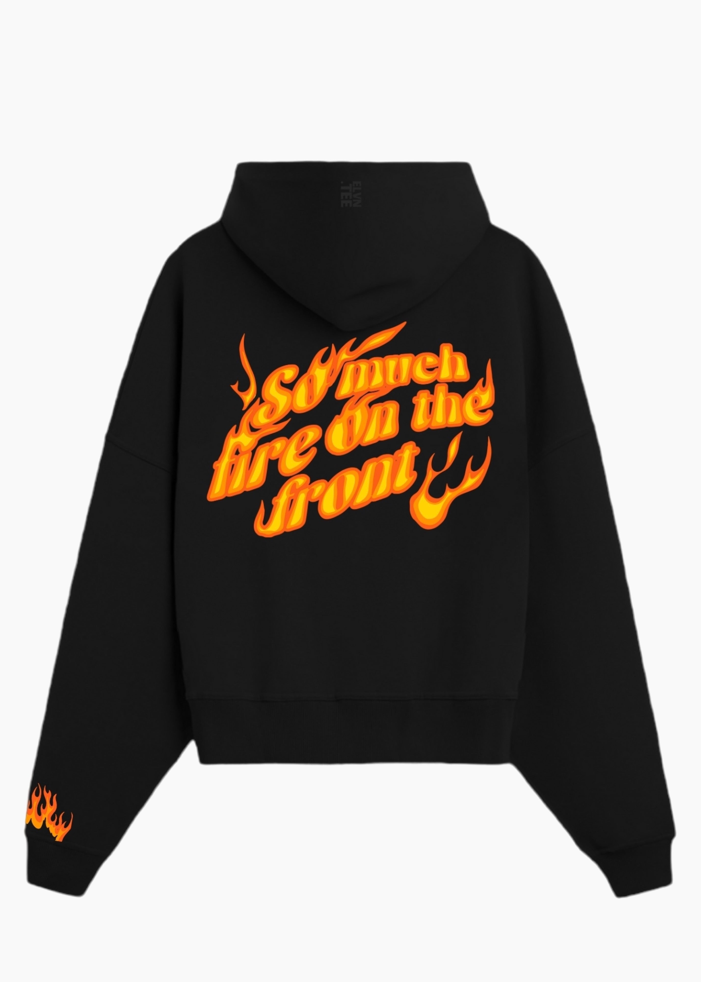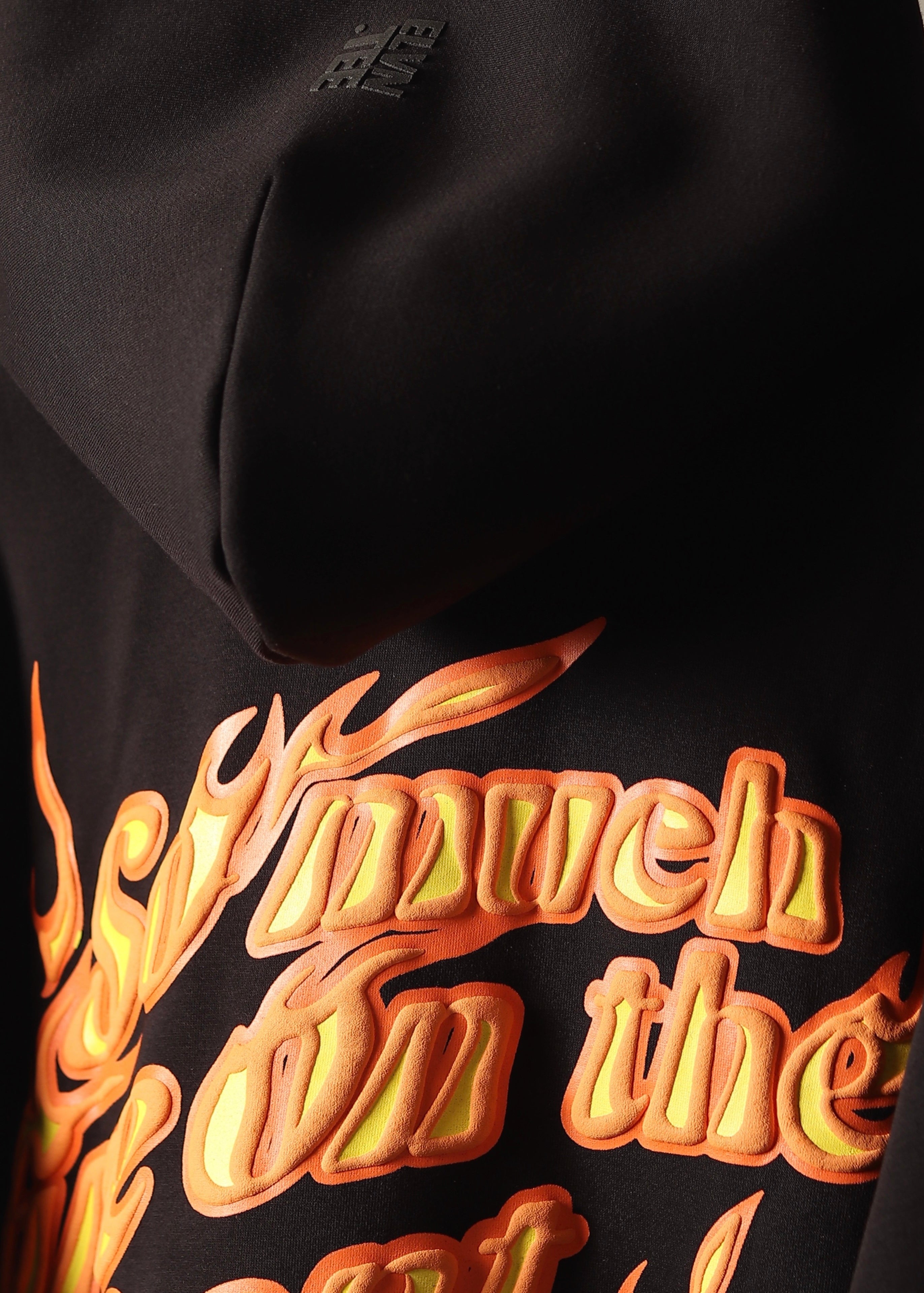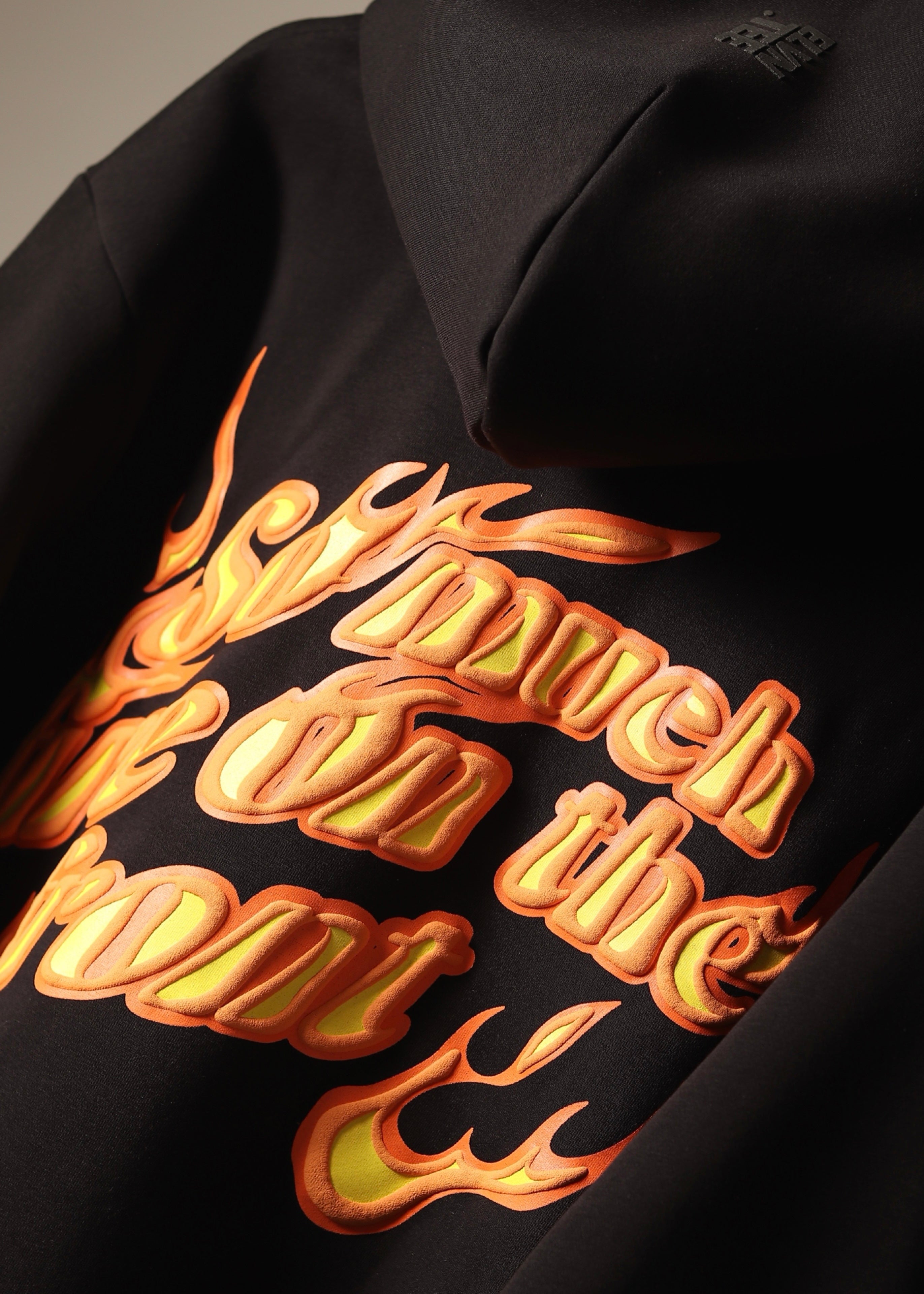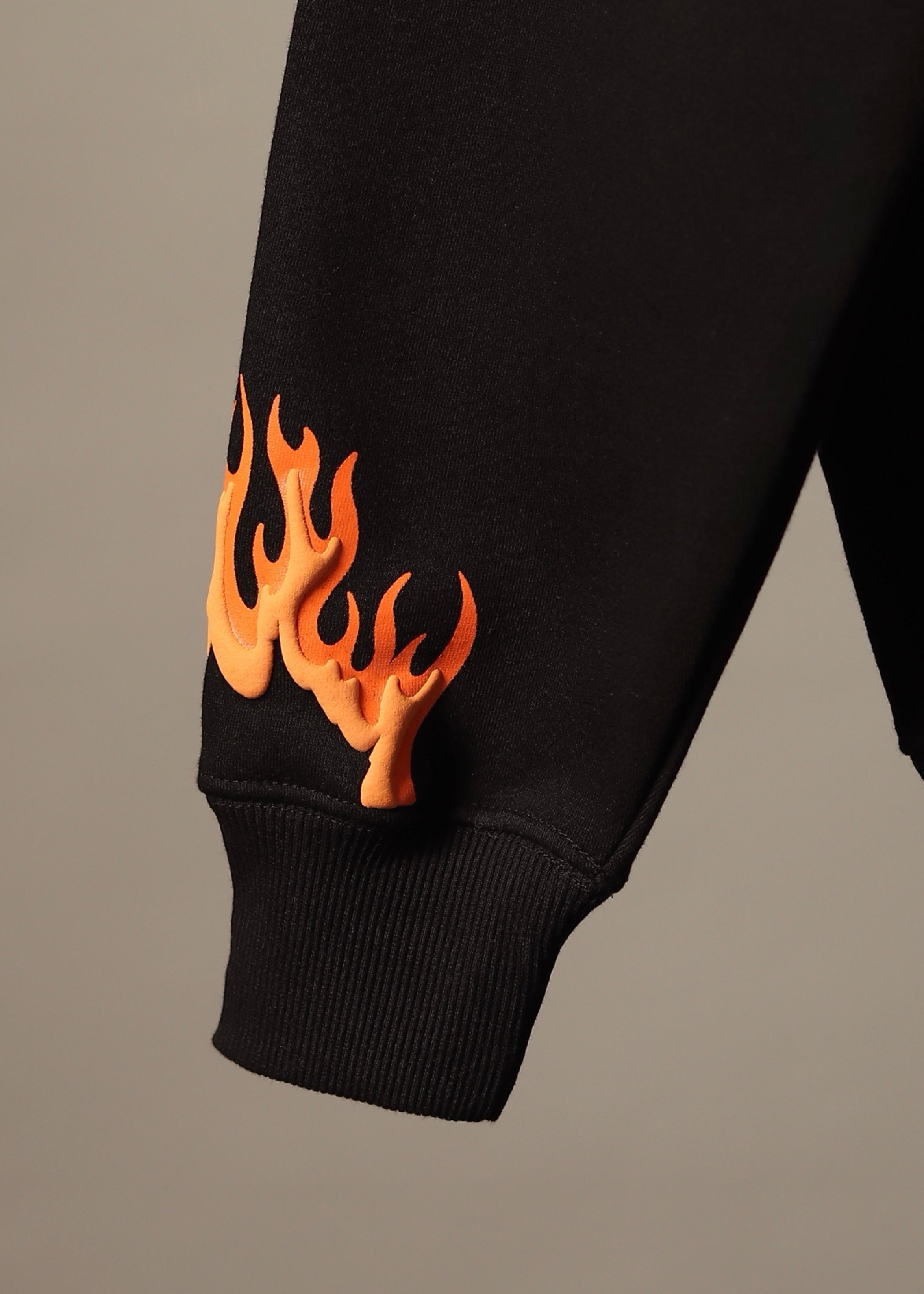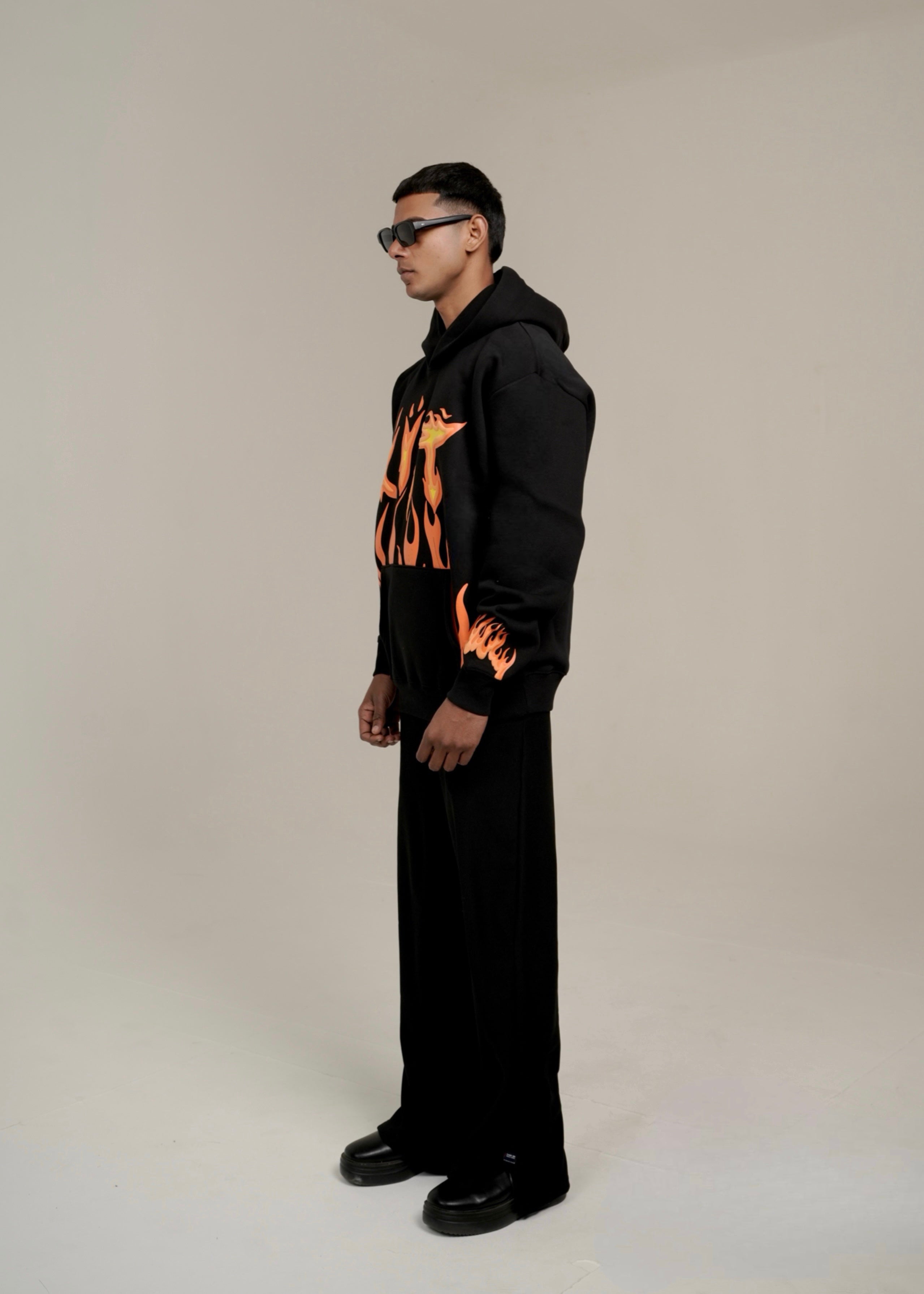 ‘FIRE FLAMES’ Hoodie in Midnight Black, made from 350 GSM Heavy weight cotton fleece, with Screen & Puff print on front, back & sleeve, and HD print logo on hood.