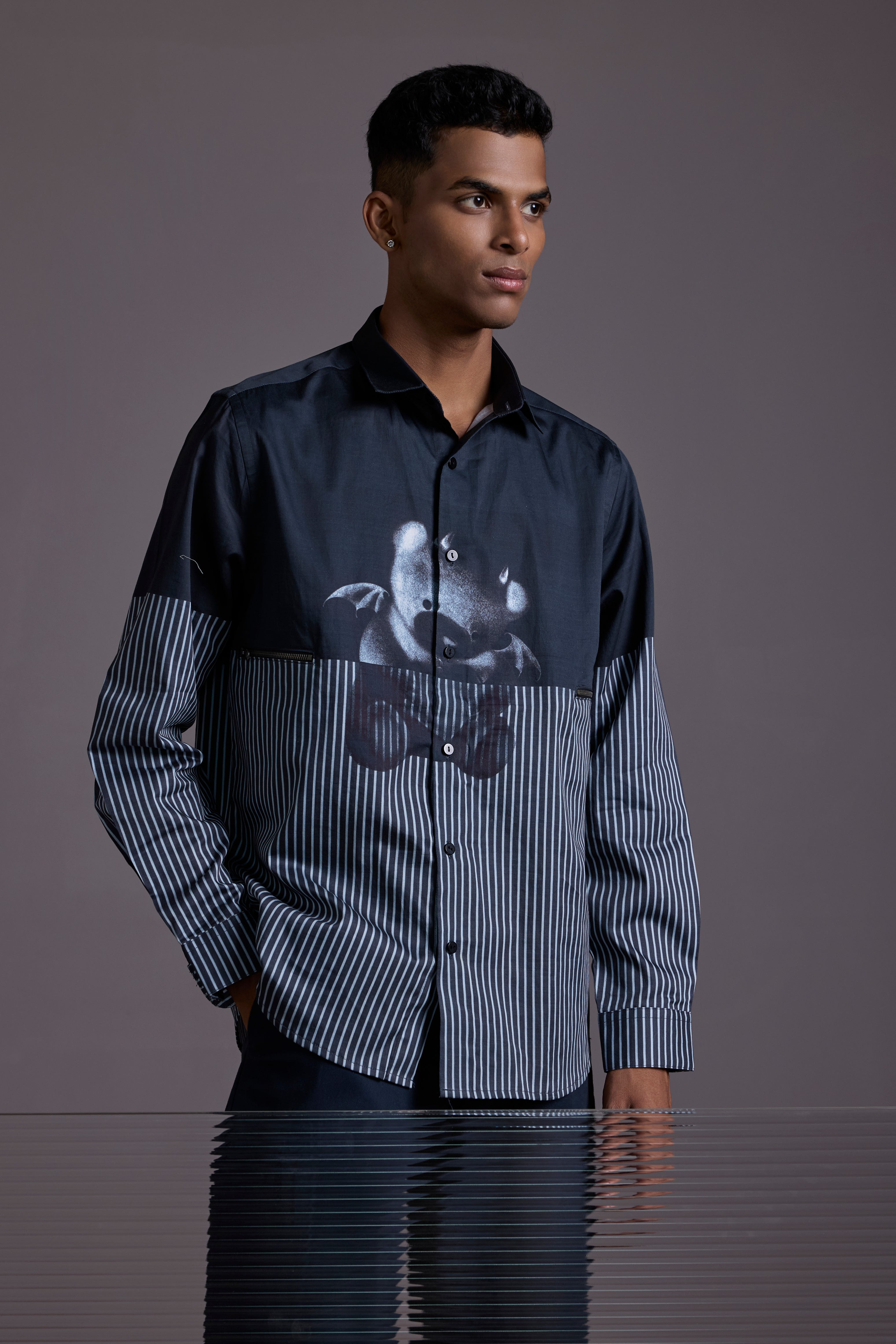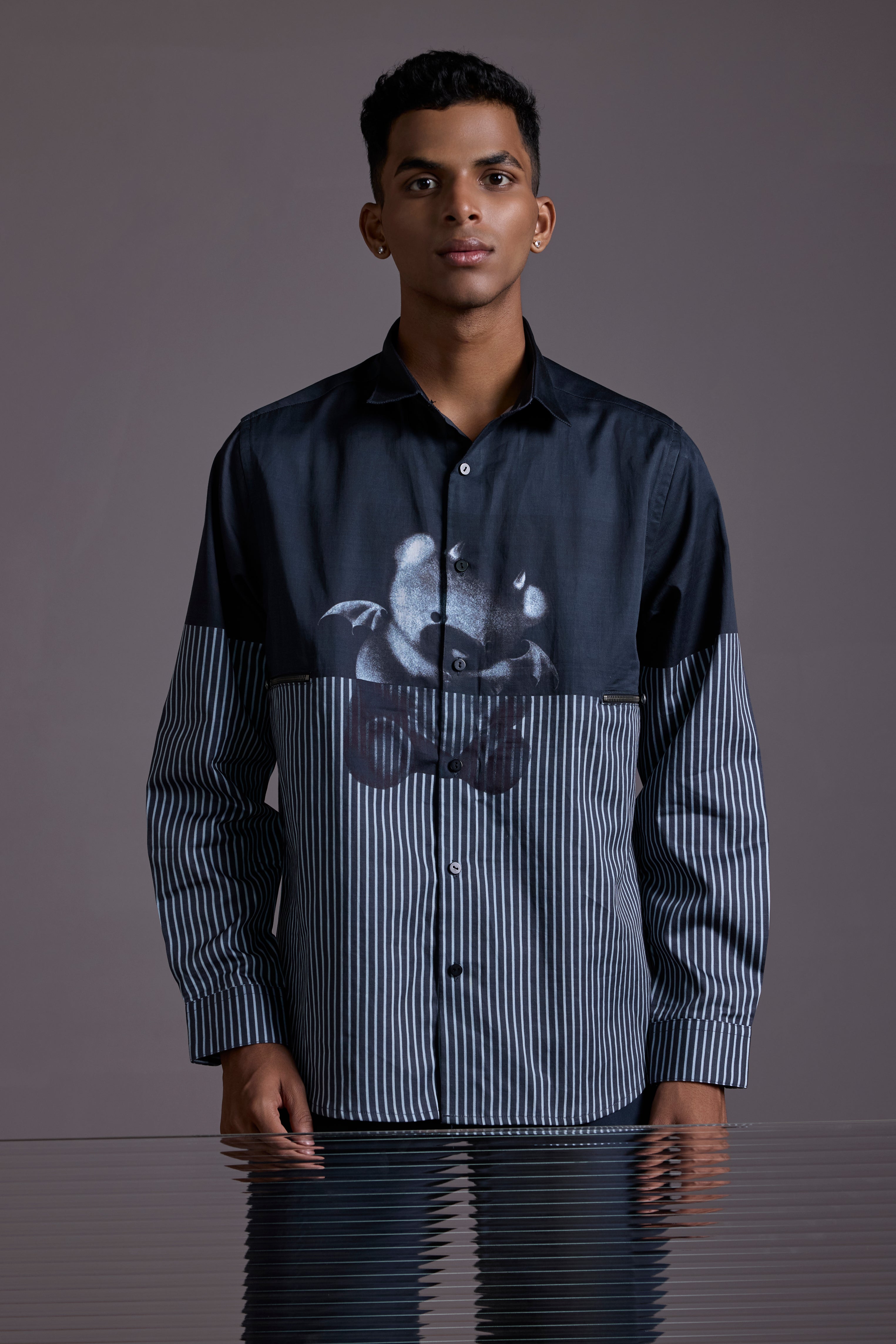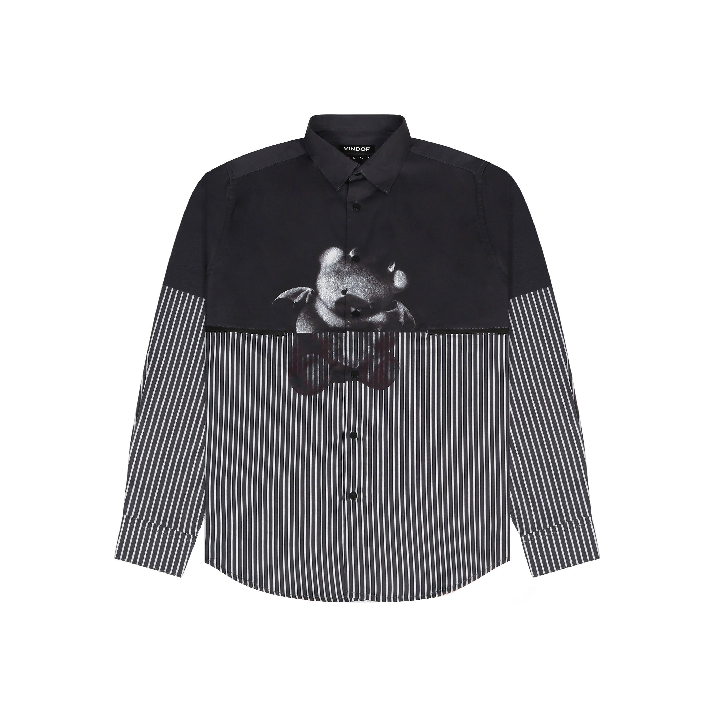 This Regular fit two-tone shirt features a sleek black upper contrasted with fine monochrome stripes below. The centerpiece? A metallic devil-teddy graphic that brings unexpected charm with an attitude. Whether layered or worn solo, this piece stands out in any room you walk into.