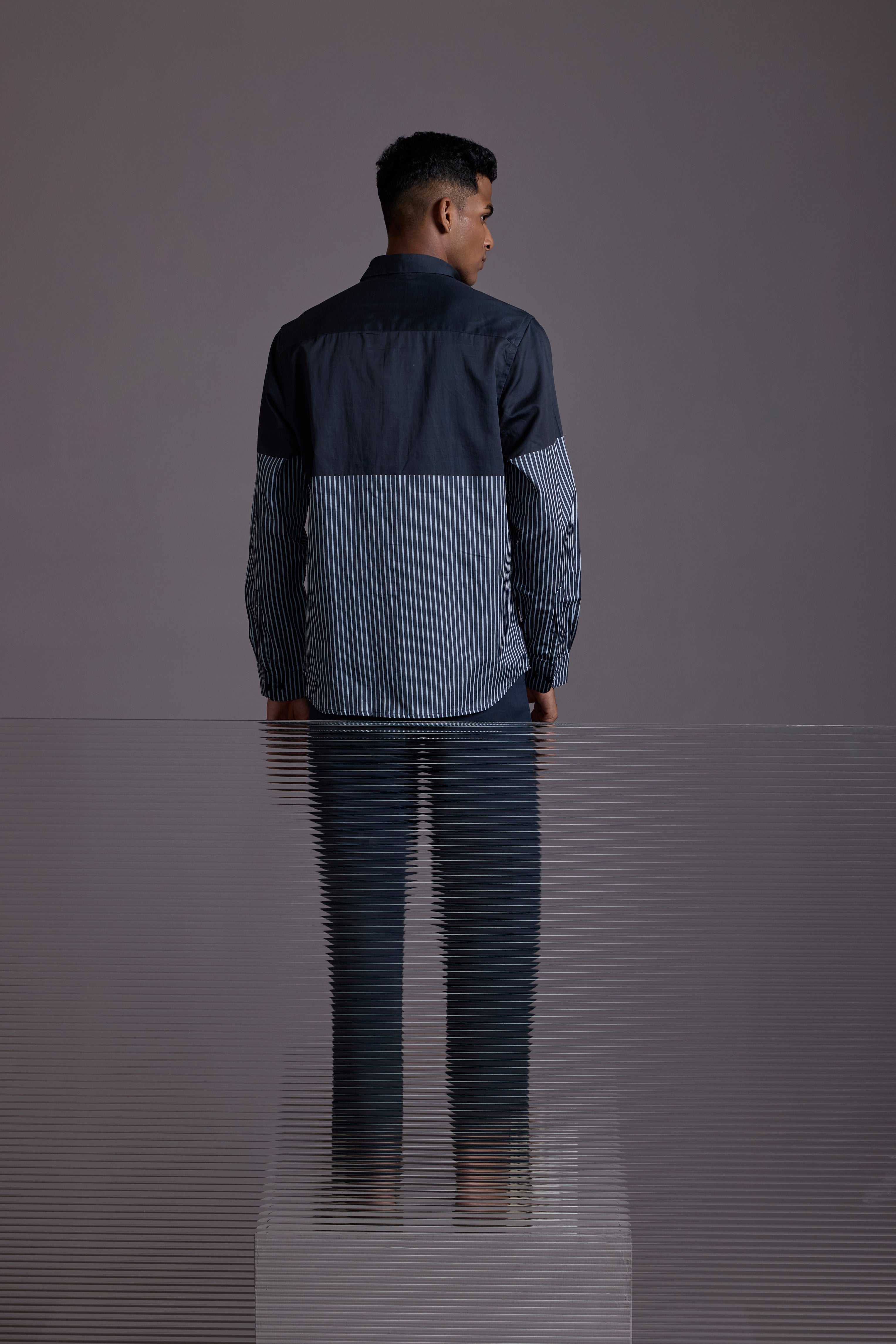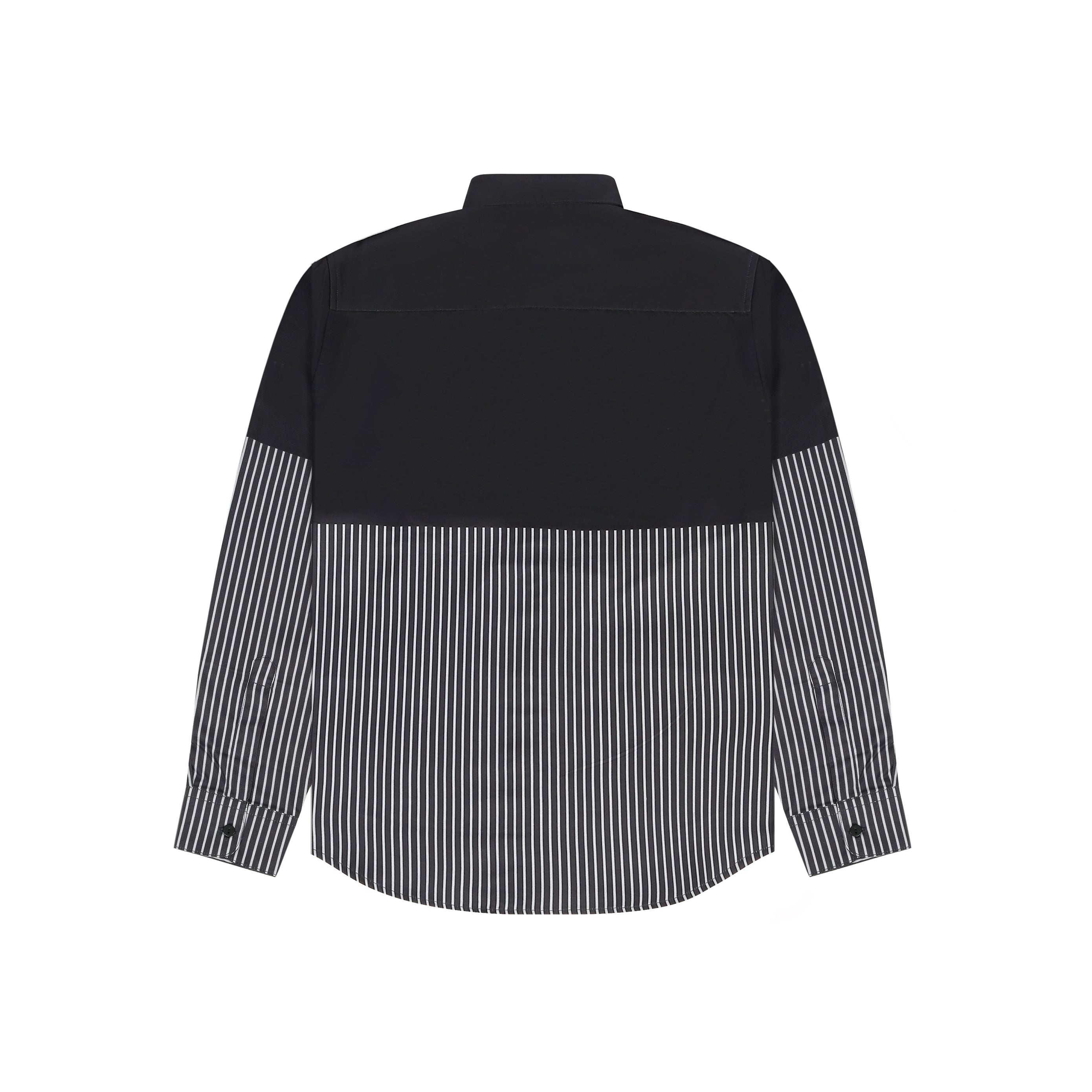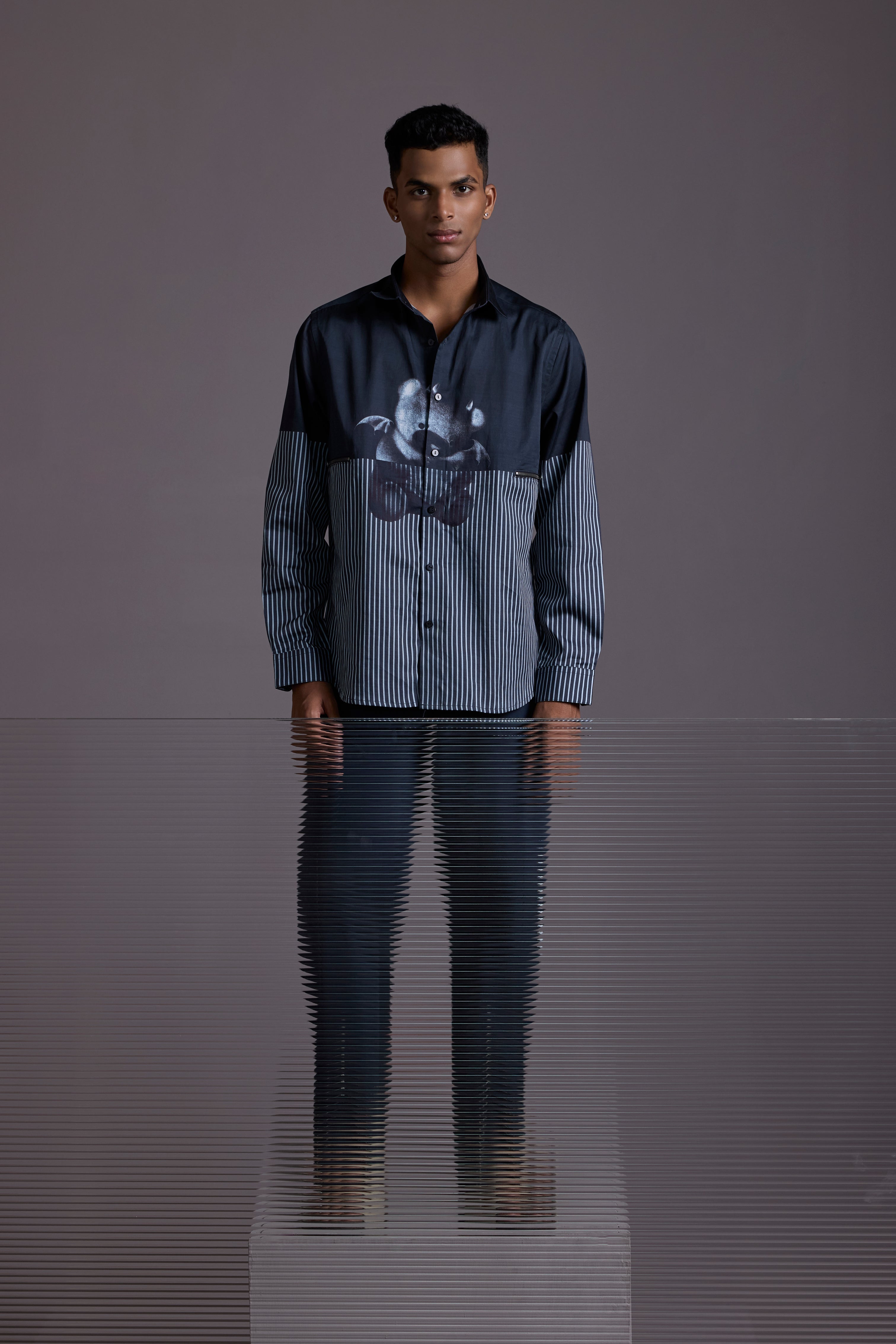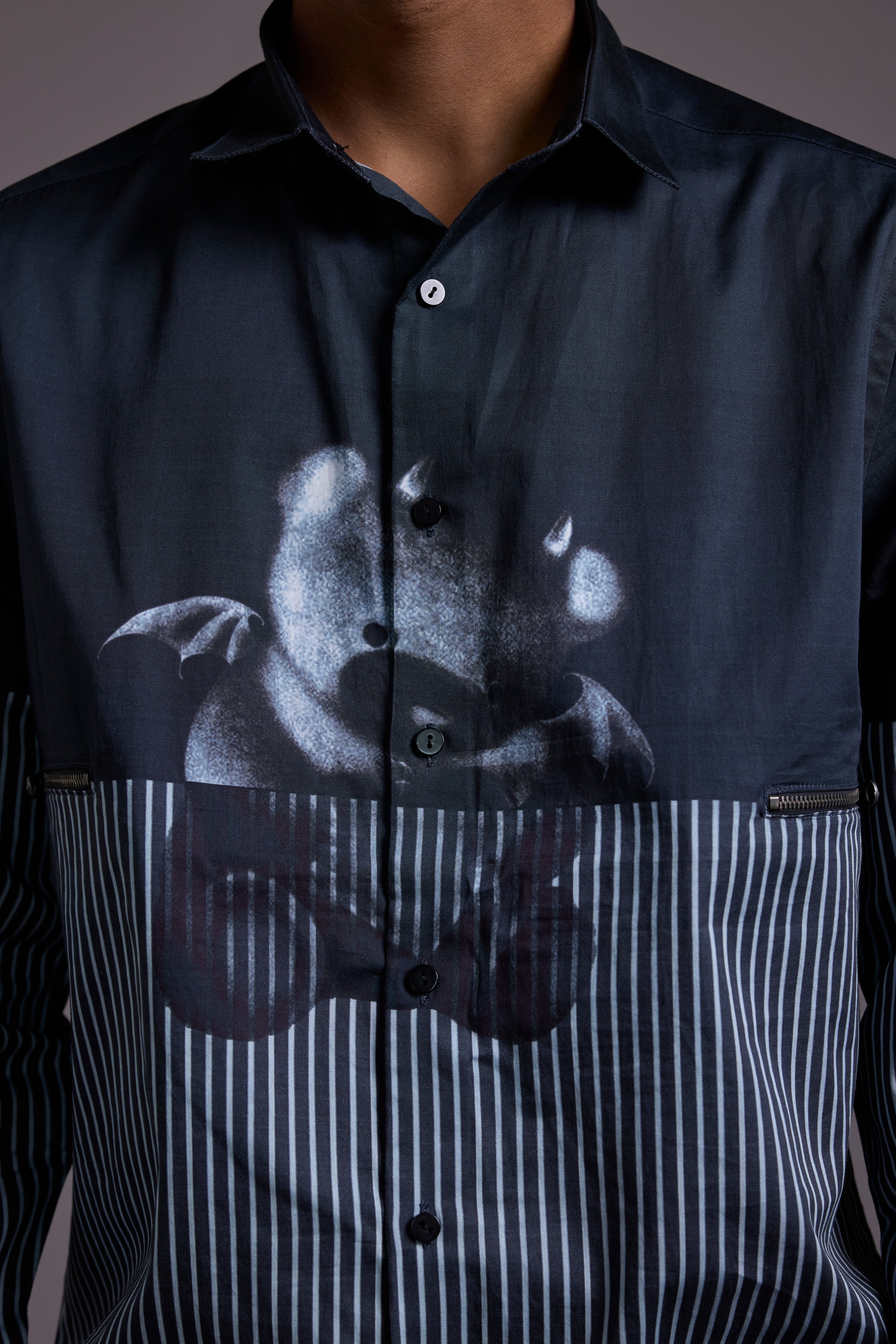 This Regular fit two-tone shirt features a sleek black upper contrasted with fine monochrome stripes below. The centerpiece? A metallic devil-teddy graphic that brings unexpected charm with an attitude. Whether layered or worn solo, this piece stands out in any room you walk into.