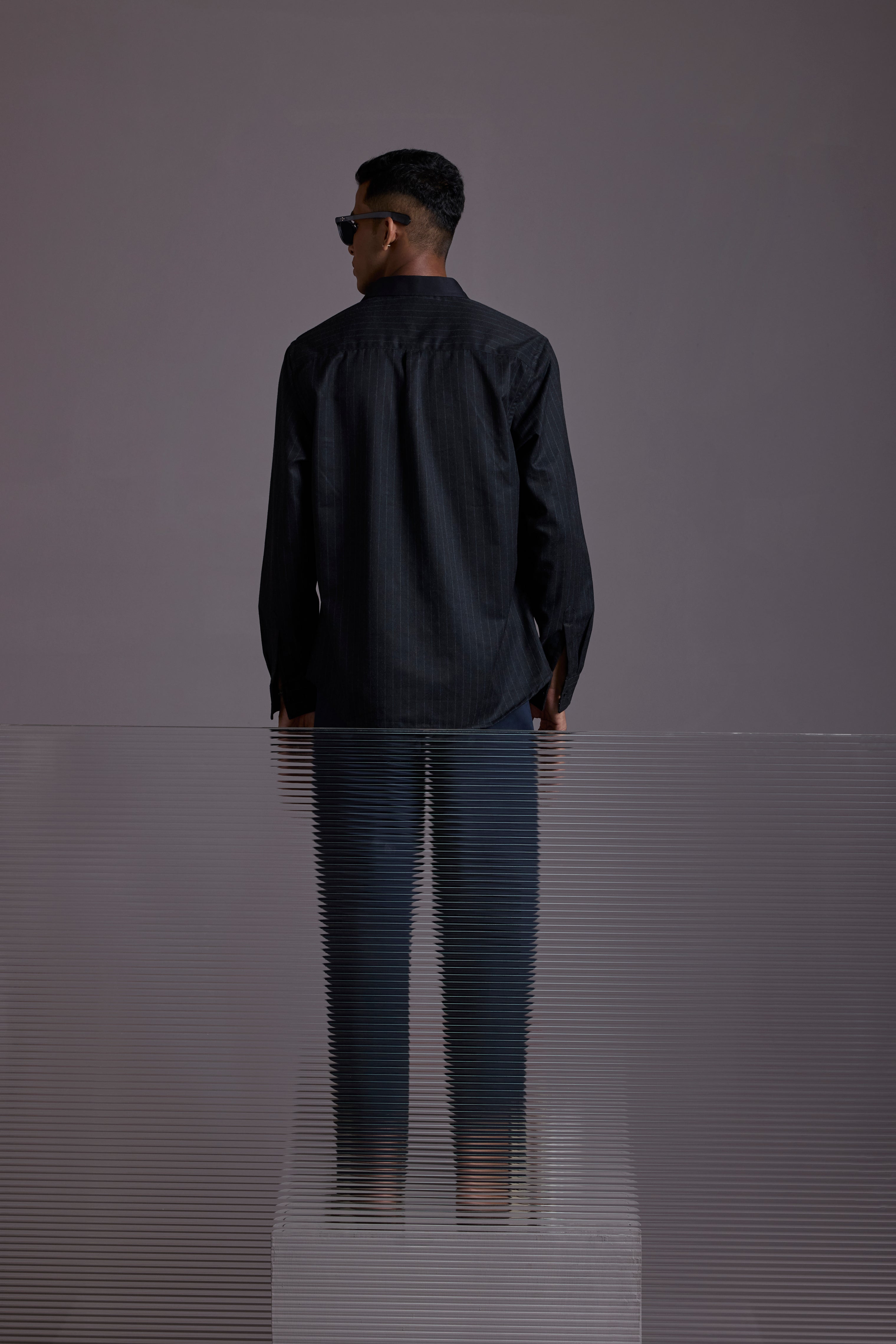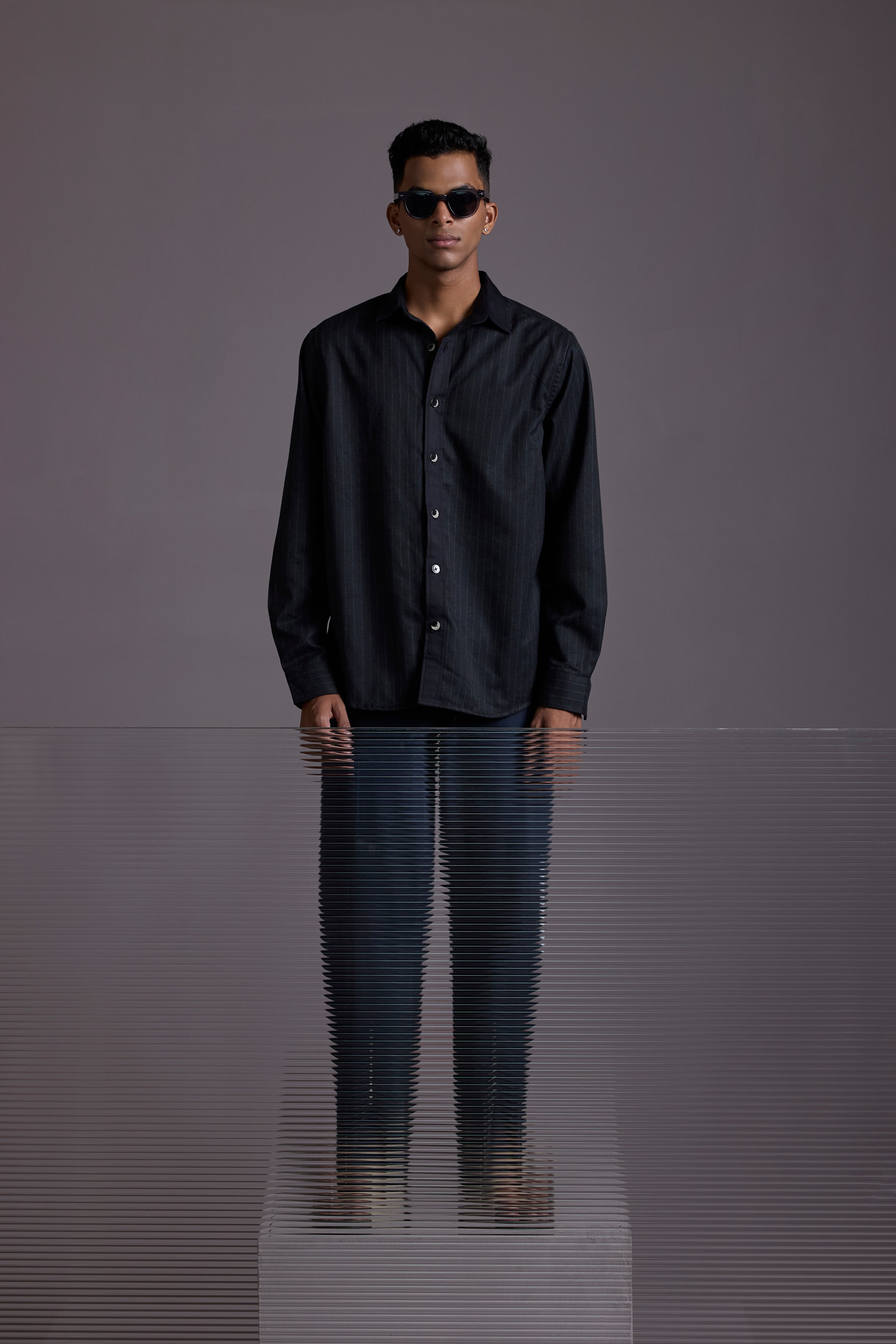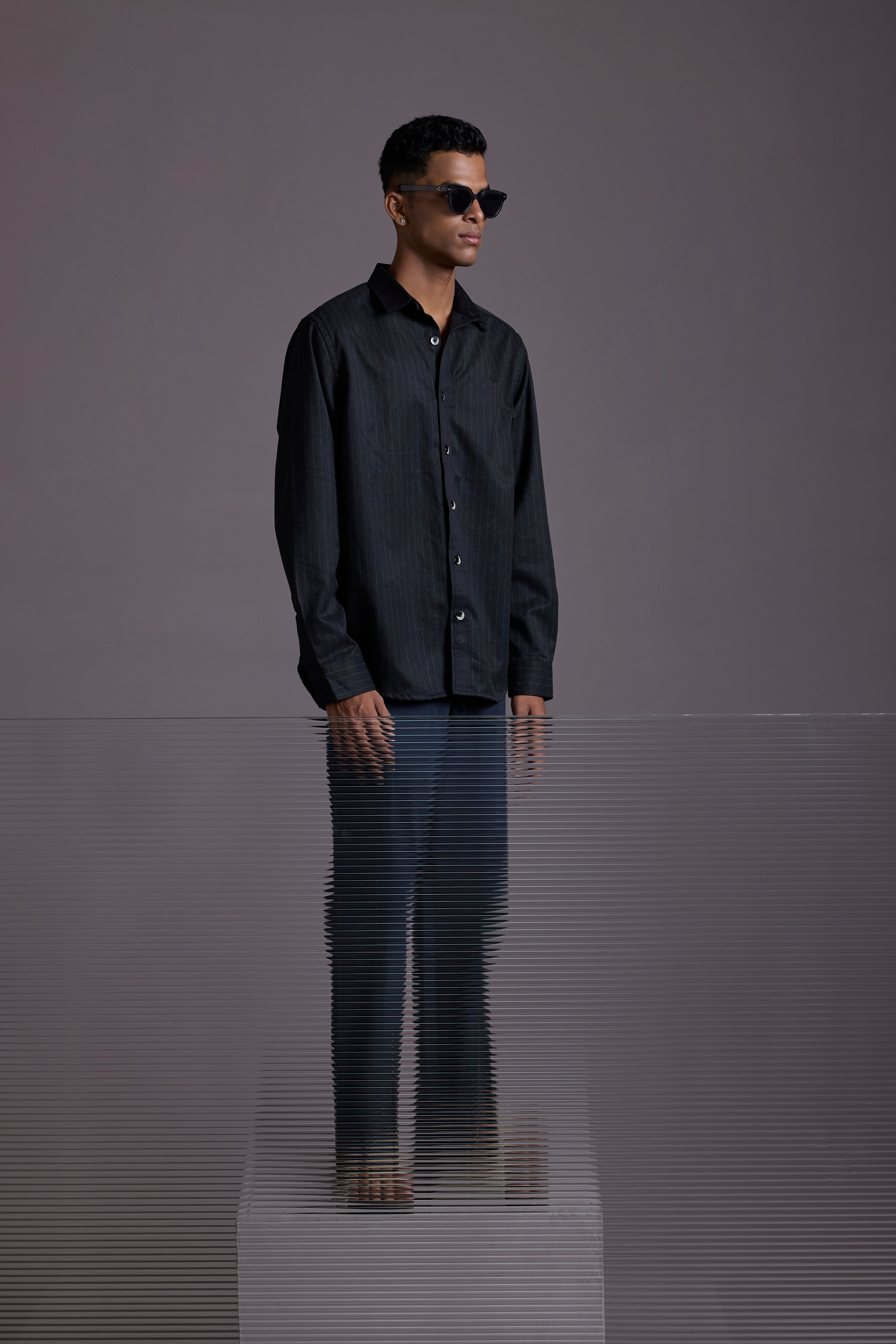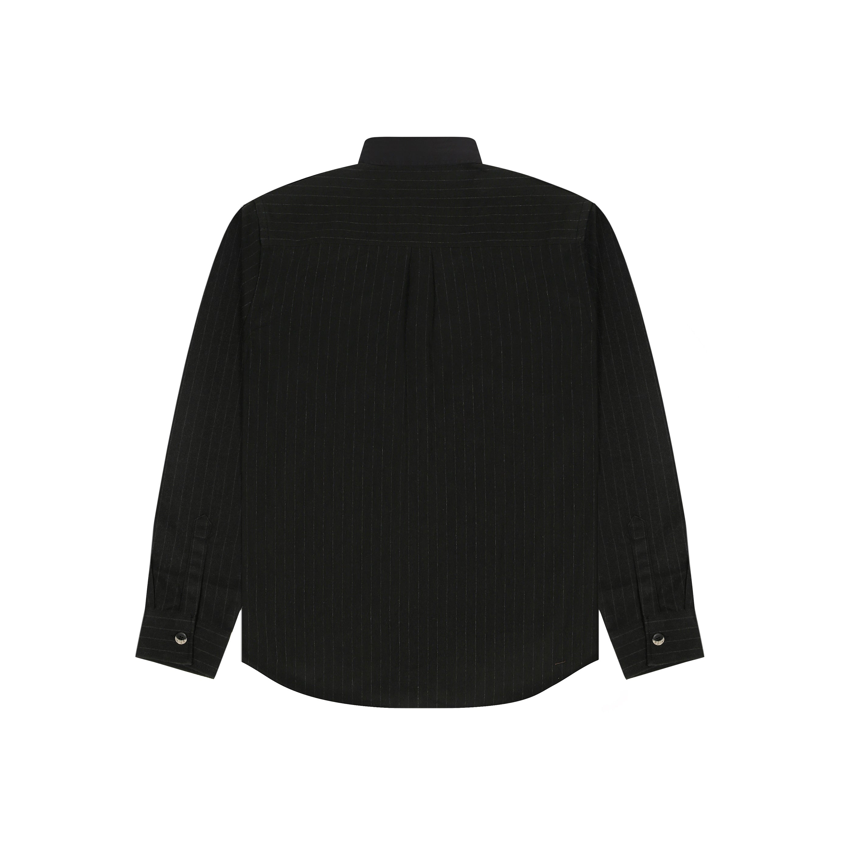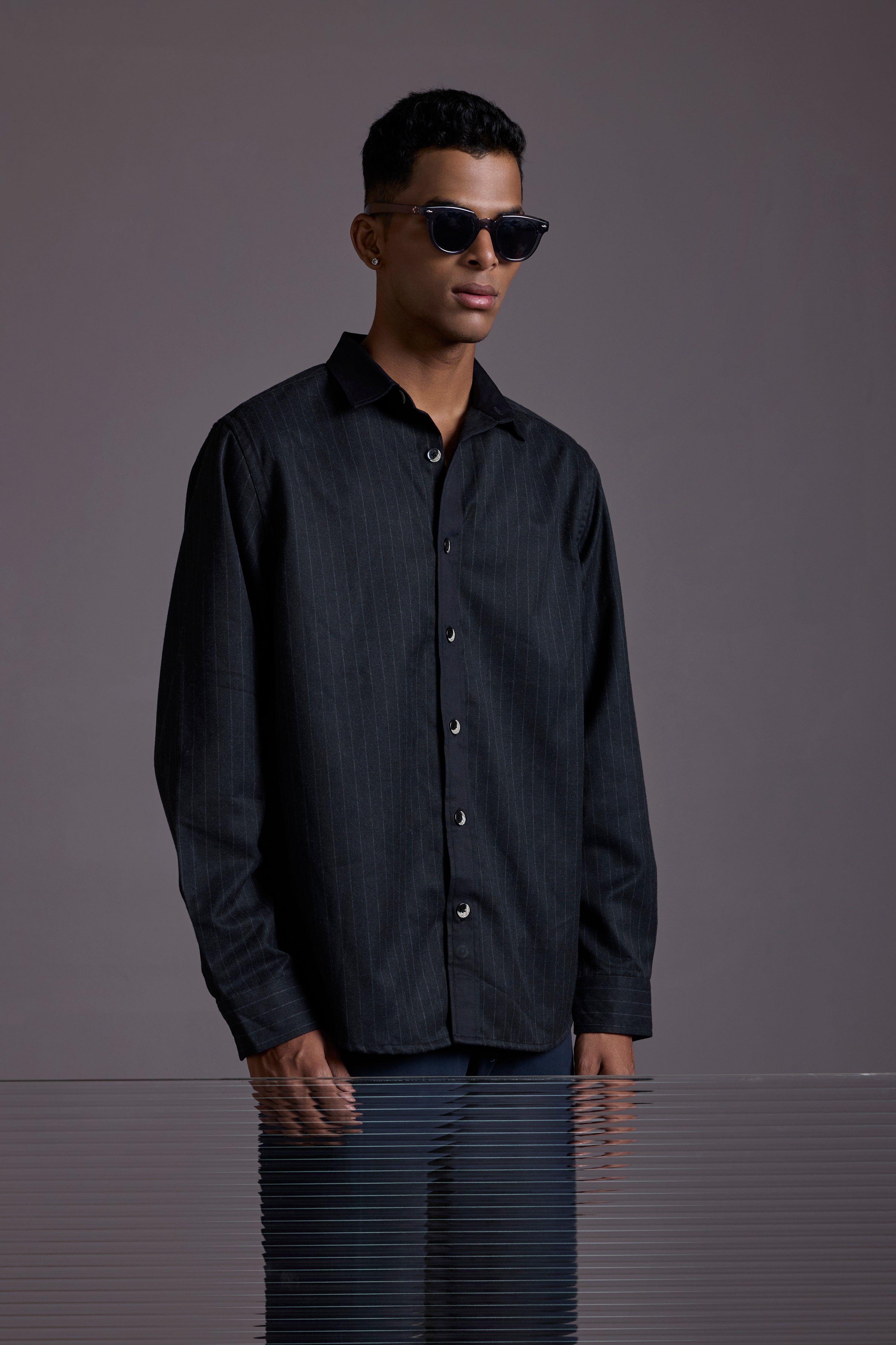 The Midnight Pinstripe Shacket features a tailored silhouette with contrasting vertical stripes and a standout denim-feel placket crafted from high GSM cotton twill.