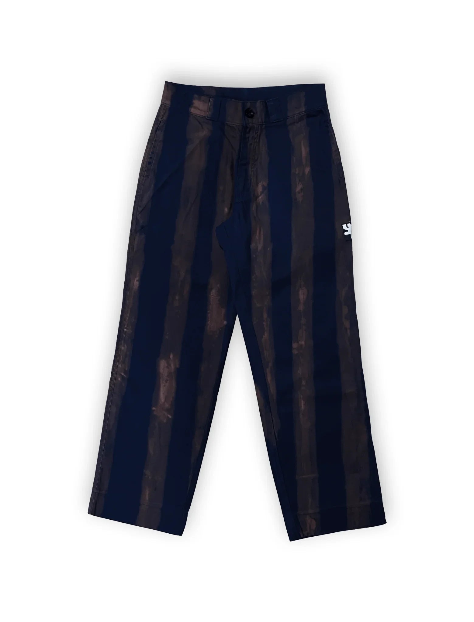 Midnight Rust Pants, a raw canvas of rebellion hand-painted with bleach to create a unique, worn-in texture. The signature bone pocket at the back adds an unexpected twist, making every detail a statement of bold individuality.