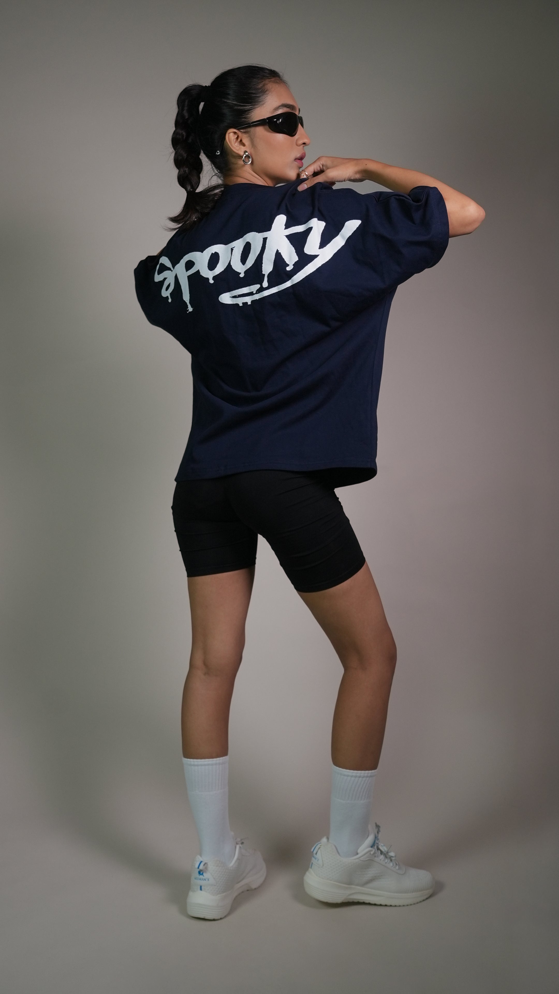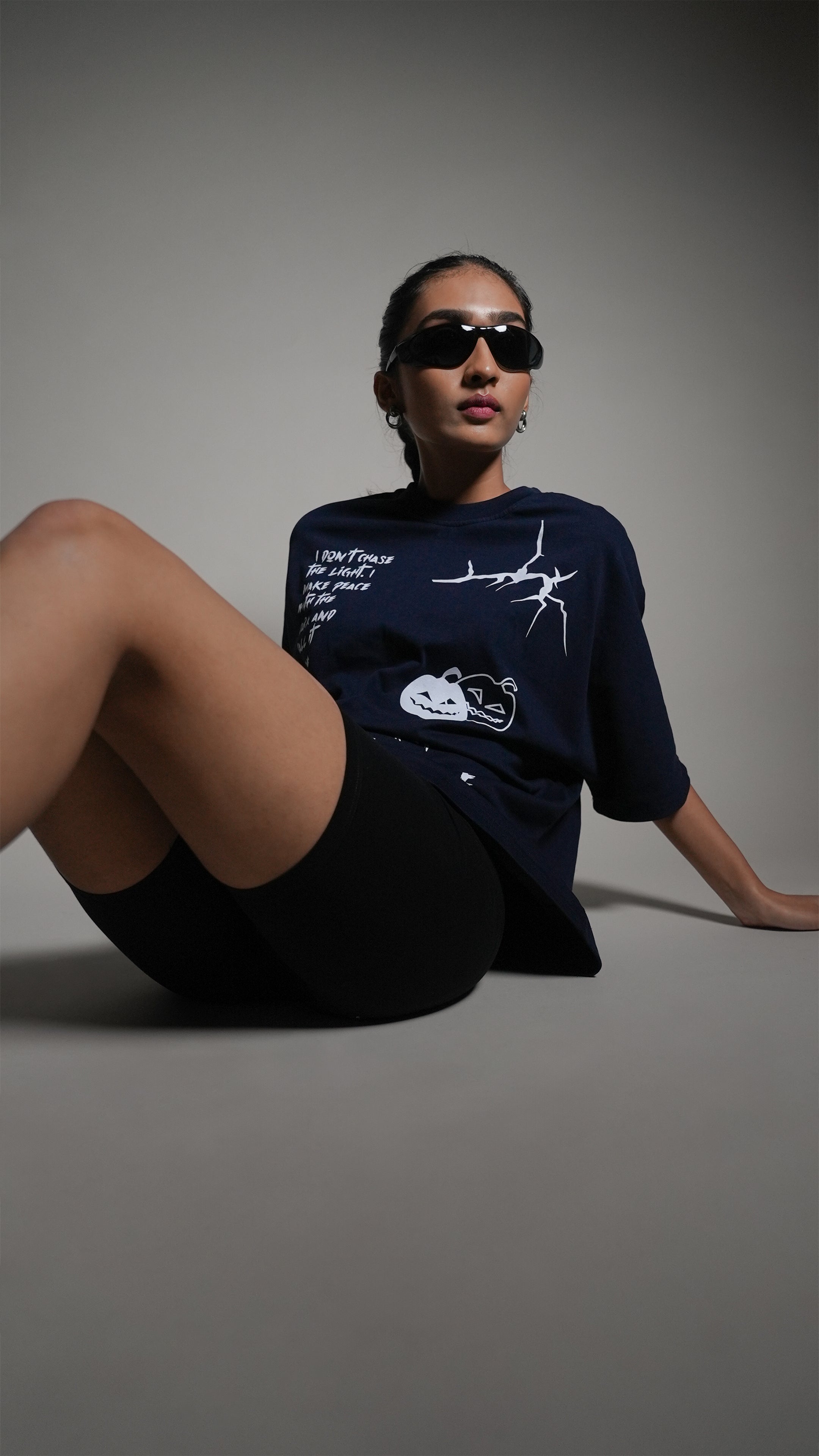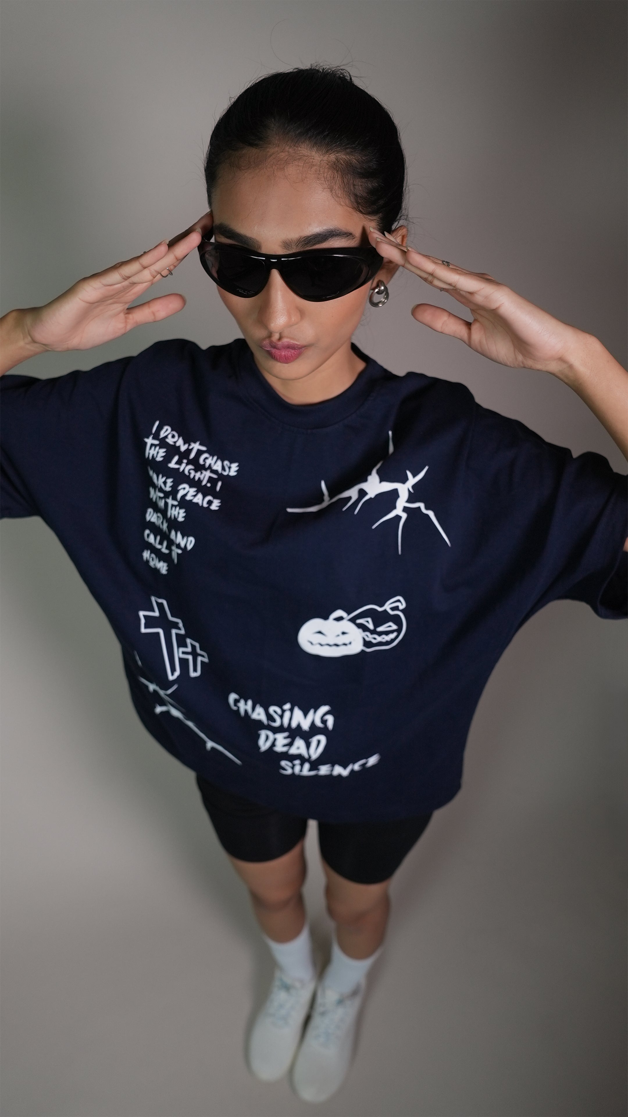This navy tee taps into spooky aesthetics with a clean, seamless-shoulder silhouette and a bold horror-inspired graphic. Crafted from 300 GSM heavyweight single jersey cotton, it blends style, comfort, and a dark twist. A tee for those who love a little mystery in their fits.