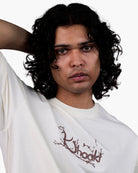 Premium oversized unisex T-shirt in a soothing Off White, featuring a bold puff print of a majestic tree in electric blue and earthy tones. Inspired by nature’s mystery and strength, this 260 GSM heavyweight tee is crafted from soft Cotton Spandex Terry Looper and double silicone washed for a smooth, premium hand-feel.