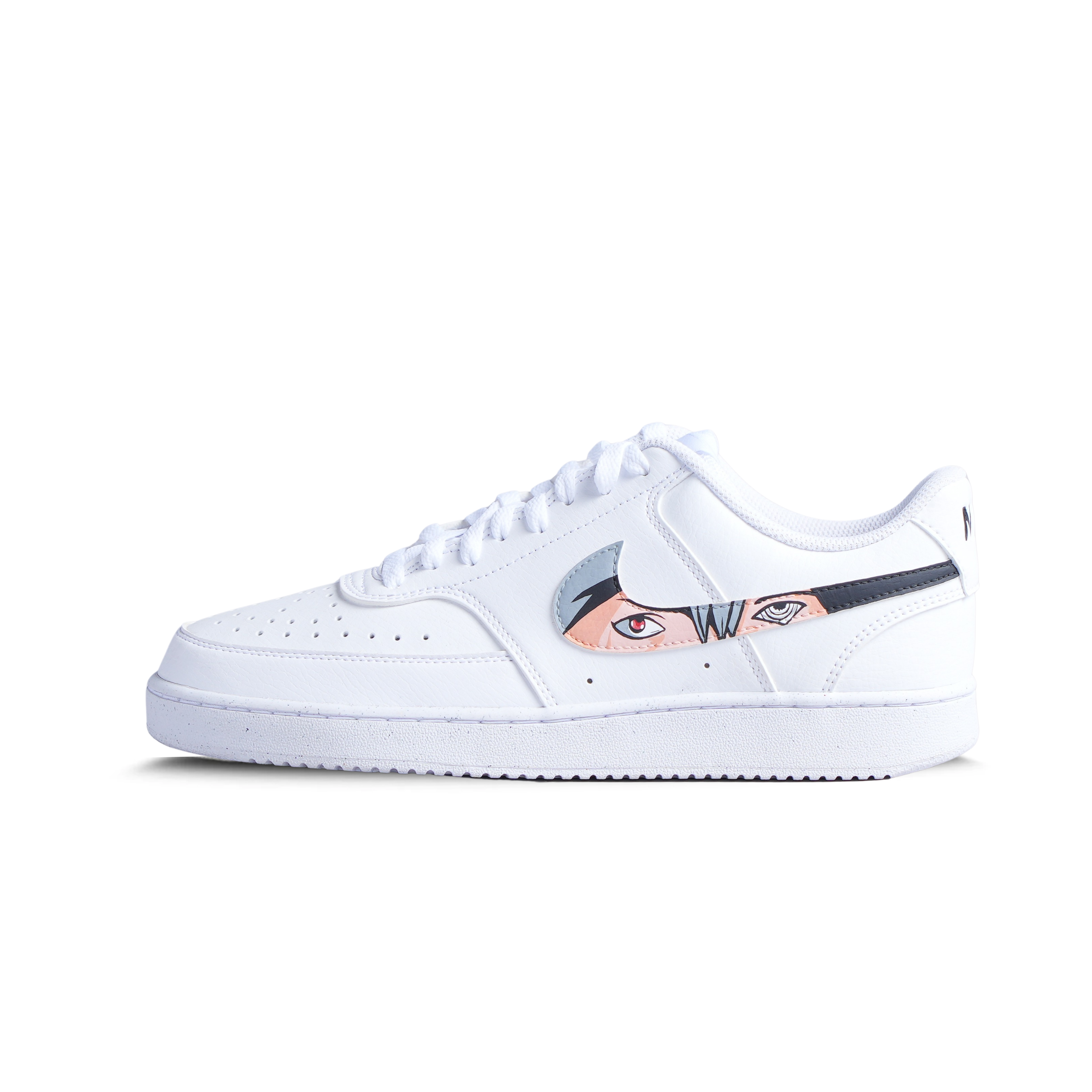 Naruto and Kakashi peeking through the Swoosh of a triple white Nike Courtvision.