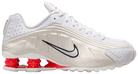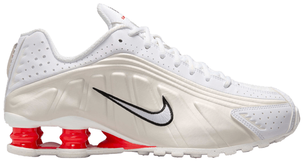 The Nike Shox R4 'Phantom Picante Red' combines retro aesthetics with responsive cushioning technology. Featuring the iconic Shox column system, this women's silhouette delivers impact absorption and a distinctive bouncy feel underfoot. The striking Phantom and Picante Red colorway offers bold visual contrast, making it a standout choice for collectors and sneaker enthusiasts. Built with premium materials and classic '90s-inspired design, this shoe balances heritage appeal with modern comfort for everyday wear or display.