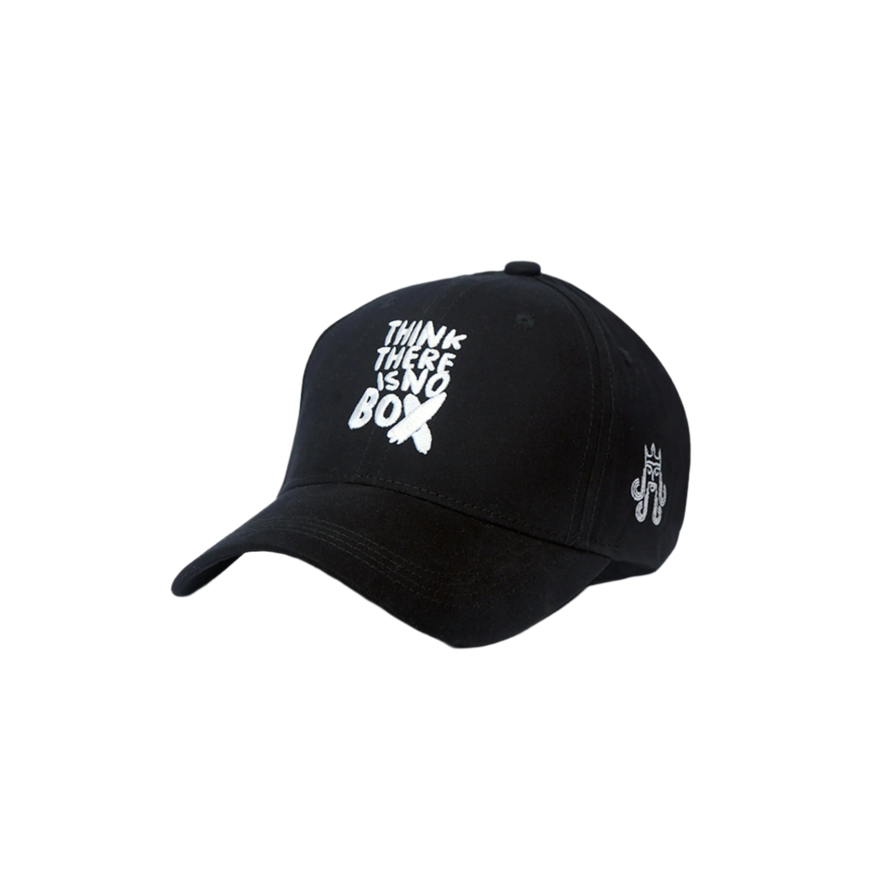 Crafted in a classic 6-panel baseball cap style with a sleek black colorway, this cap offers timeless appeal. However, what truly makes it stand out is the captivating 3D embroidered artwork adorning the front: "Think there is no box" in crisp white lettering. This powerful message serves as a reminder to all our creative minds to break free from limitations and embrace boundless thinking.