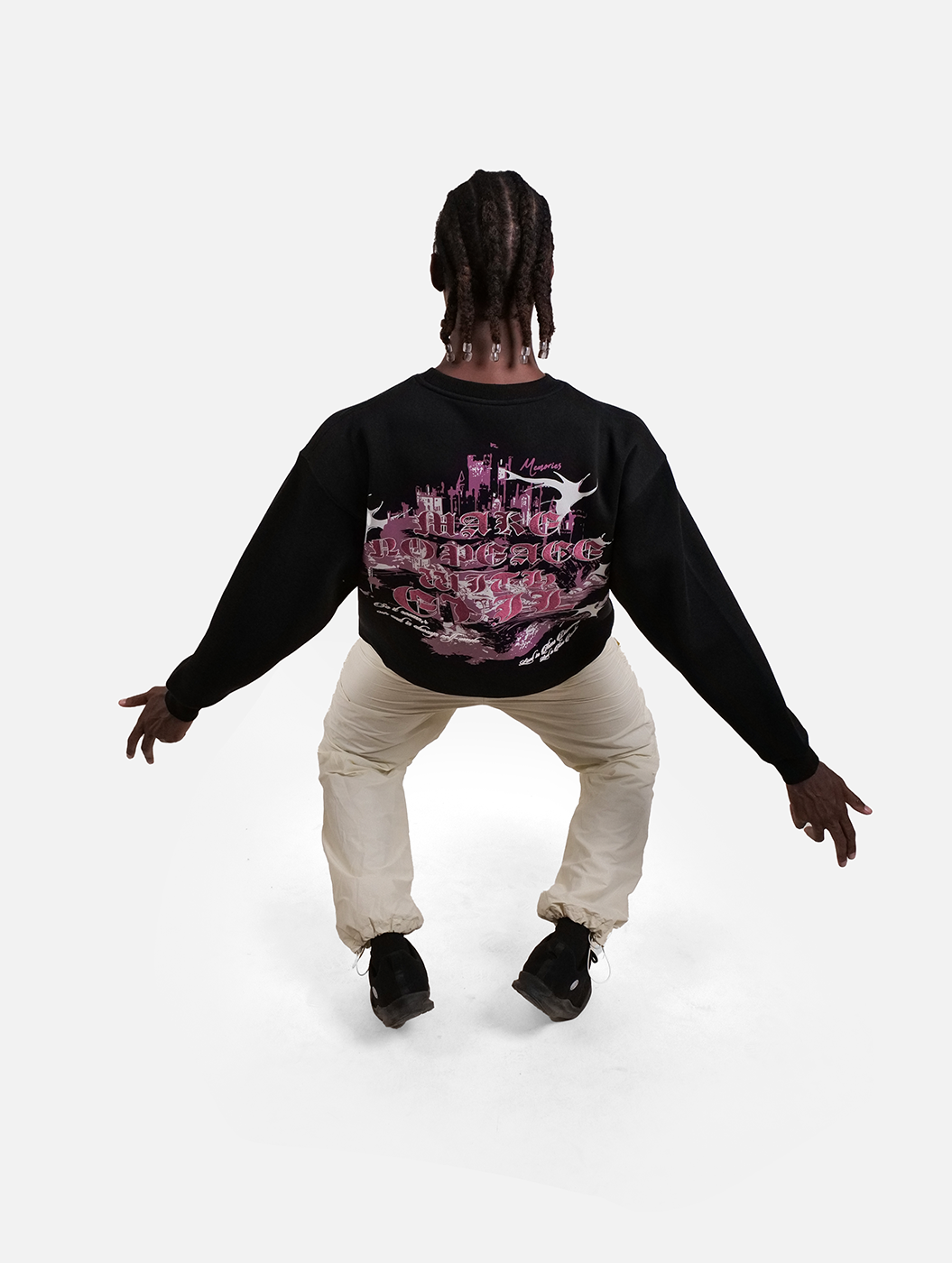 This oversized round-neck sweatshirt, featuring bold screen print at back and striking embroidery, brings an edgy vibe to any look. Designed for warmth and comfort, its soft fit is perfect for laid-back outings. Pair with denim or comfy pants to add effortless style to any casual occasion.
