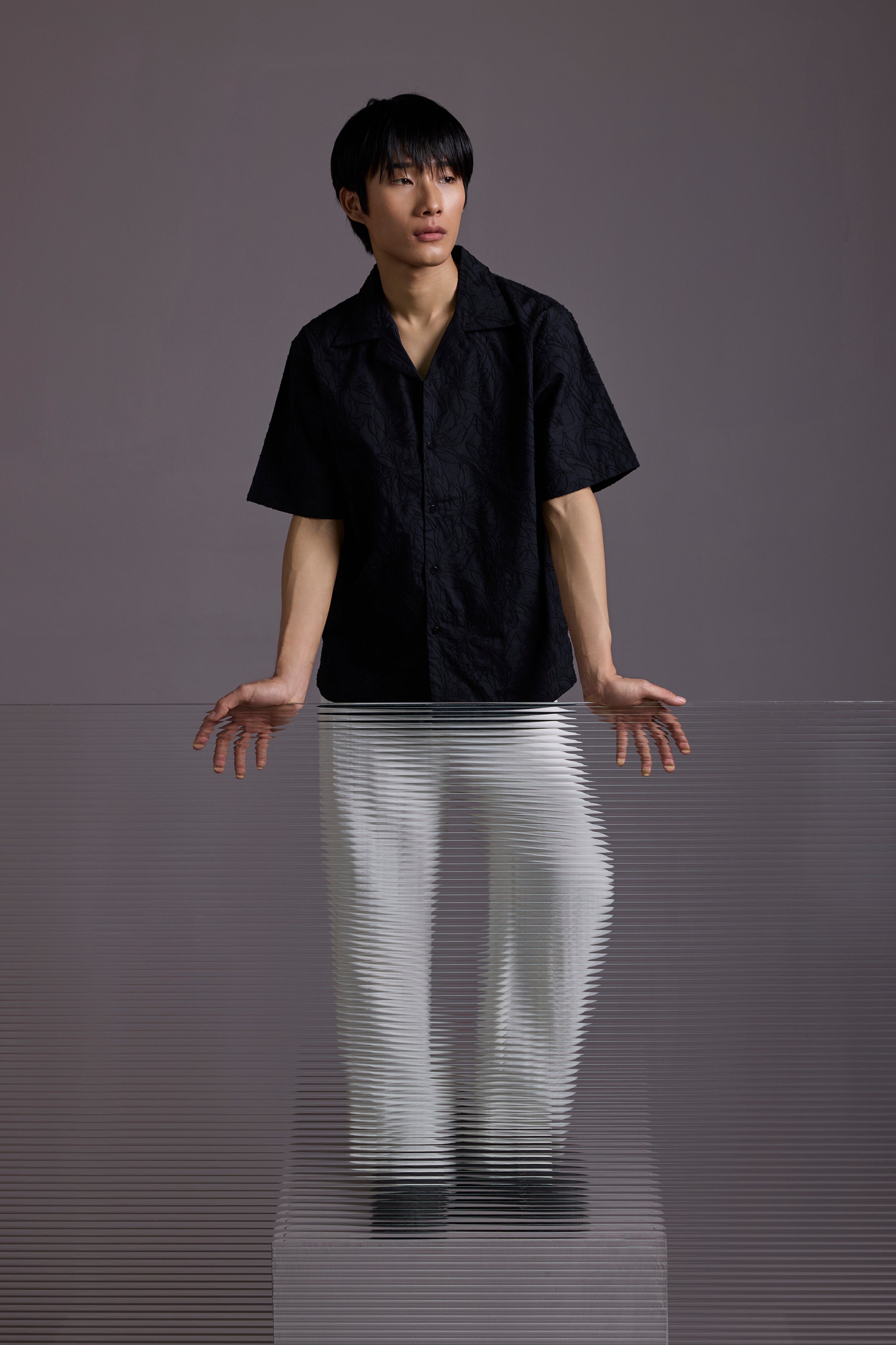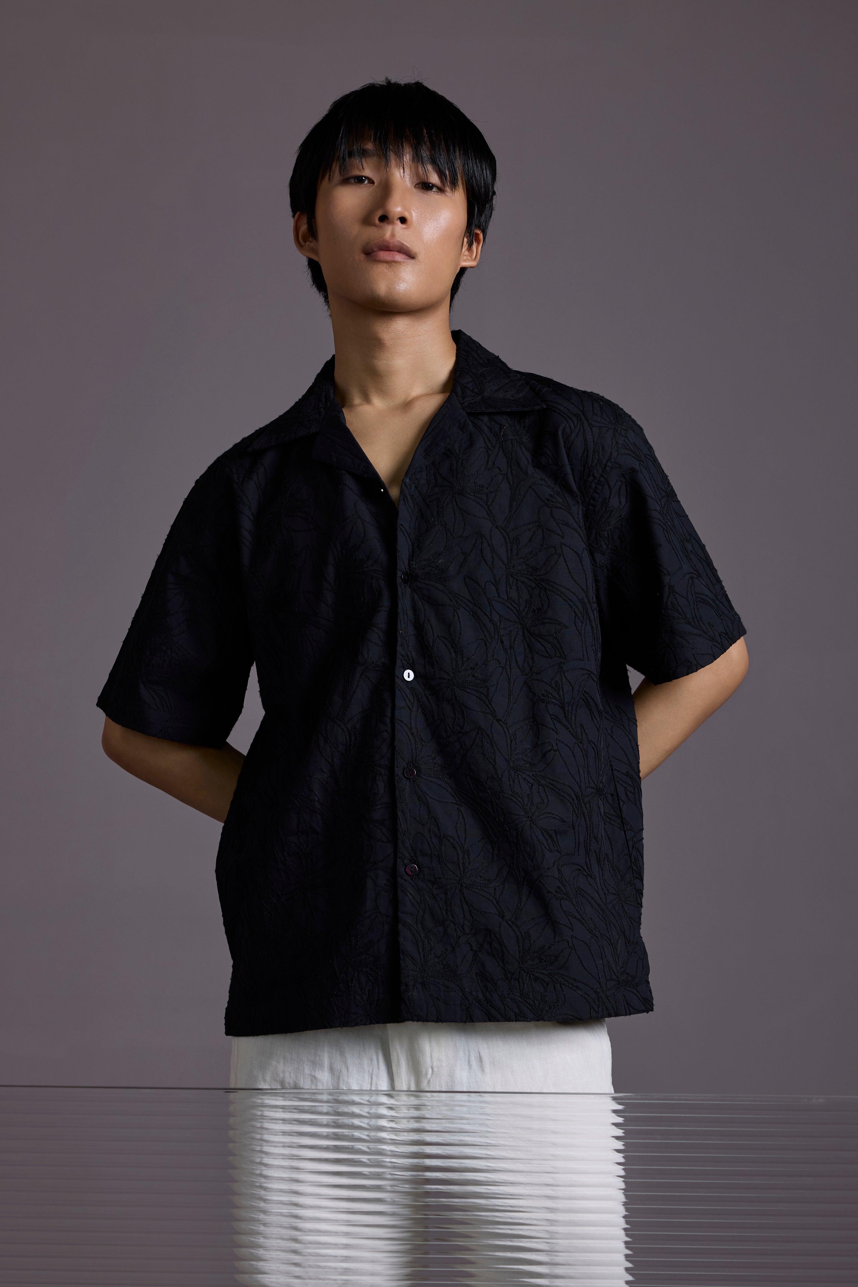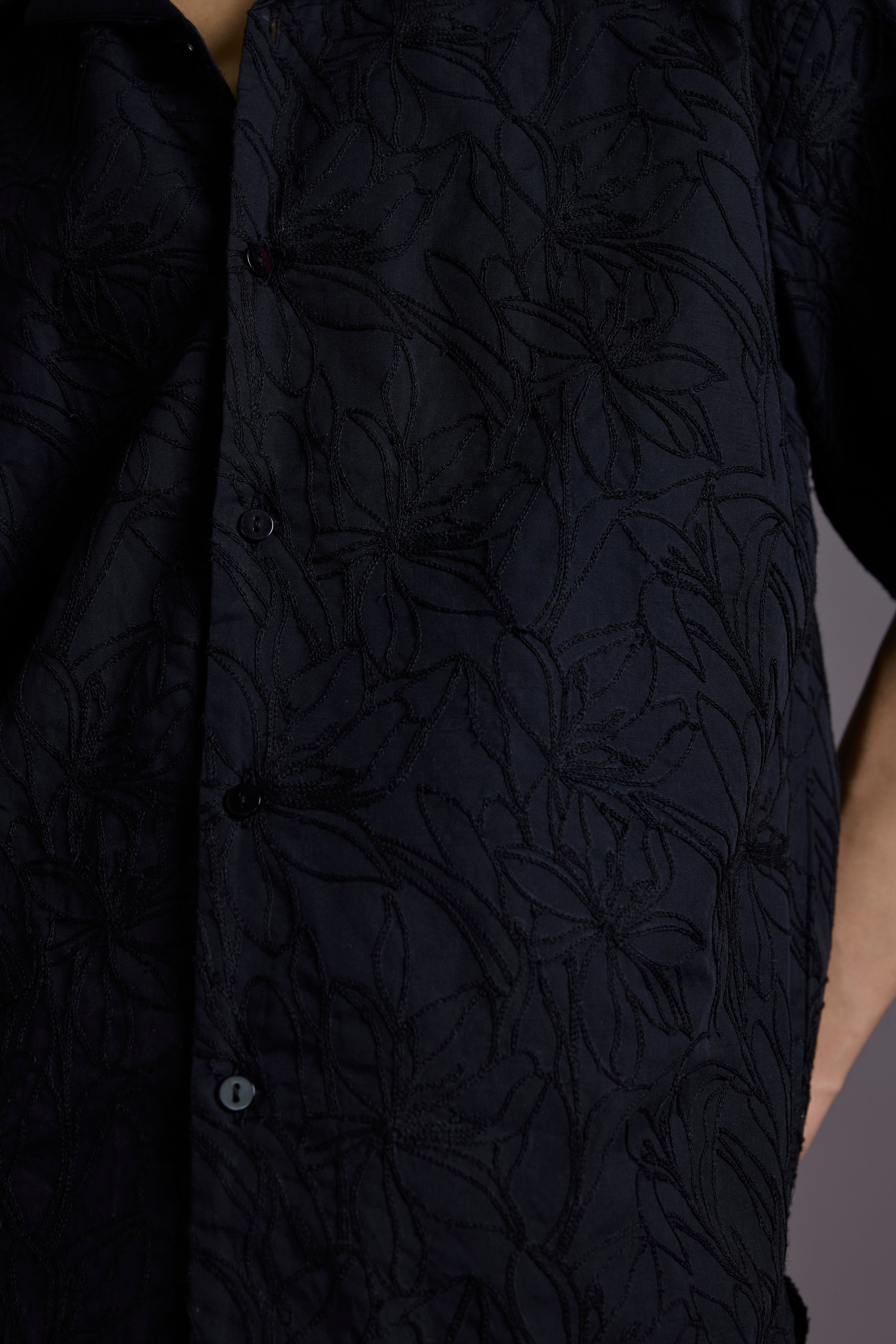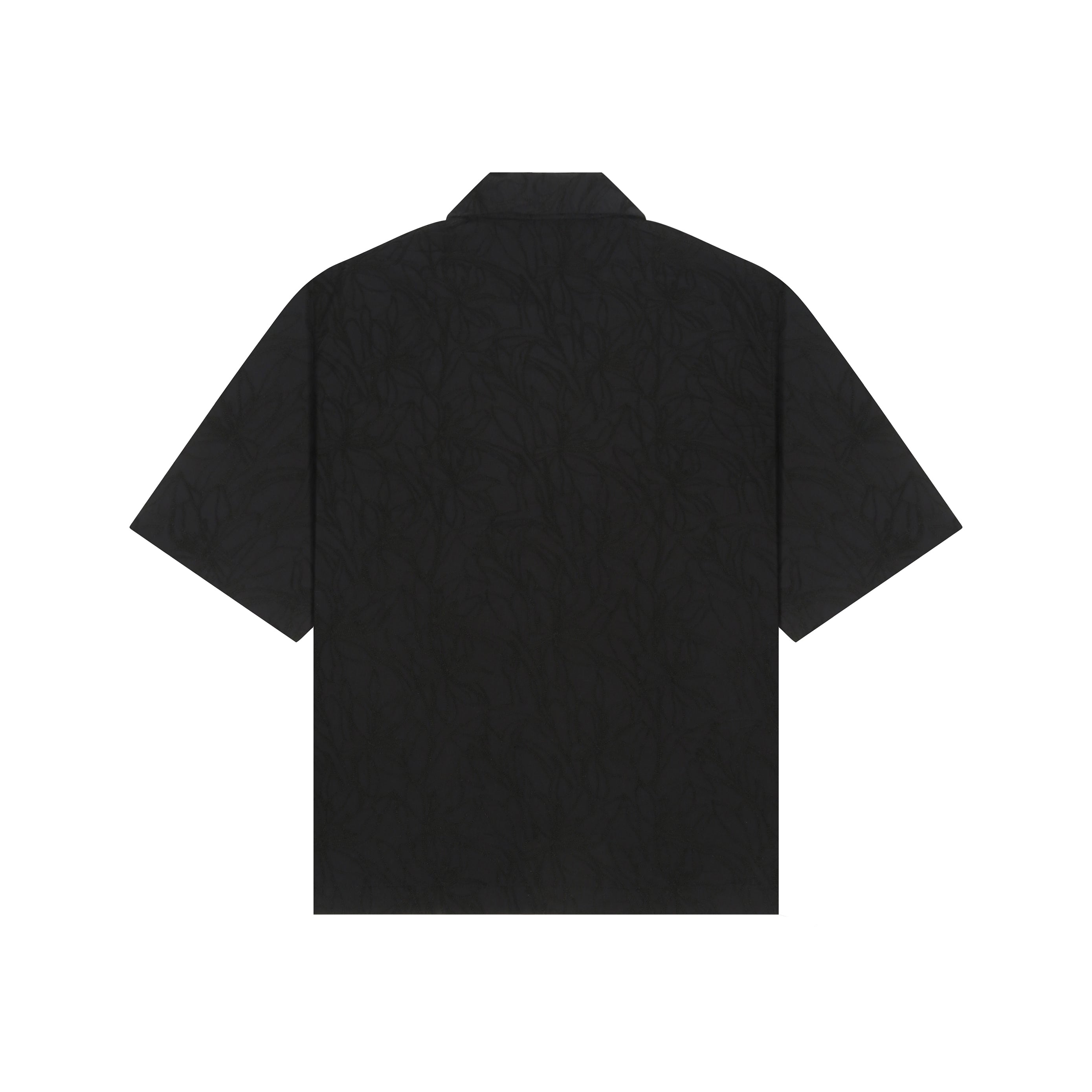 Tonal black floral embroidery across the entire shirt