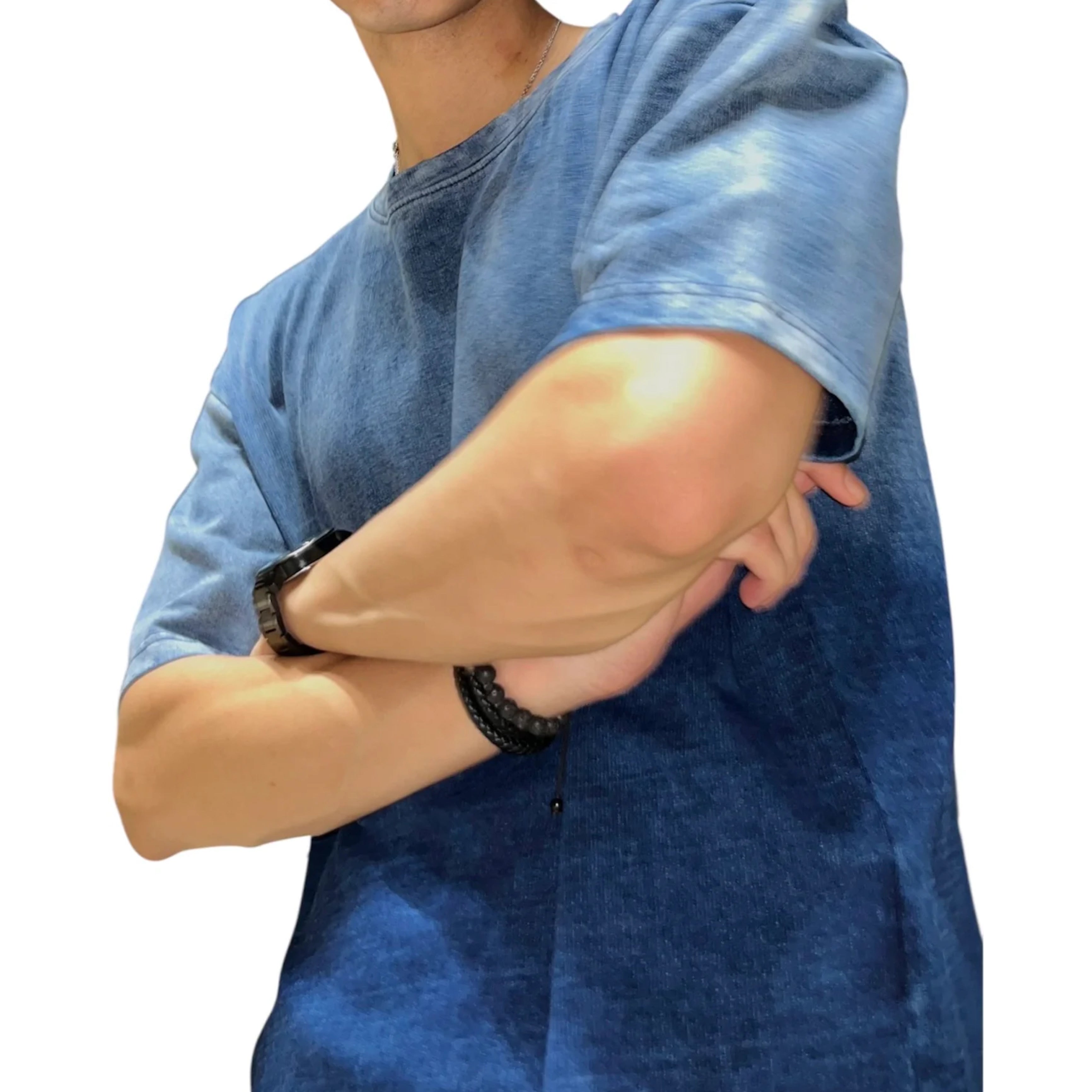 Limited Edition, Unisex Tee Indigo dyed featuring a sharp gradient cut that gives each piece a unique, worn-in vintage character. Crewneck and dropped sleeves. Contrast logo embroidered at Back.