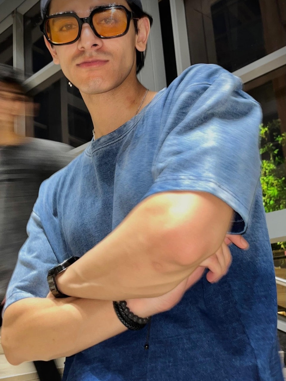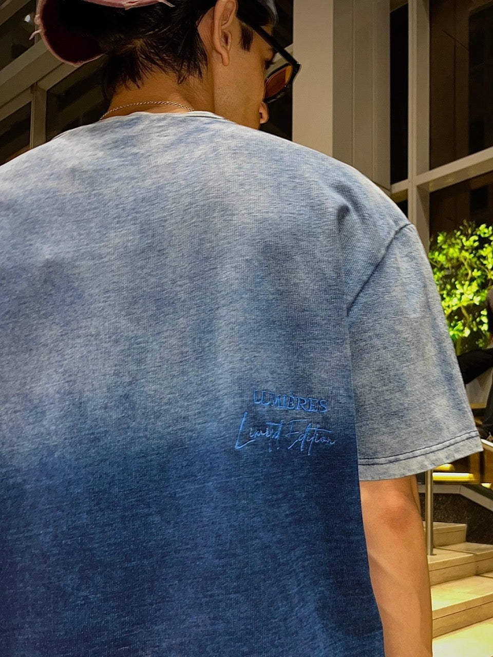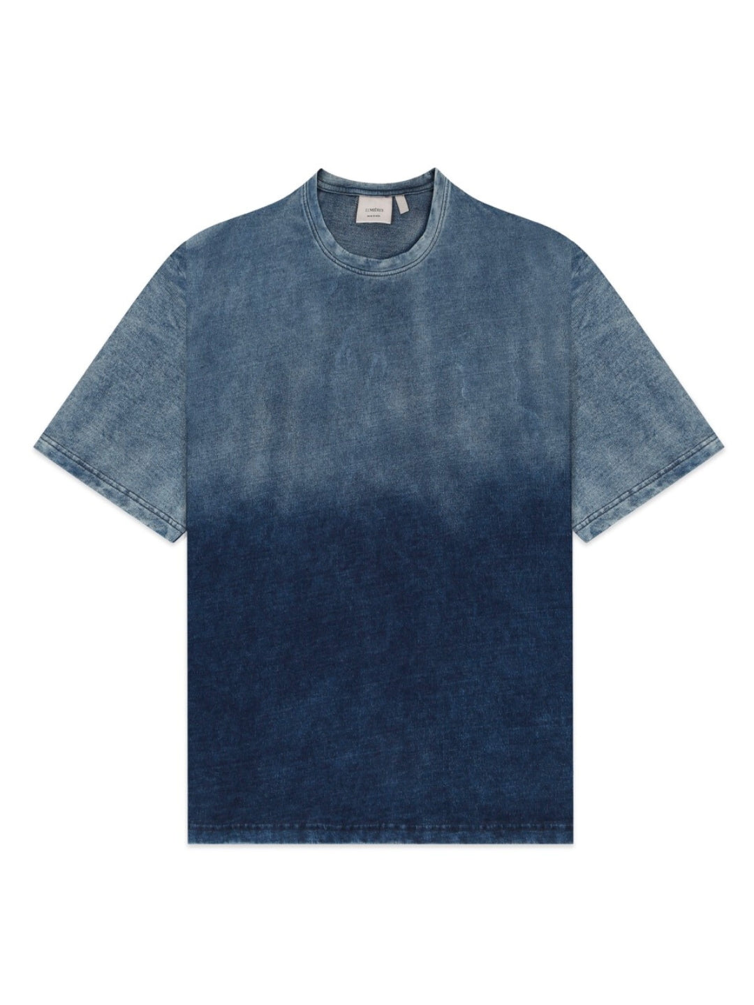 Limited Edition, Unisex Tee Indigo dyed featuring a sharp gradient cut that gives each piece a unique, worn-in vintage character. Crewneck and dropped sleeves. Contrast logo embroidered at Back.