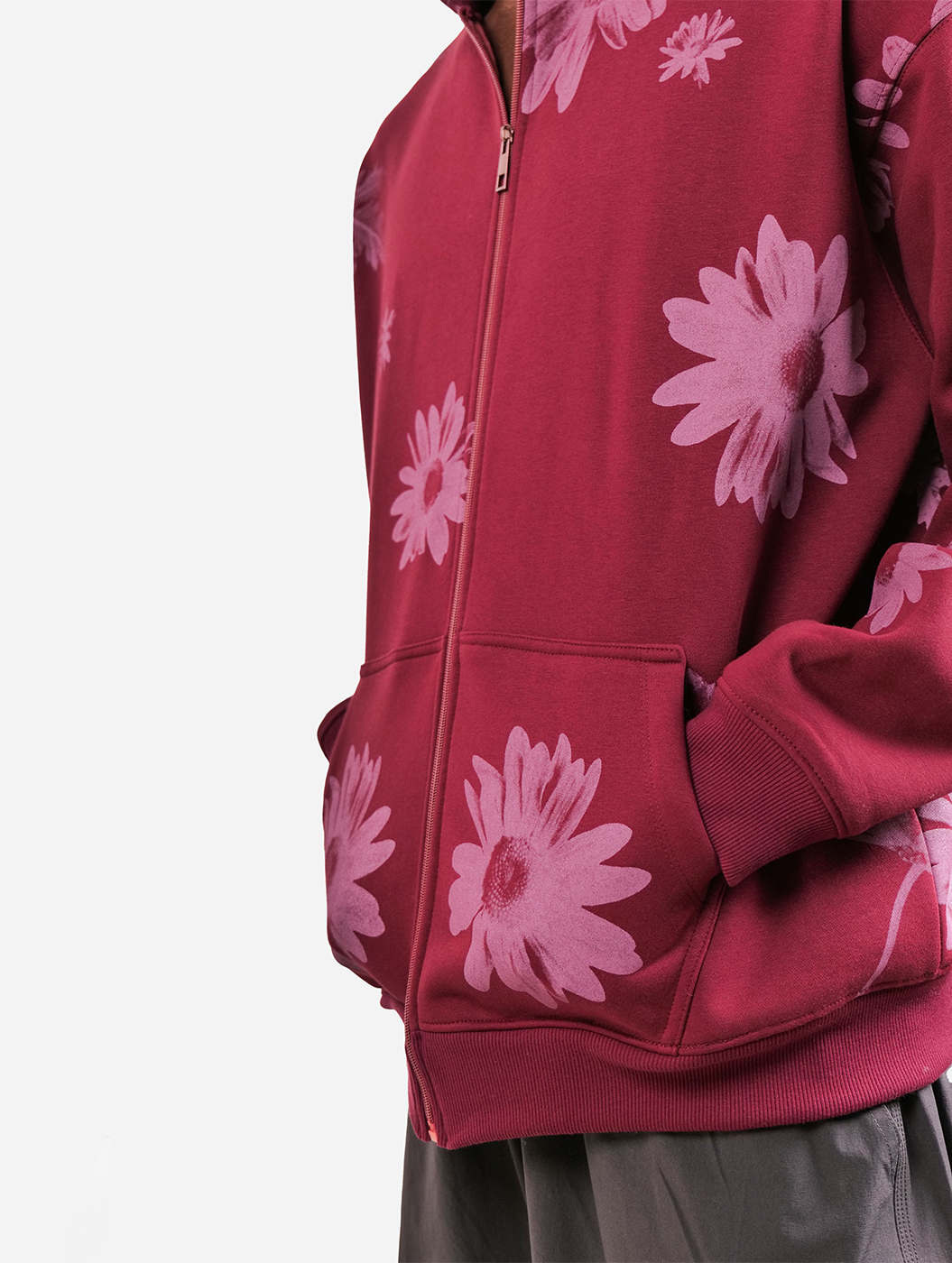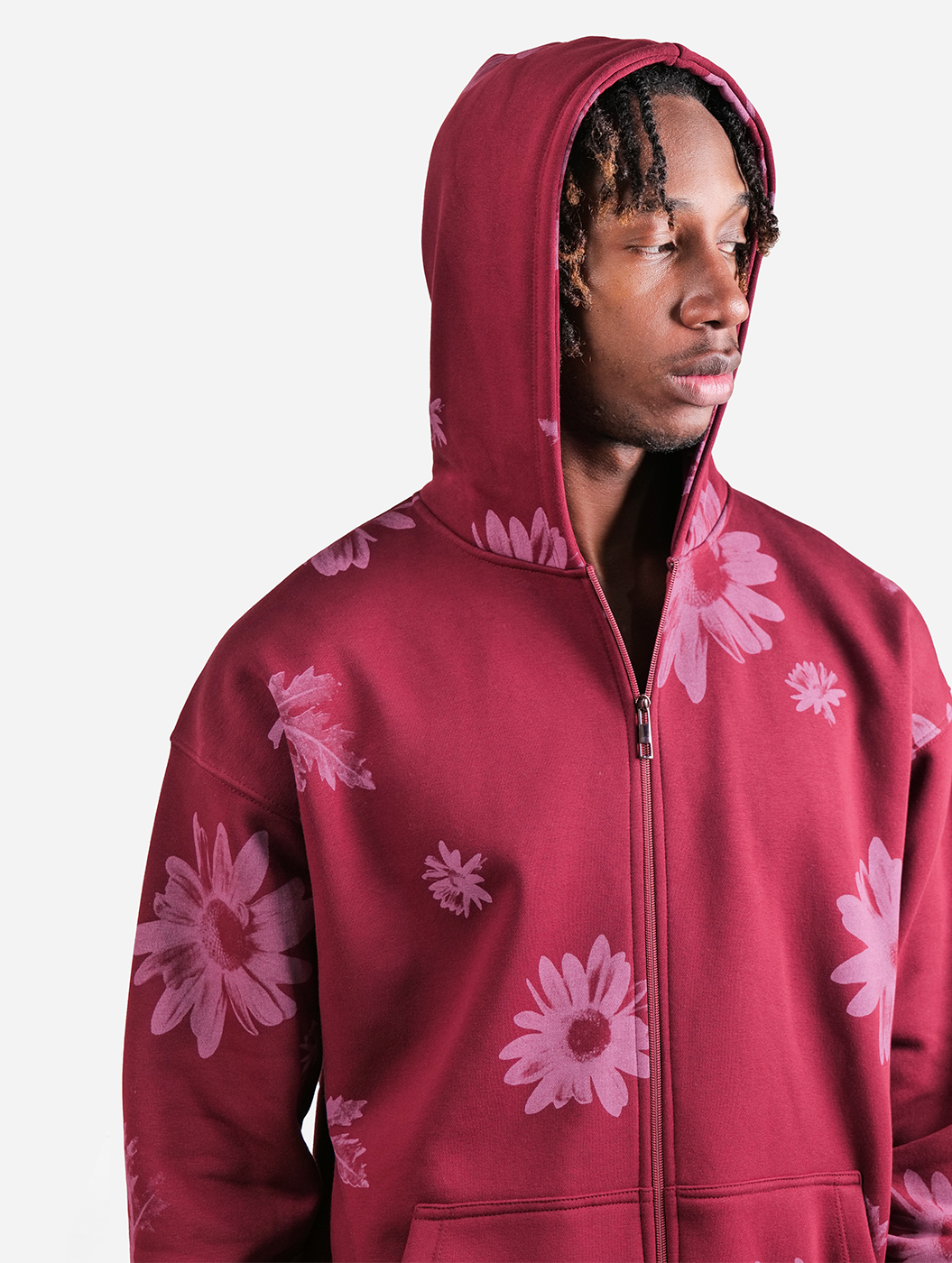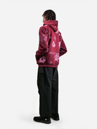 One Of A Kind - Wine All Over Floral Printed Drop Shoulder Oversized Zipper Hoodie
