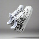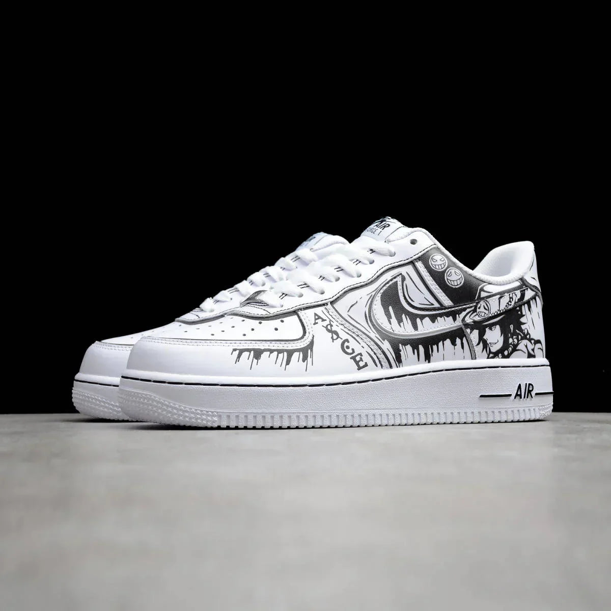 The One Piece AF1 B&W sneakers. Featuring hand-painted artwork from the iconic comic, these nike Af1s are sure to turn heads.