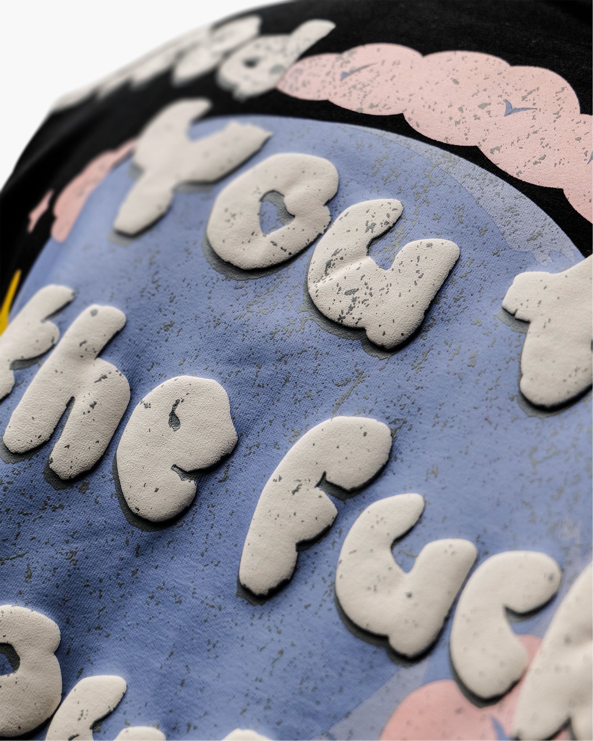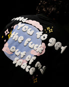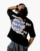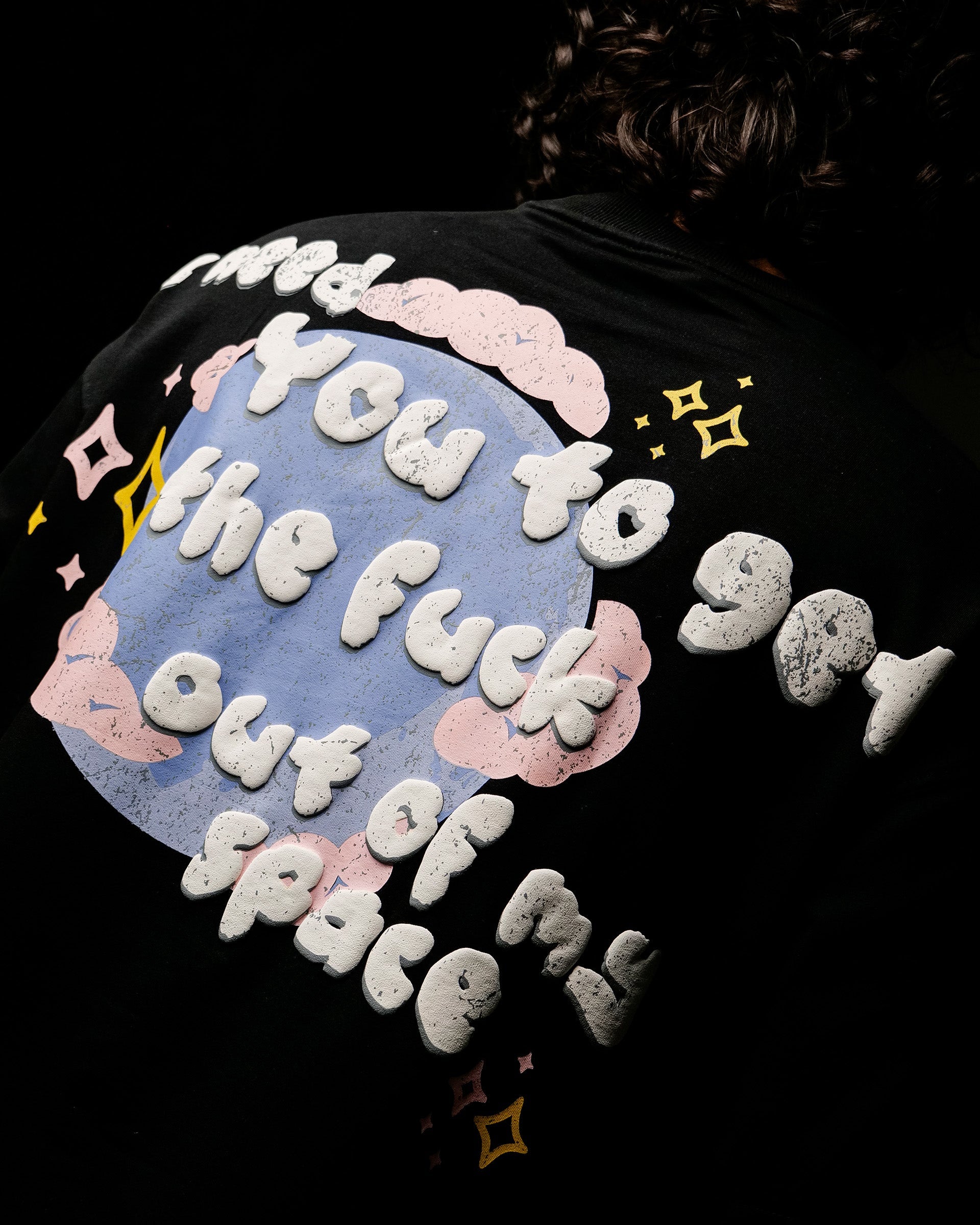 A premium oversized unisex t-shirt in jet black, crafted from heavyweight 260 GSM cotton spandex terry looper for unmatched softness and structure. Featuring a bold, multicolour puff print that reads “I need you to get the f*ck out of my space,” this tee blends humour, rebellion, and galactic vibes.