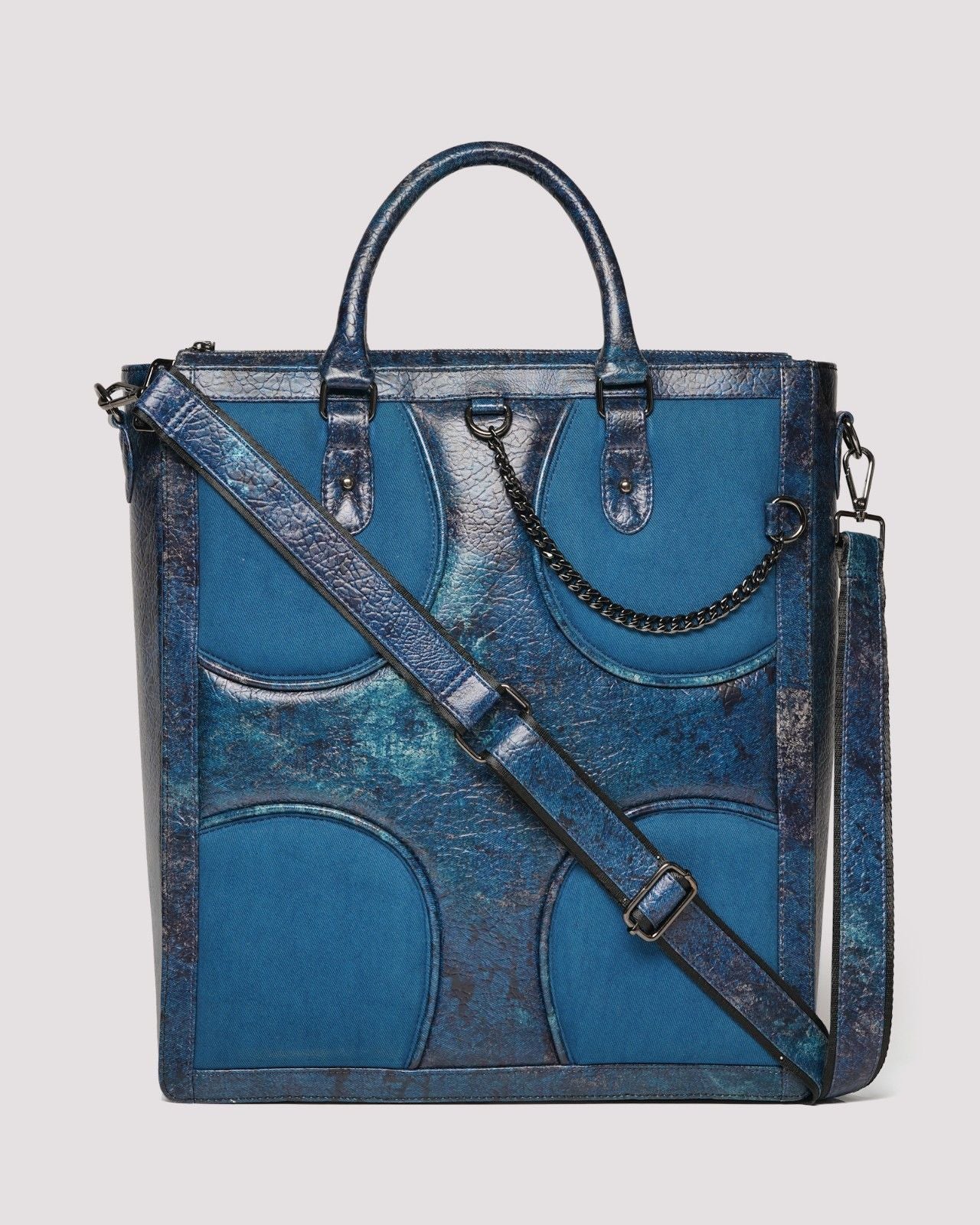 A tote that merges runway polish with grunge aesthetics. The bold front chain and muddled art detailing gives it a raw, streetwear vibe, while its oversized silhouette and premium build makes it luxury.