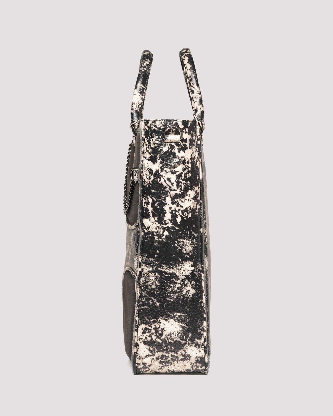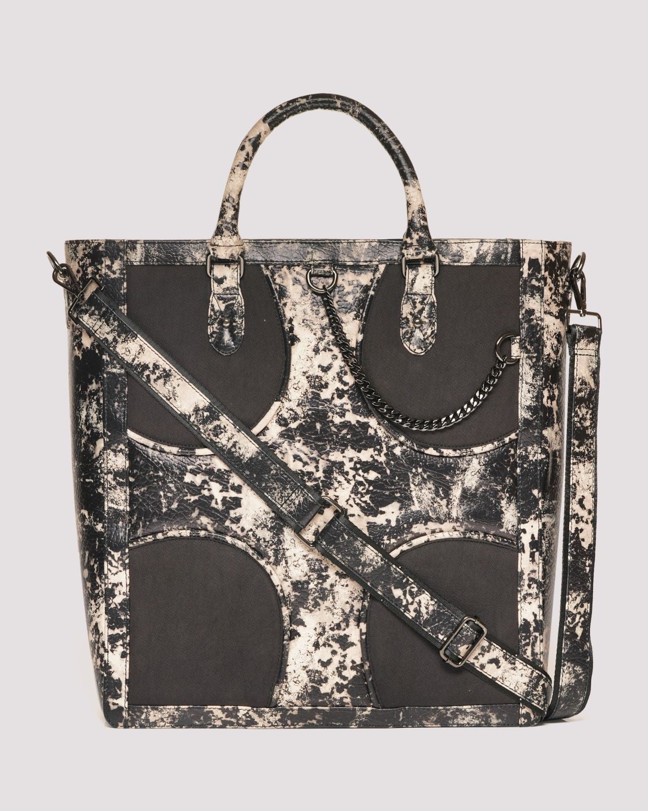 A tote that merges runway polish with grunge aesthetics. The bold front chain and muddled art detailing gives it a raw, streetwear vibe, while its oversized silhouette and premium build makes it luxury.