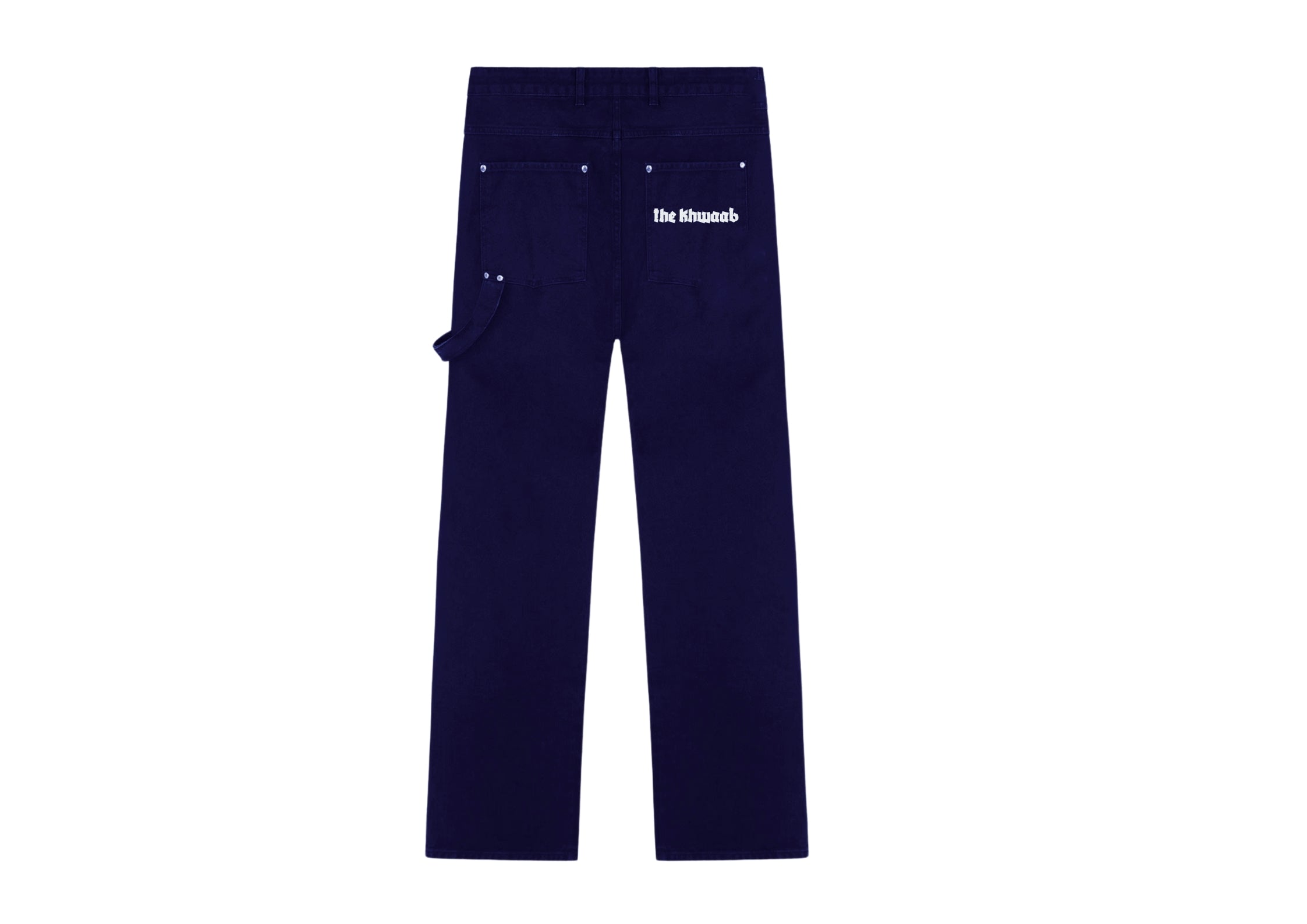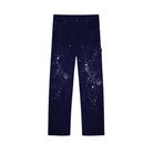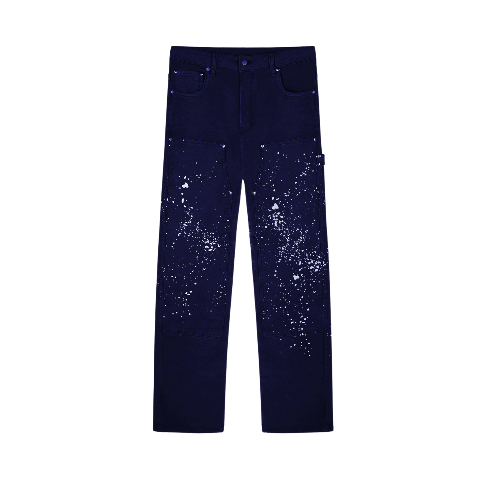 Introducing Paint Splatter Carpenter Pants in navy, a luxury pair of carpenter pants with a relaxed fit, crafted from soft and medium weight cotton twill. The bottoms have metal trims and carpenter details, with a brand logo to the rear pocket.