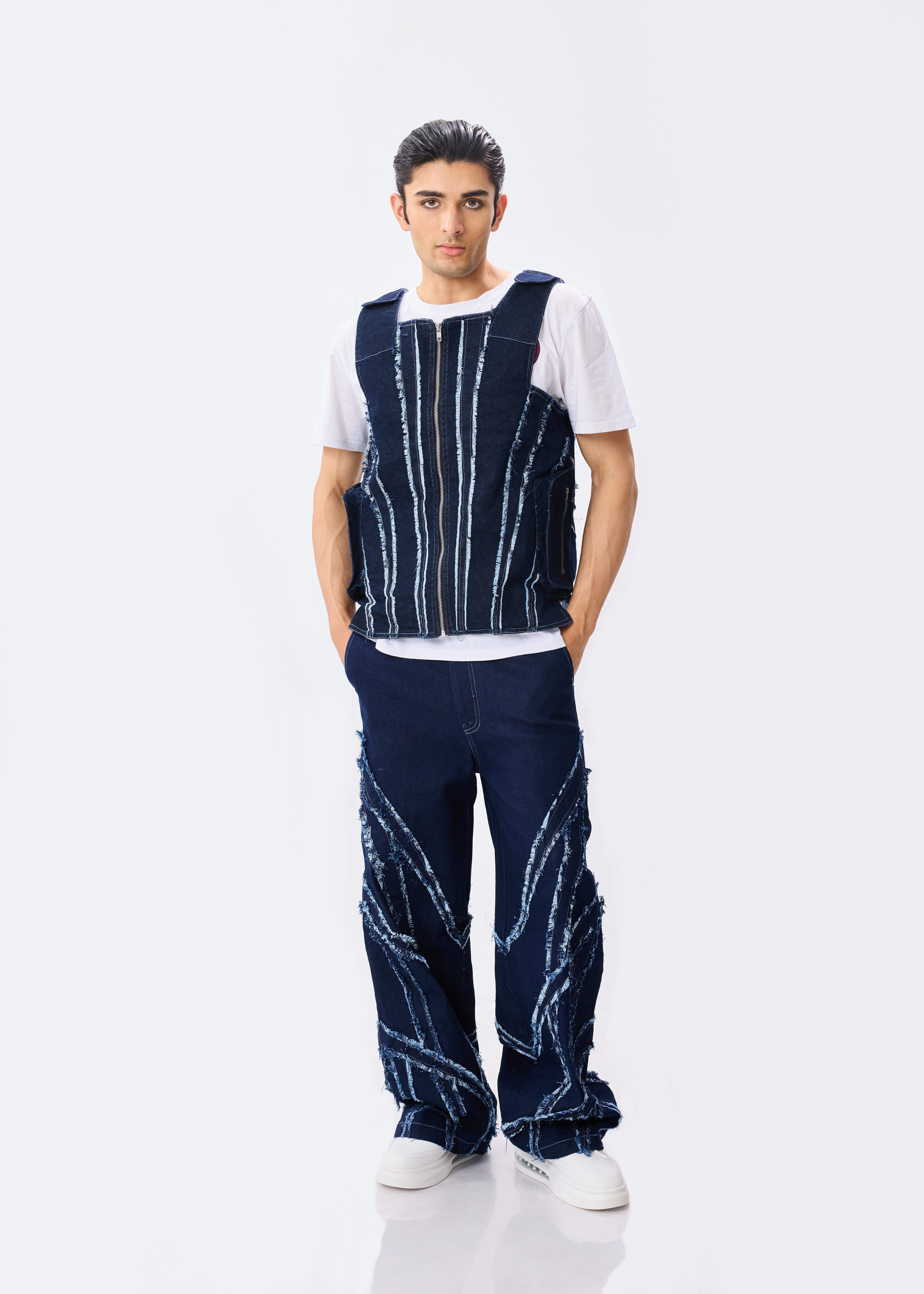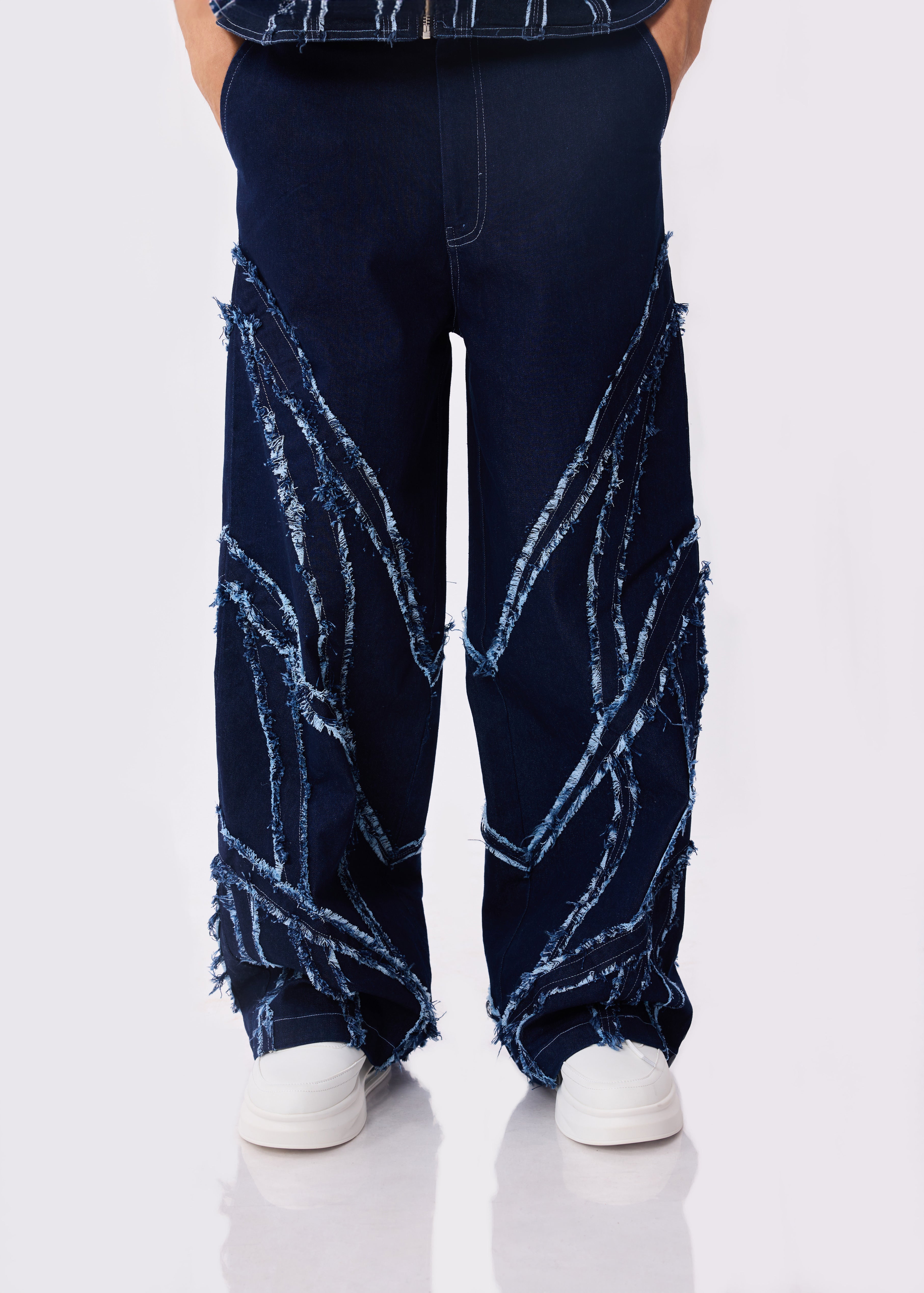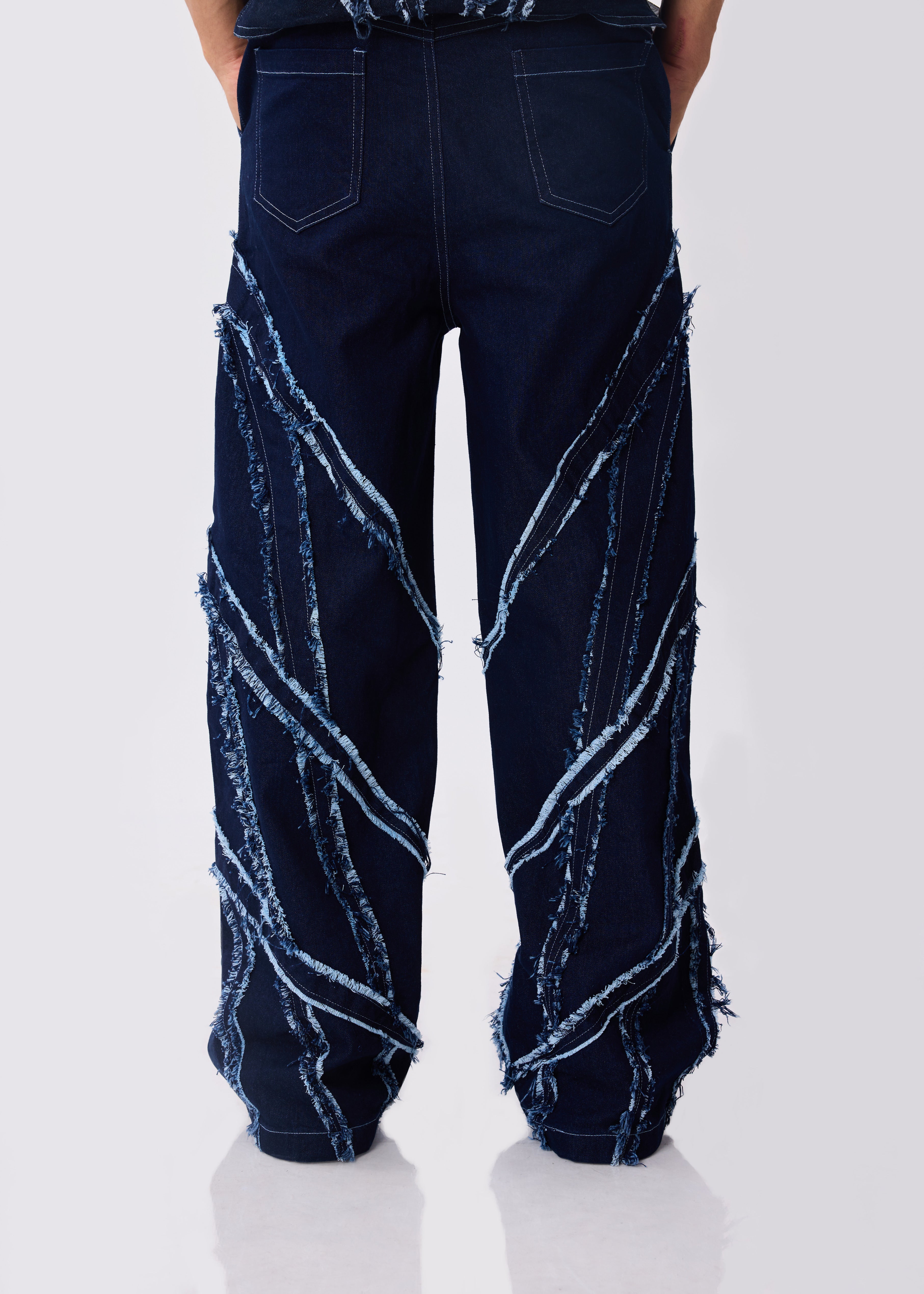 Made in premium raw denim fabric, this pair of jeans features unique panels of denims patched one on top of another to give an illusion, with raw edges and loose threads to give it a rugged look.