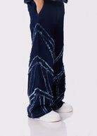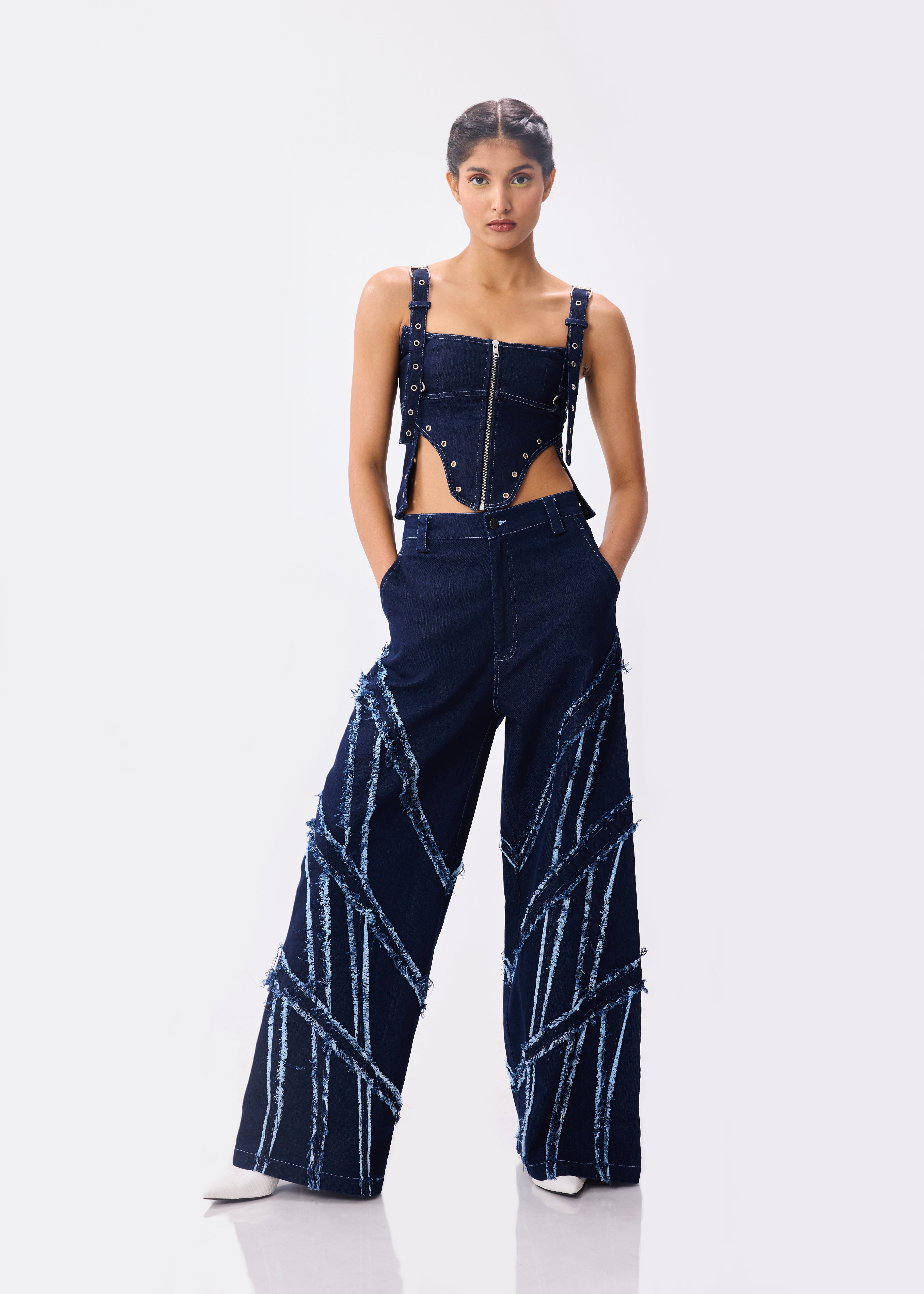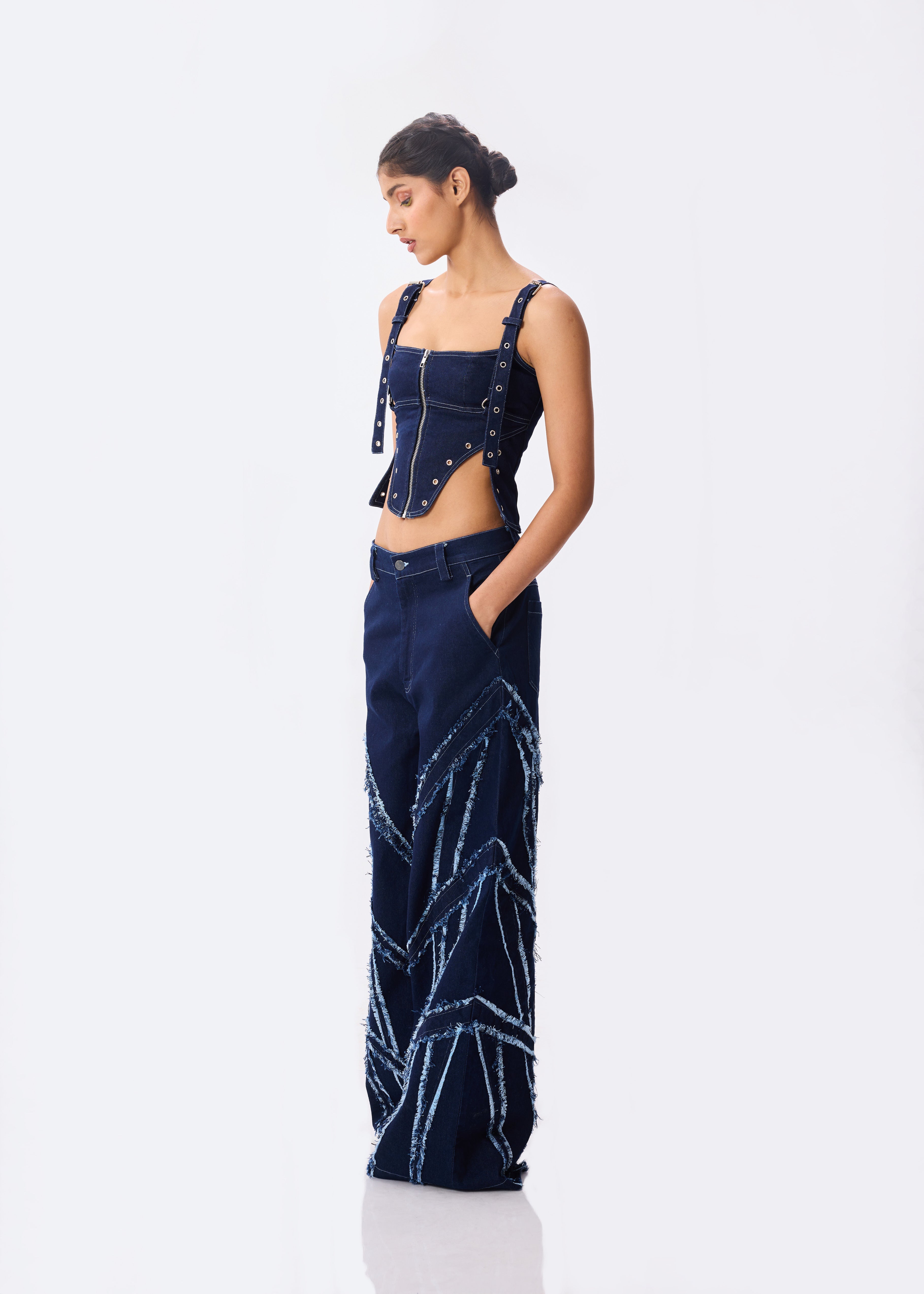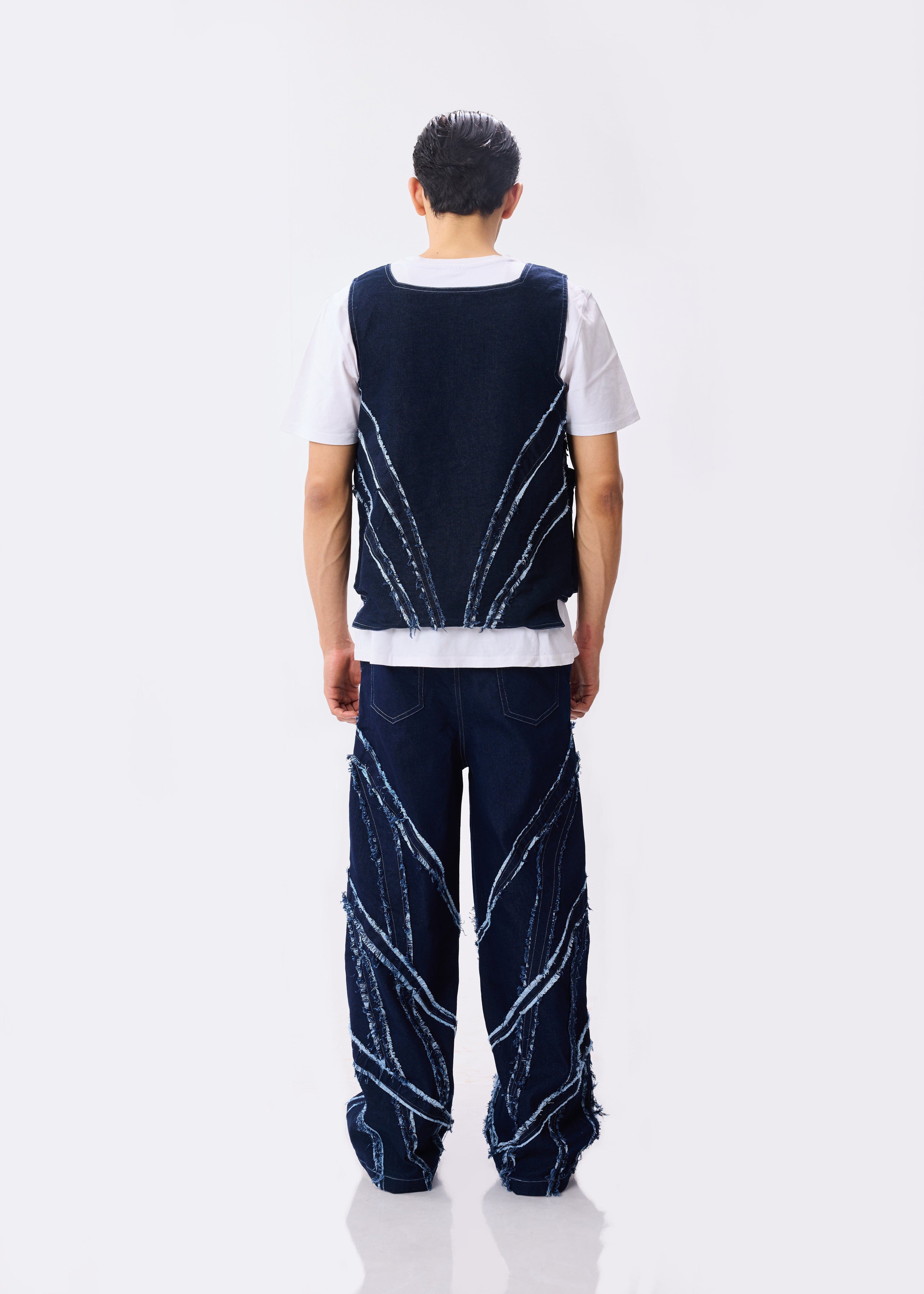 Made in premium raw denim fabric, this pair of jeans features unique panels of denims patched one on top of another to give an illusion, with raw edges and loose threads to give it a rugged look.