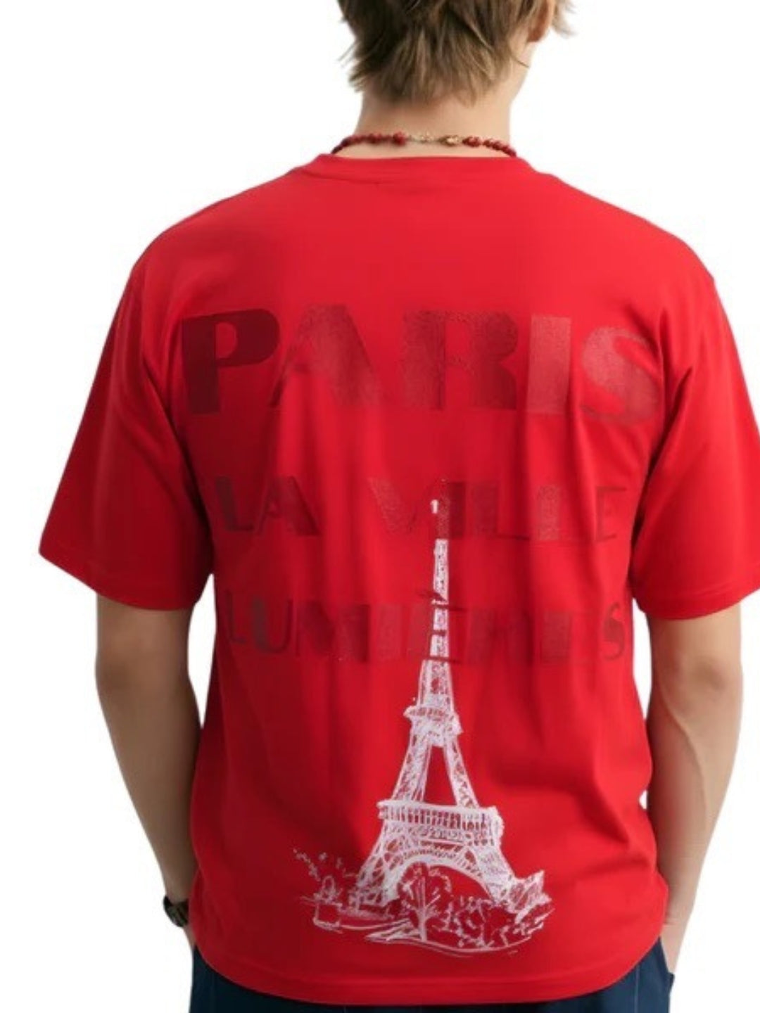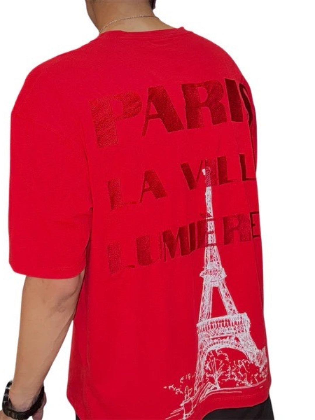 Paris Tee made using ISO-certified Pure Cotton, Piece-dyed for a rich red pigment featuring a solid red Front and bold Back design - the statement "PARIS LA VILLE LUMIÈRES" meaning "The City of Lights" - is rendered in over 76,000+ machine-guided stitches, a meticulous 3-hour embroidery job that would take a human infinitely longer to replicate. White Eiffel tower graphic in contrast against the vivid red canvas. Crewneck, dropped sleeves for a relaxed fit. This T-shirt, perhaps, is a wearable postcard from Paris, etched in detail, reflecting the timeless and romantic spirit of a city that never dims.