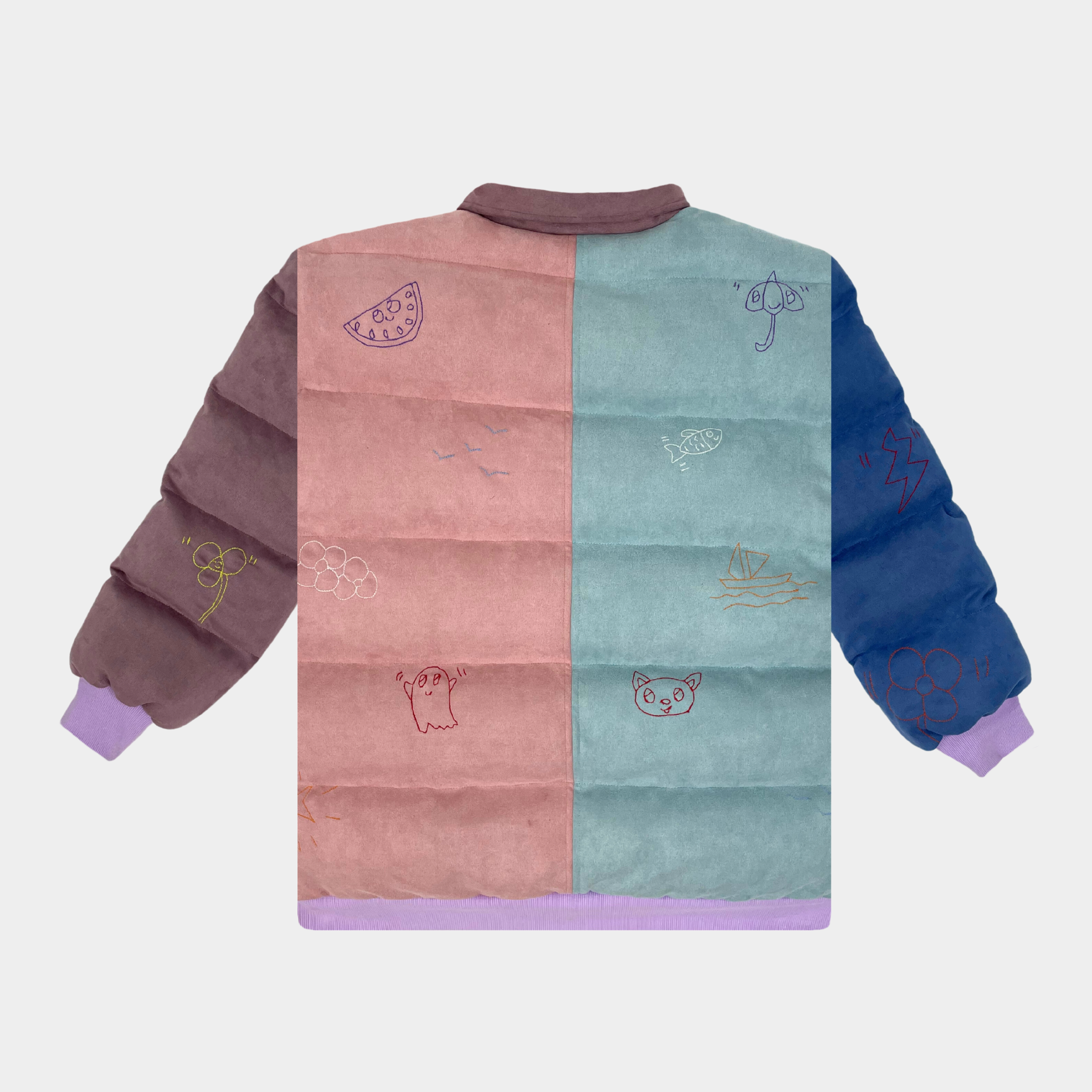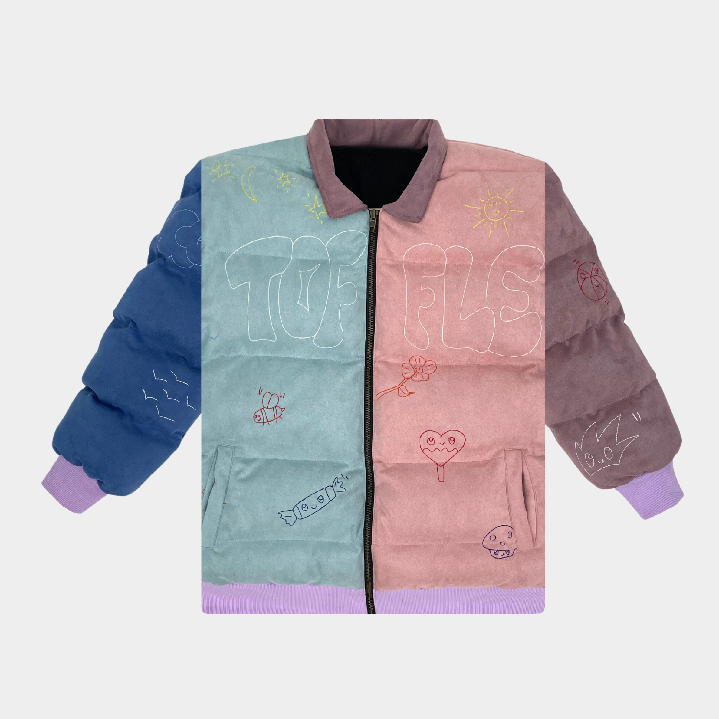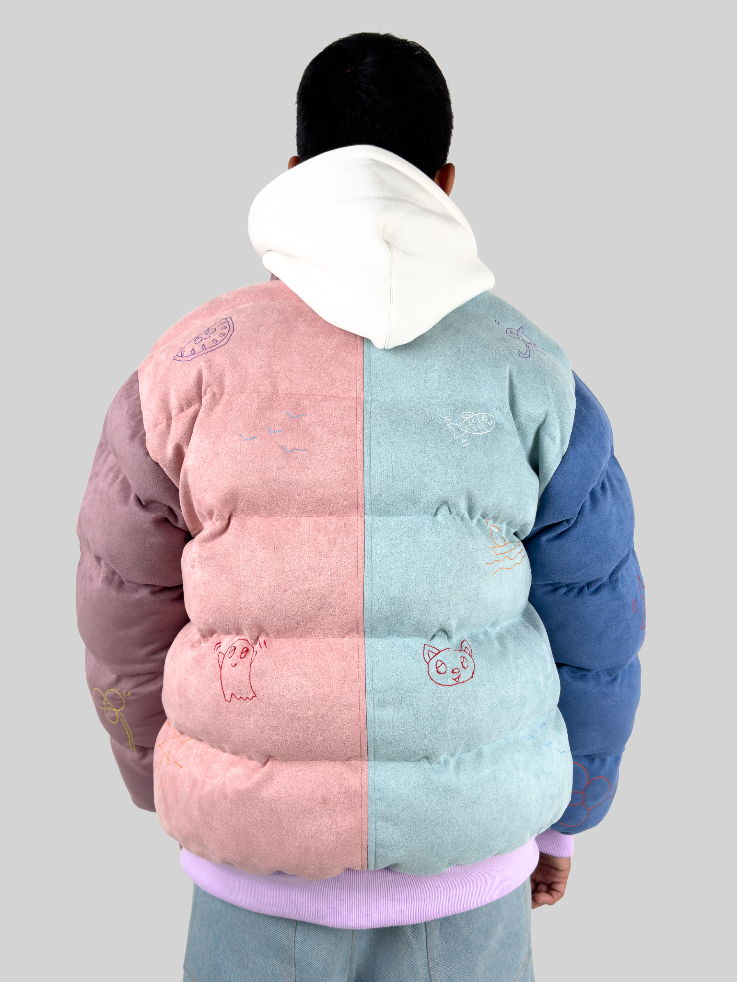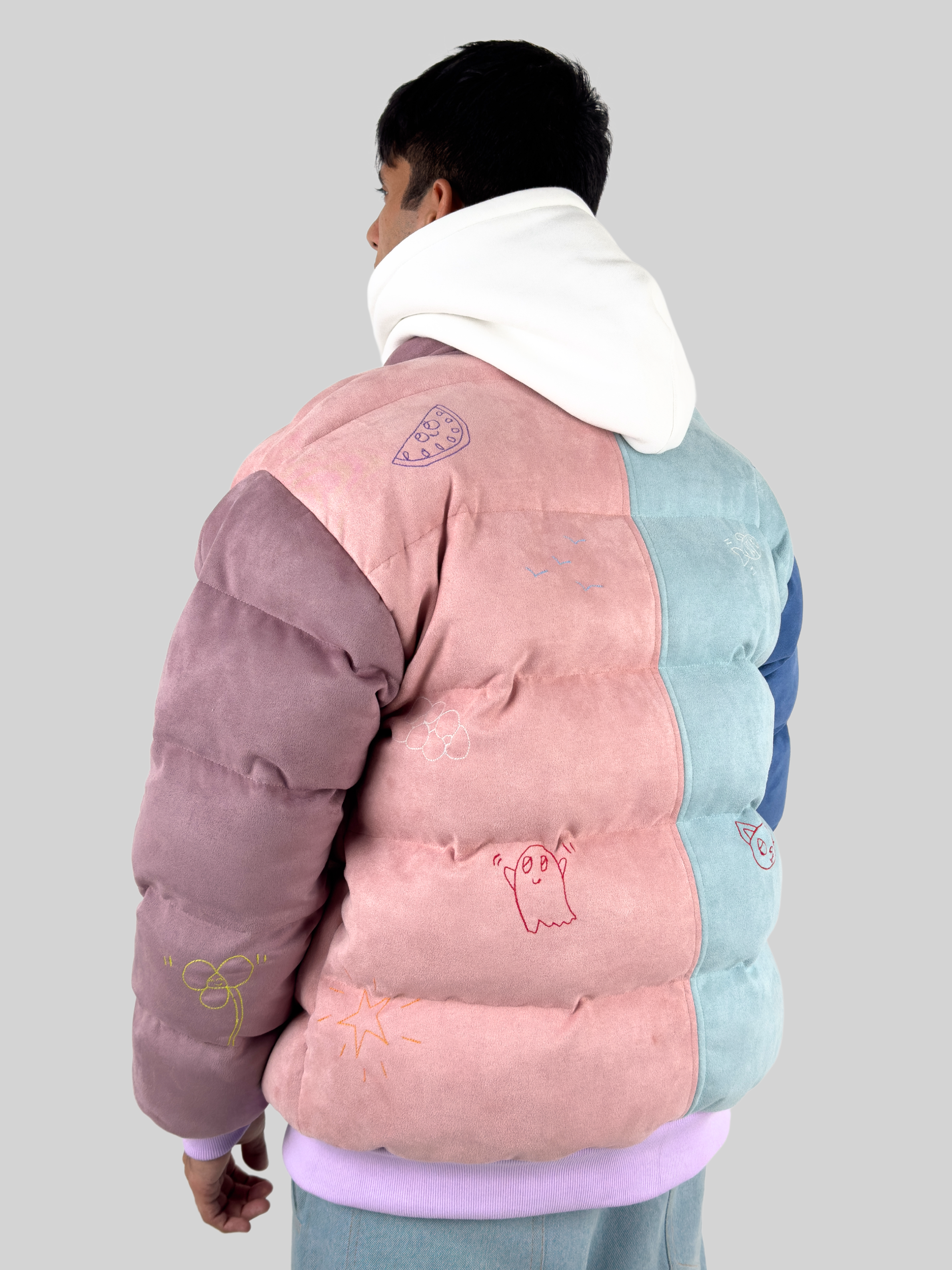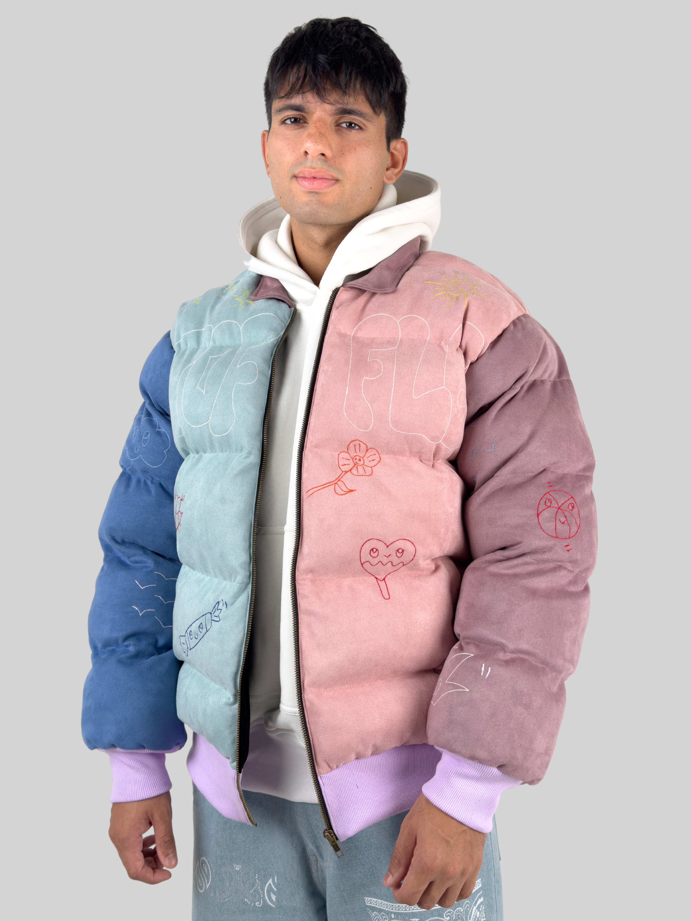 Toffle's take on puffer jackets with pastel shades of suede and soft inner lining with embroidered detailing across the piece.