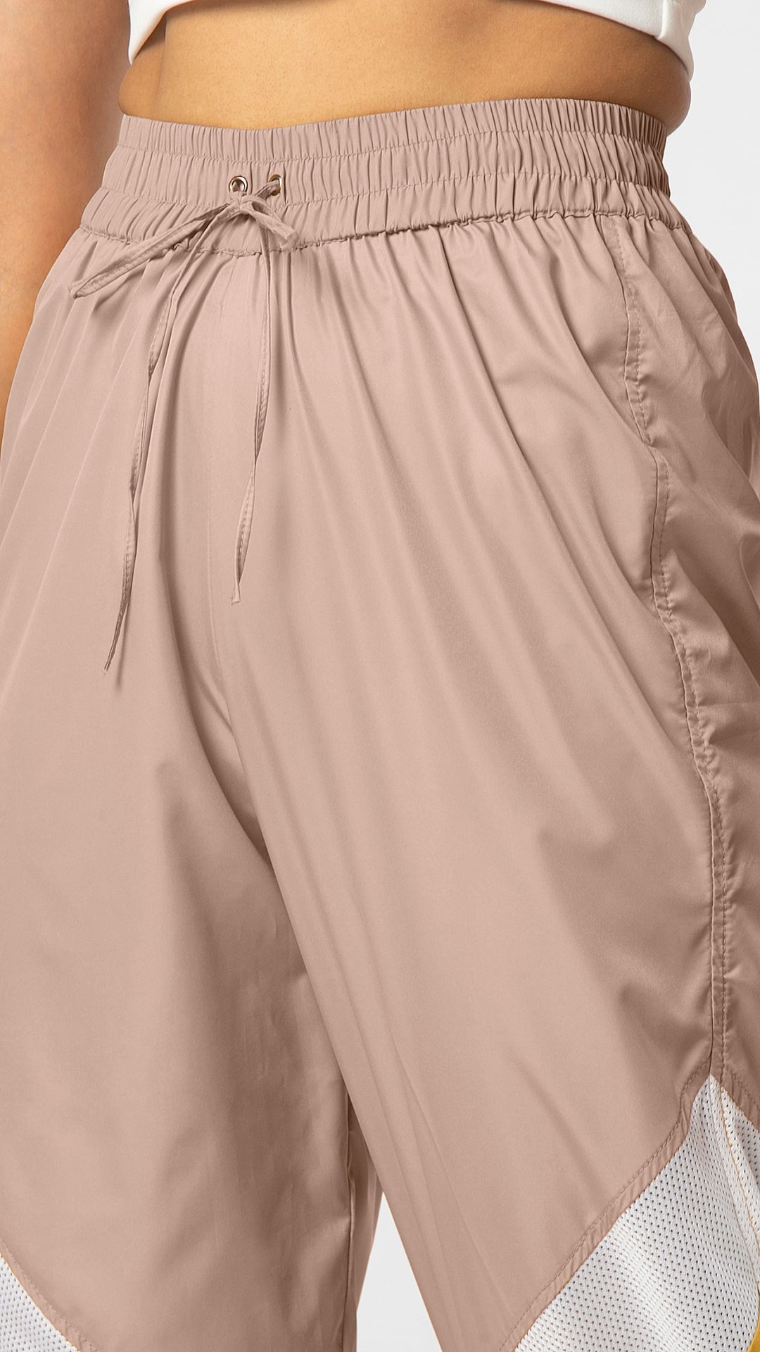 - Elastic at waist belt with drawstrings and hem for fit