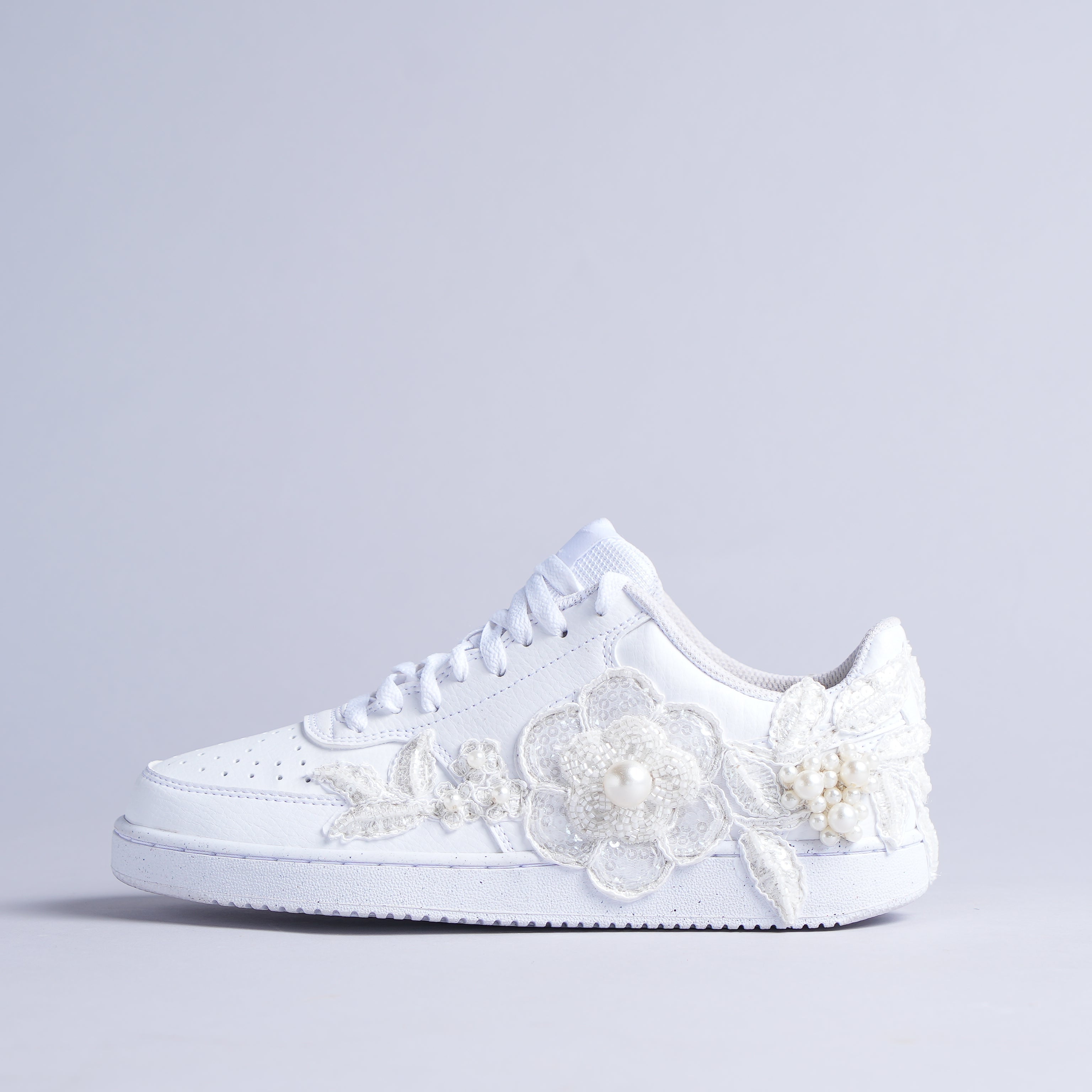 Get ready to strut down the aisle in style with the PEARL FLOWER AF1! These sneakers are perfect for weddings, featuring artfully crafted pearls and embroidered flowers. Not only do they add a touch of elegance to your outfit, but they also provide comfort for all-day wear. Step into the perfect combination of fashion and function with these unique kicks!
