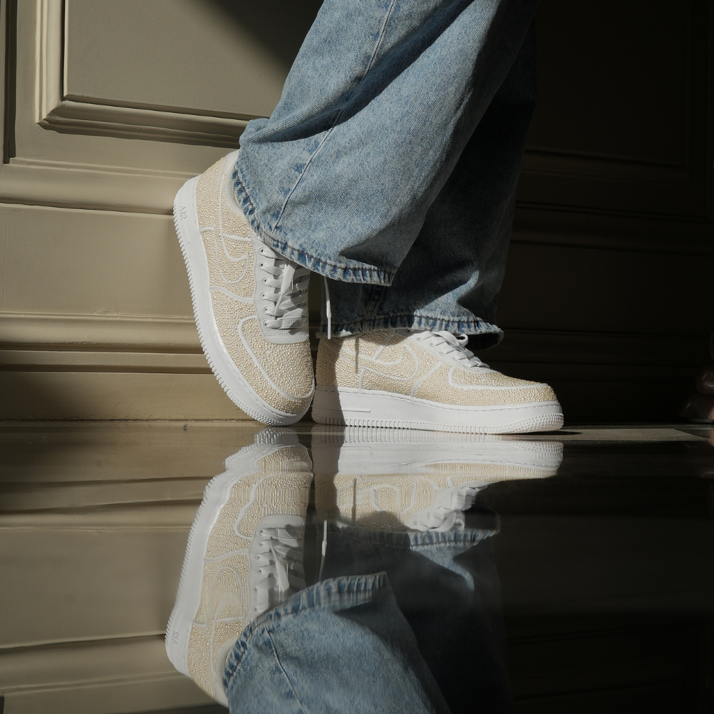 A masterful combination of craftsmanship and luxurious detail, the PEARL SWAROVSKI Air Force 1 is a bold statement piece, adorned with 10,000 hand-set glimmering Swarovski Pearls against a breathable white canvas backdrop.