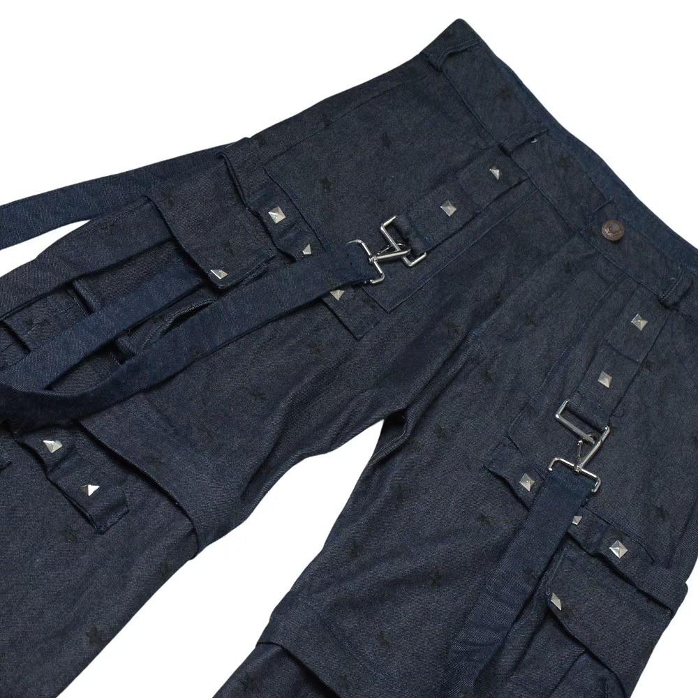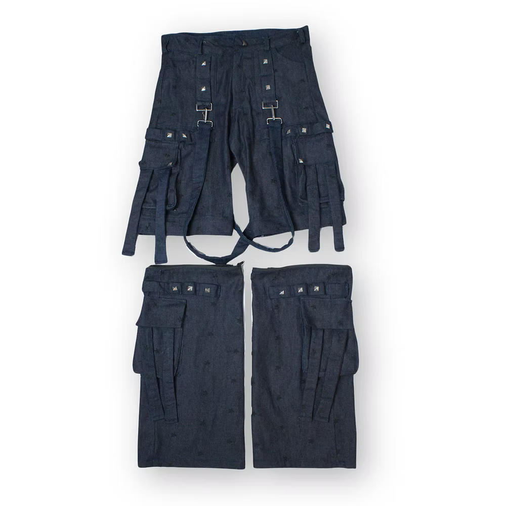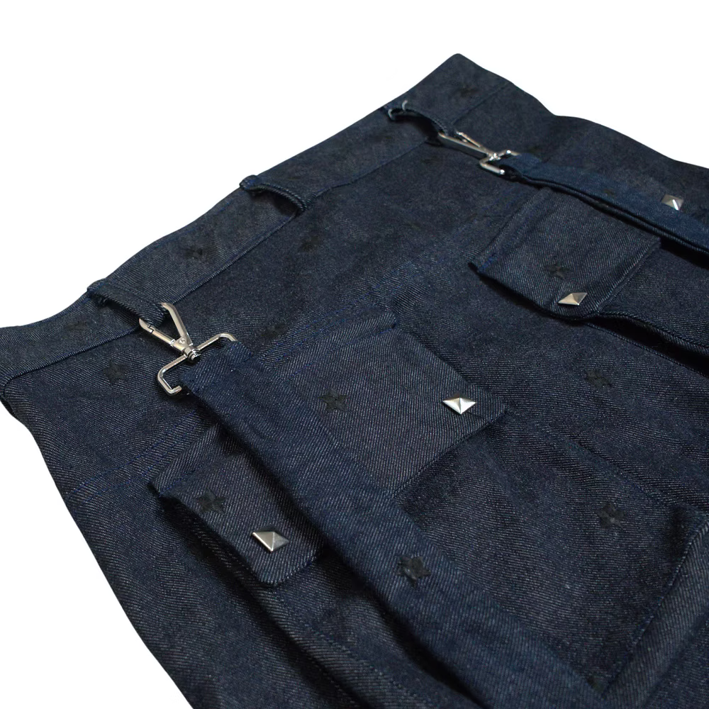 Crafted from premium black fabric with a traditional texture and glossy finish, "Piece of Gaudd 2" is a unique denim masterpiece. Its standout feature? Double knee patches adorned with silver, big rounded rivets, adding industrial elegance to its rugged charm. From the workshop to the city streets, embrace individuality with this exclusive creation from Gauddly.