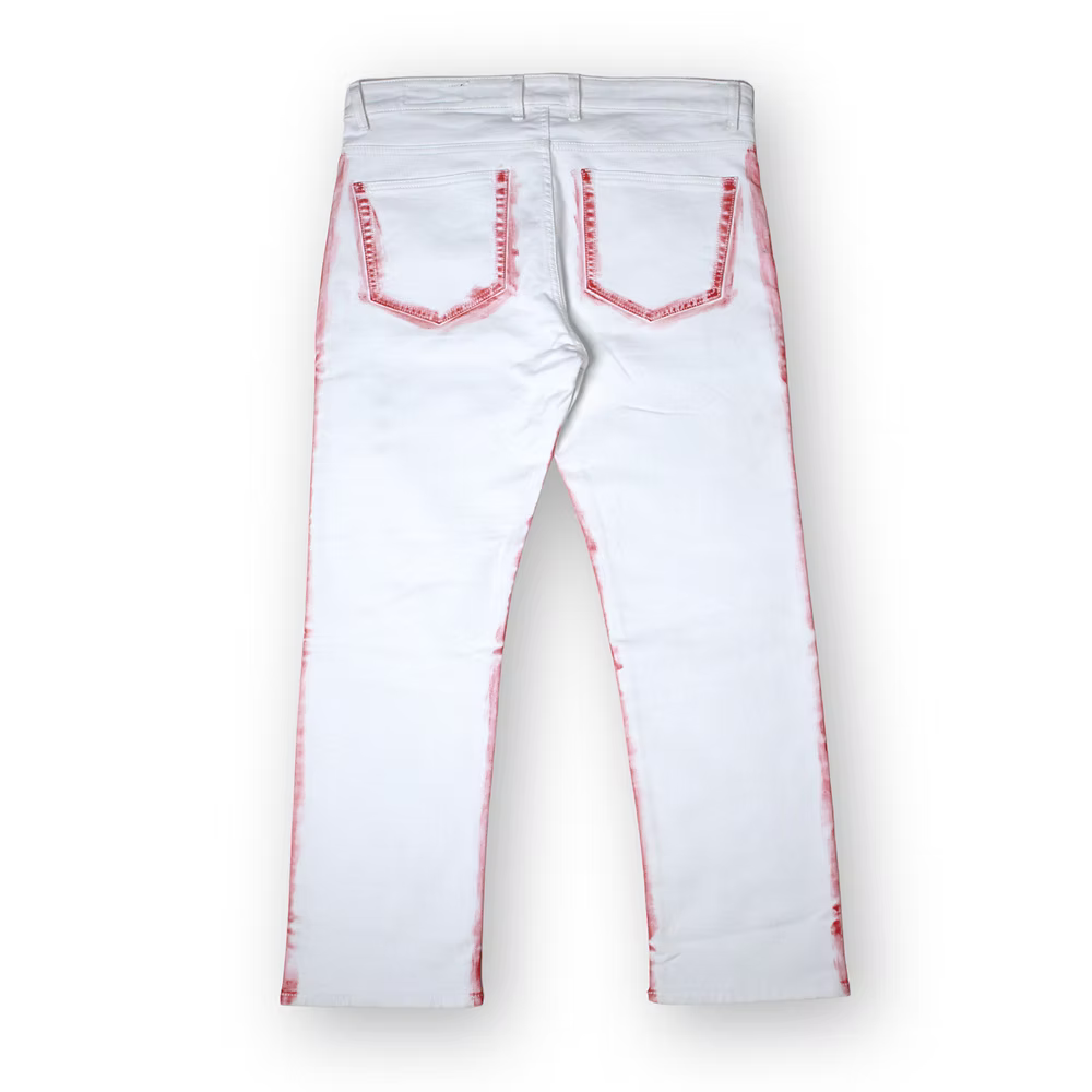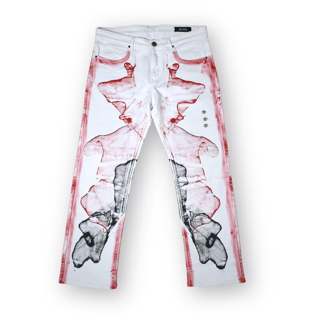 where the raw energy of rebellion meets the haunting allure of history. Inspired by the tumultuous spirit of times past, each pair echoes the chaos and creativity of an era defined by its defiance. Hand-painted with a bold red hue reminiscent of the blood spilled in the wake of societal upheaval, these jeans capture the essence of defiance and revolution.