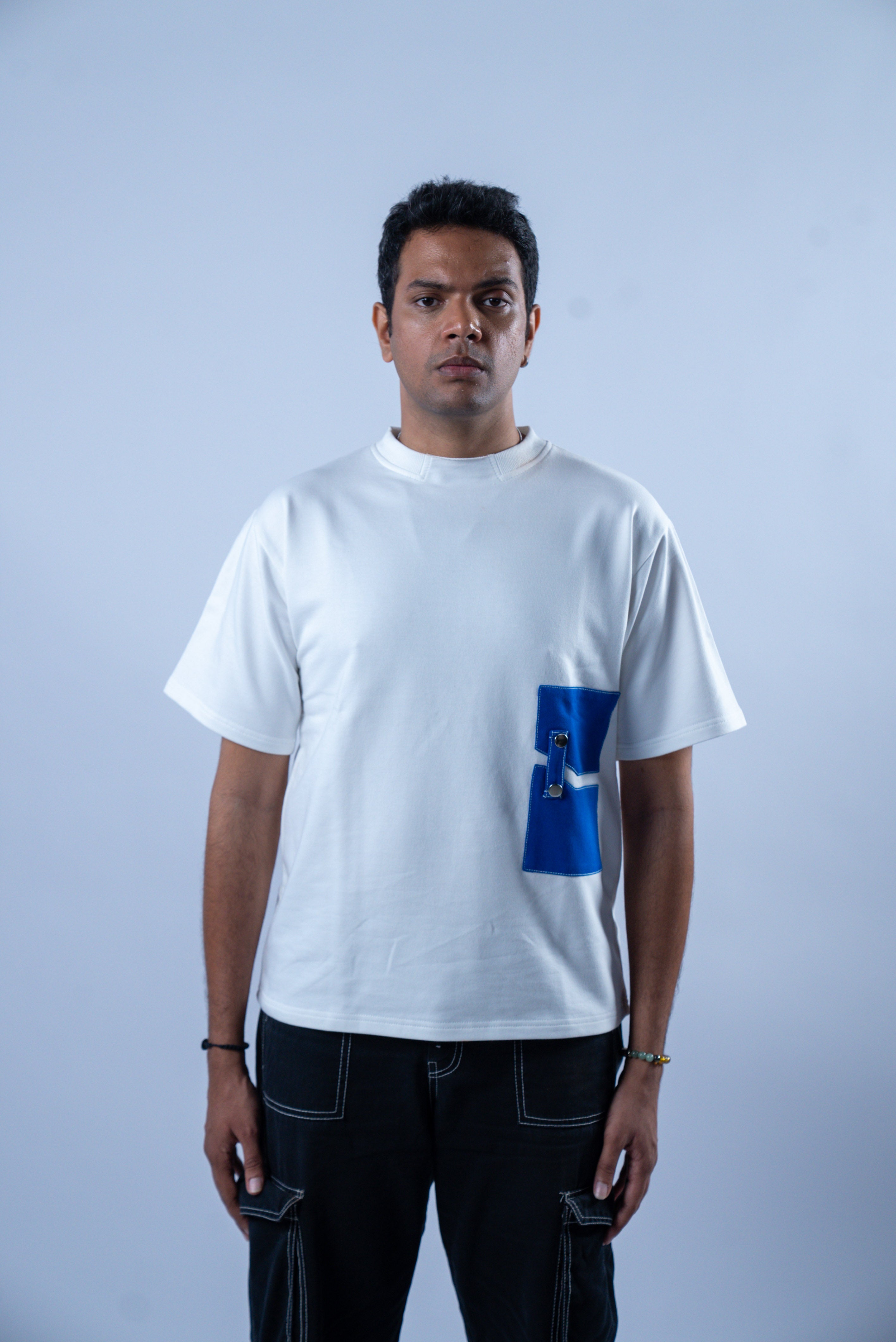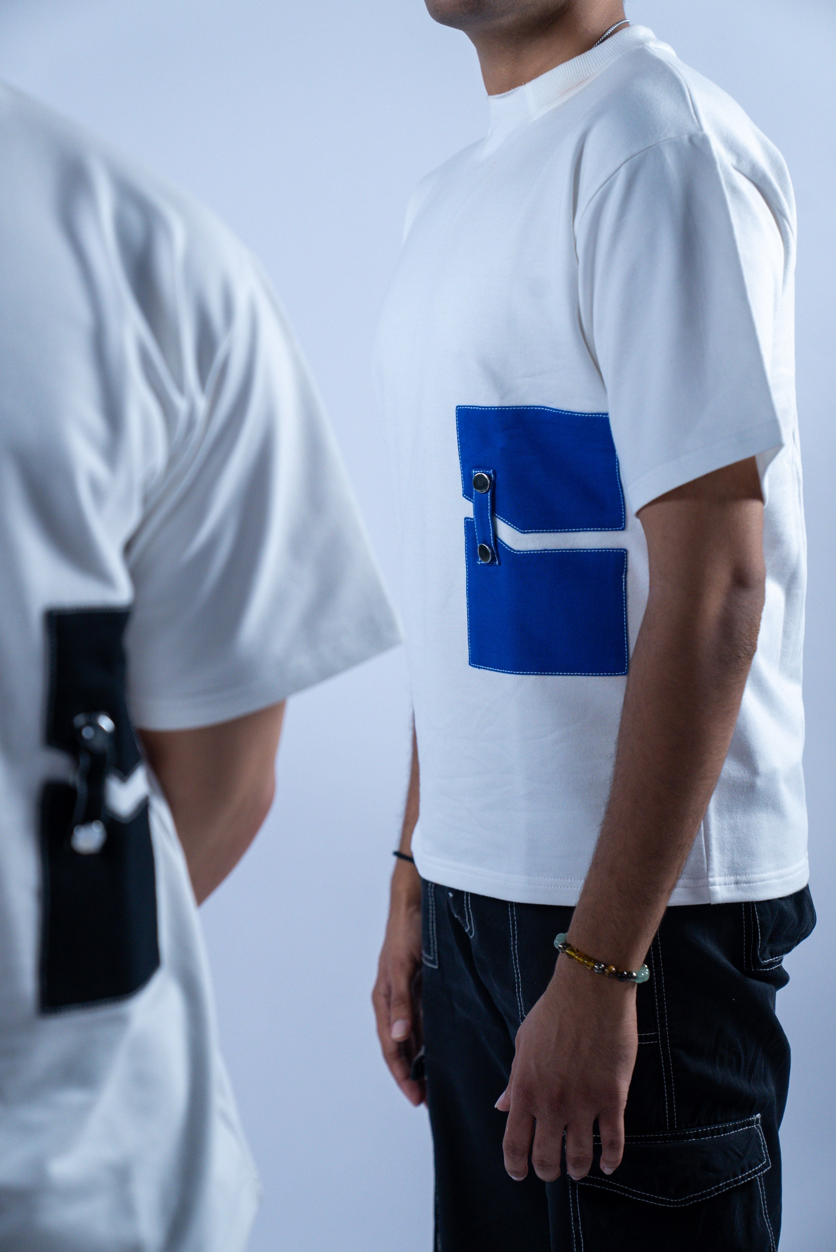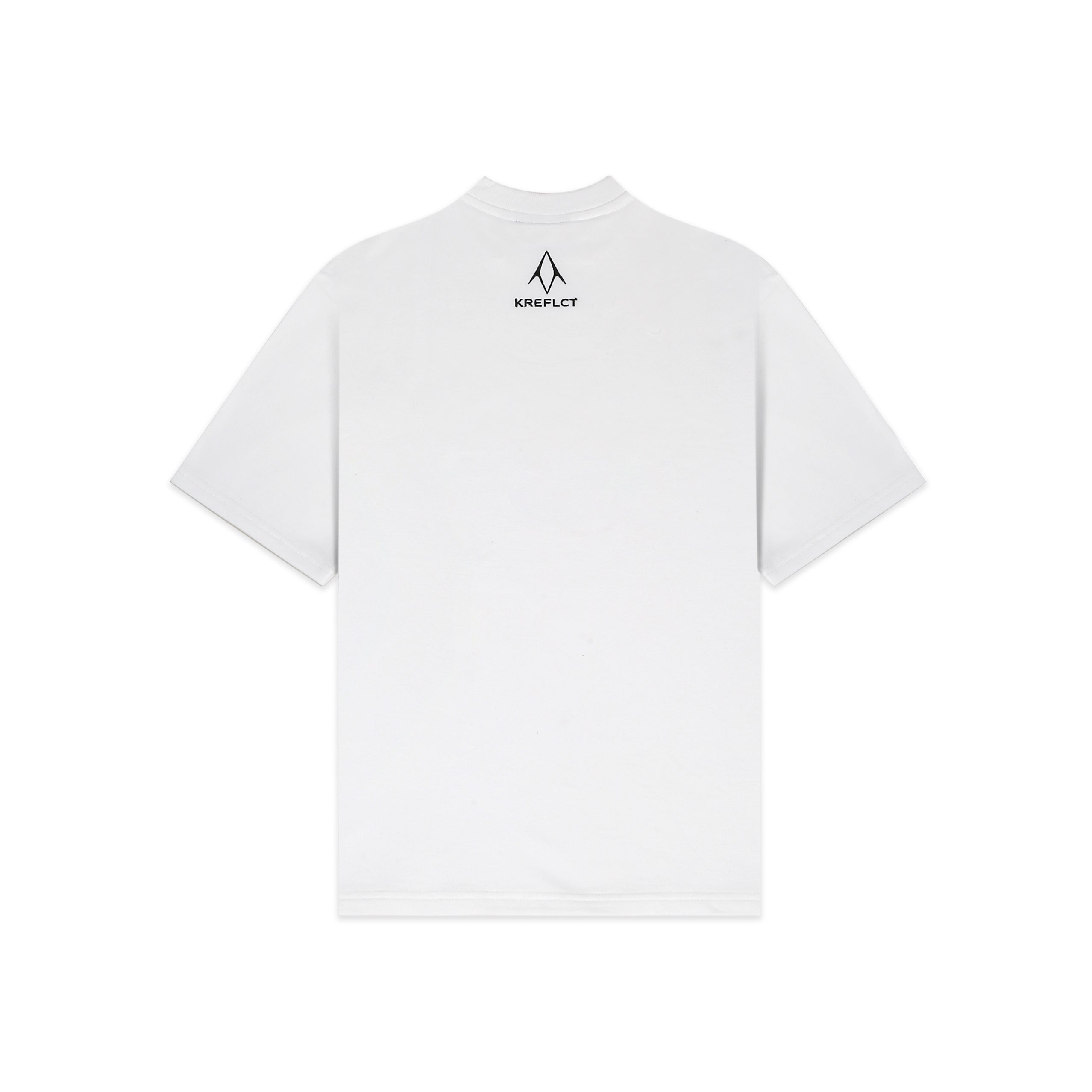 Elevate your wardrobe with this Kreflct’s Pocket? Tee. The front features a bold, stylized pocket patch in a striking contrast color, enhanced with a loop and button detailing. The standout feature of this piece is the innovative half-and-half collar design - part ribbed, part smooth, adding a twist to the classic t-shirt silhouette.