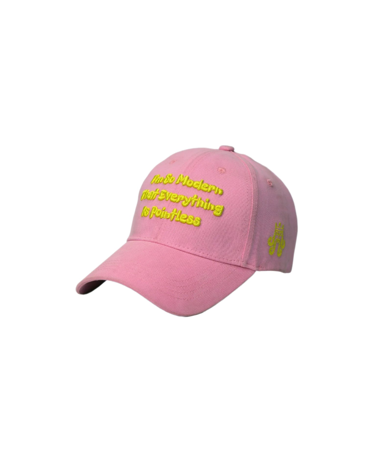 Emblazoned across the cap is the empowering phrase, "I'm so modern that everything is pointless," in eye-catching neon green 3D embroidery. This statement captures the avant-garde spirit of today's creatives, challenging norms and embracing the unconventional.
