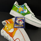 Get your sneaker game to the next level with Pokemon af1. These hand painted Nike af1s feature iconic Pokemon characters, psyduck and warturtle, on each pair. The matching yellow/orange and yellow/green swoosh adds a playful touch. Catch 'em all while rocking these unique kicks!