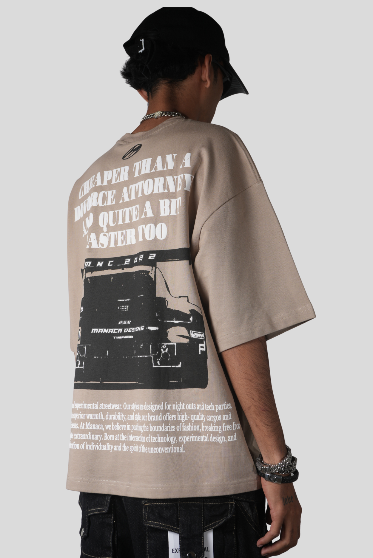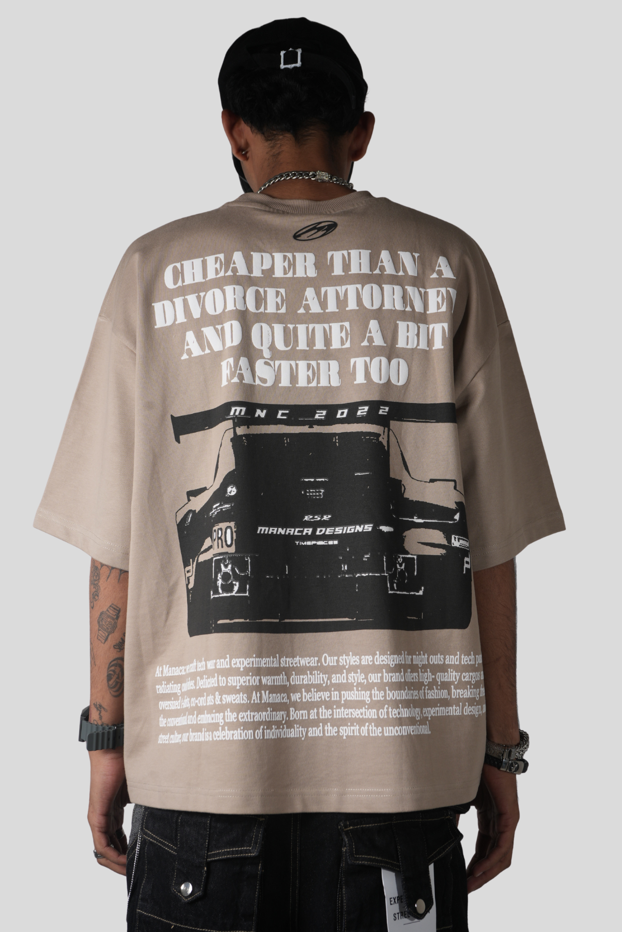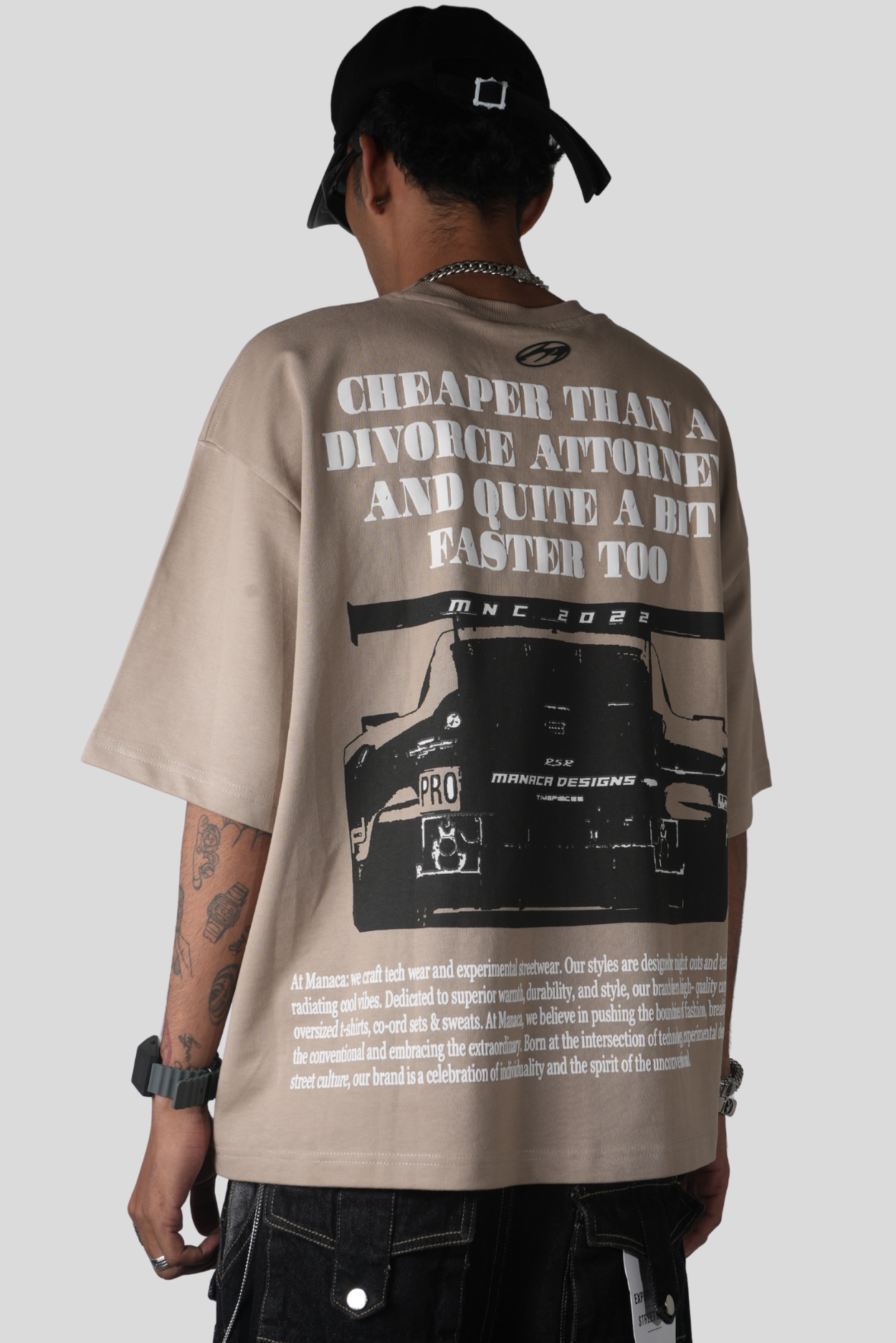 Streetwear just hit the fast lane. The PORCHE tee is MANACA’s full-throttle tribute to racing culture with a satirical twist. The back features a wide-body race car graphic stamped with “CHEAPER THAN A DIVORCE ATTORNEY AND QUITE A BIT FASTER TOO” — a cold, blunt statement that hits harder than any track time. Below it, brand manifesto text adds depth to the chaos. On the front, a sharp MANACA logo rides up center chest while the hemline carries racing iconography and MNC IDENTITY hits. Neutral tones, high horsepower.