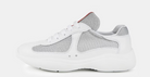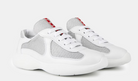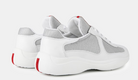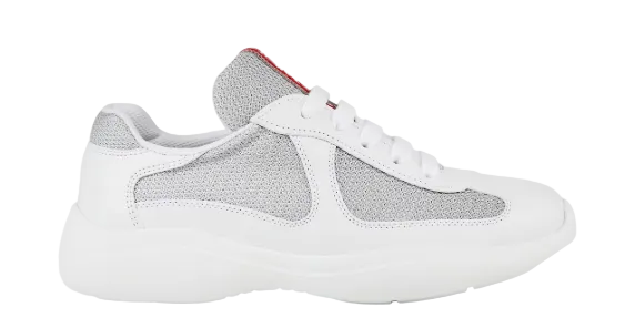Prada's iconic Americas Cup trainers blend sport and luxury to redefine women's footwear. These low-top runners feature premium leather and mesh panels for breathability, making them ideal for weekend errands or casual outings. The signature designer logo on the tongue adds a refined touch to these versatile fashion trainers. Product Highlights - Premium leather and mesh panels strategically placed throughout the upper ensure optimal breathability and durability - Distinctive Prada logo detailing prominently featured on the tongue offers authentic brand recognition - Rubber sole provides reliable traction and comfort for all-day wear, while the lace-up closure ensures a secure fit - Quality materials including leather and textile lining maintain shape and comfort with regular wear