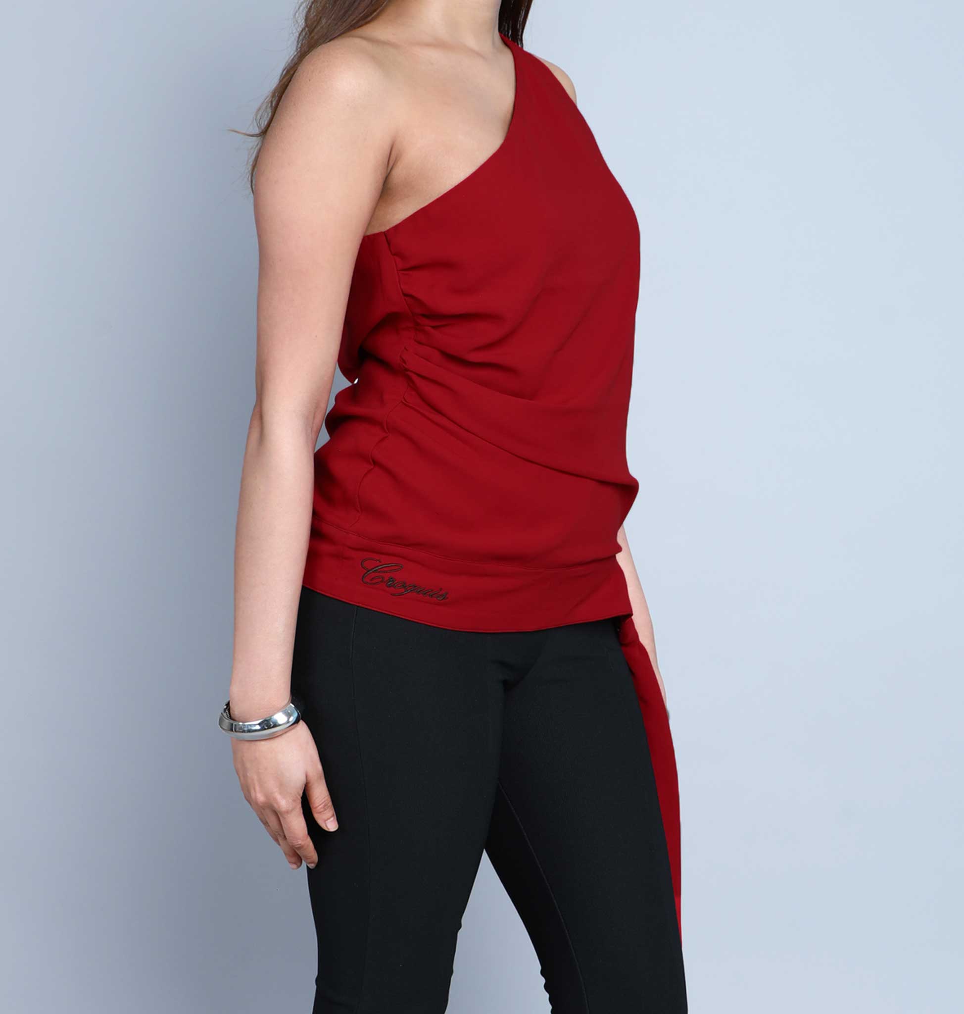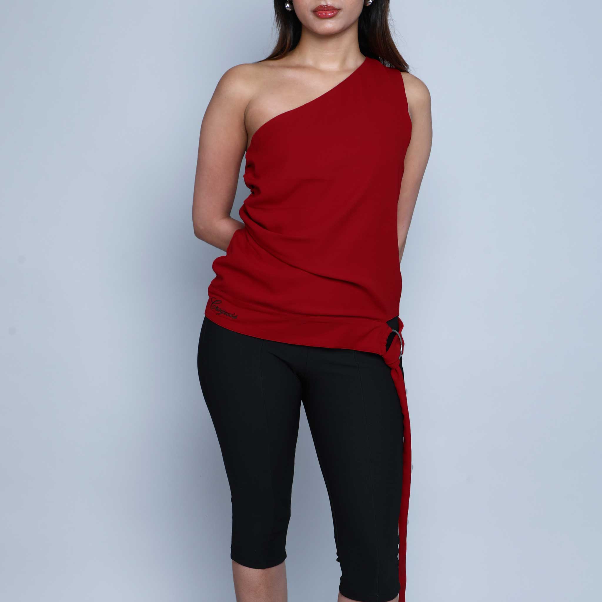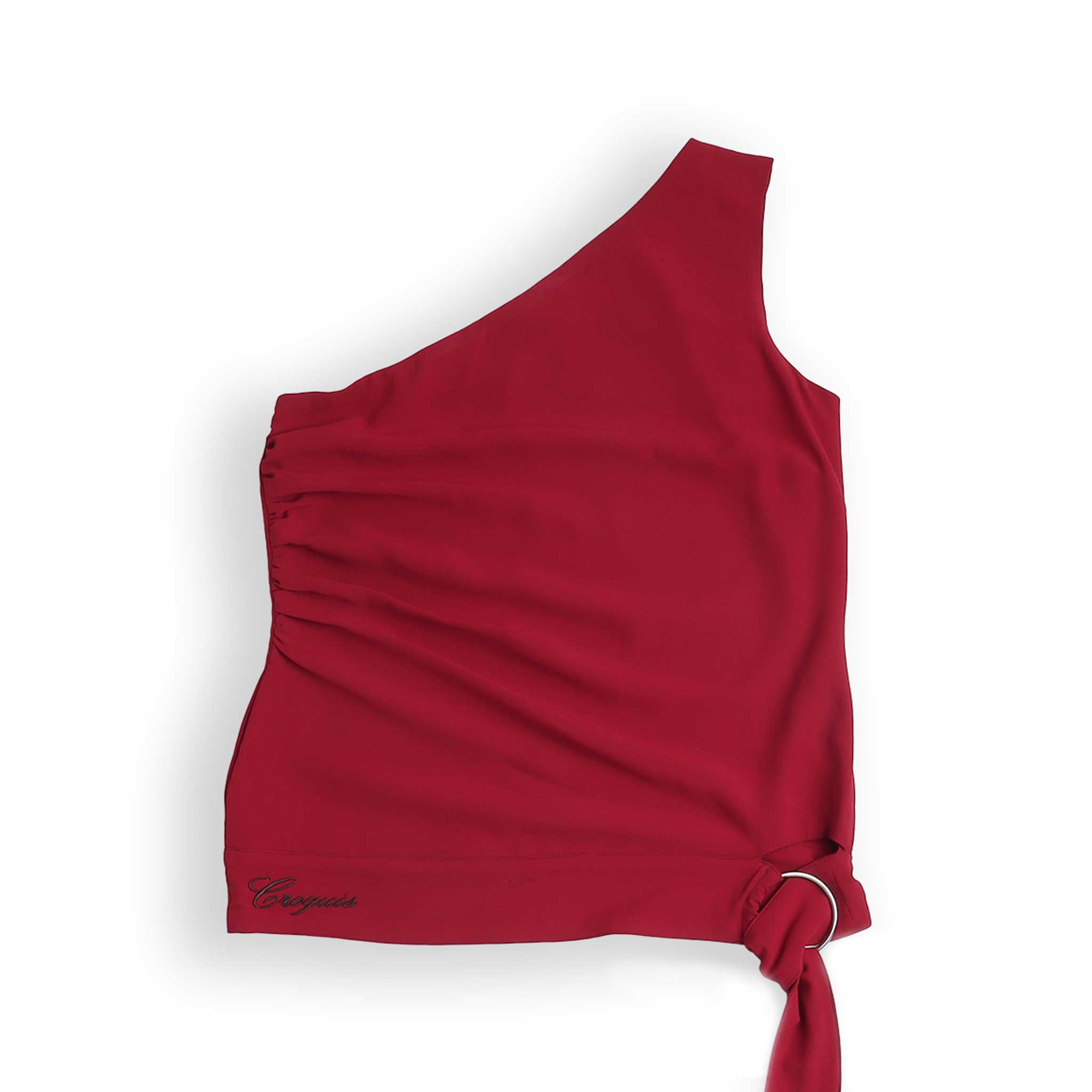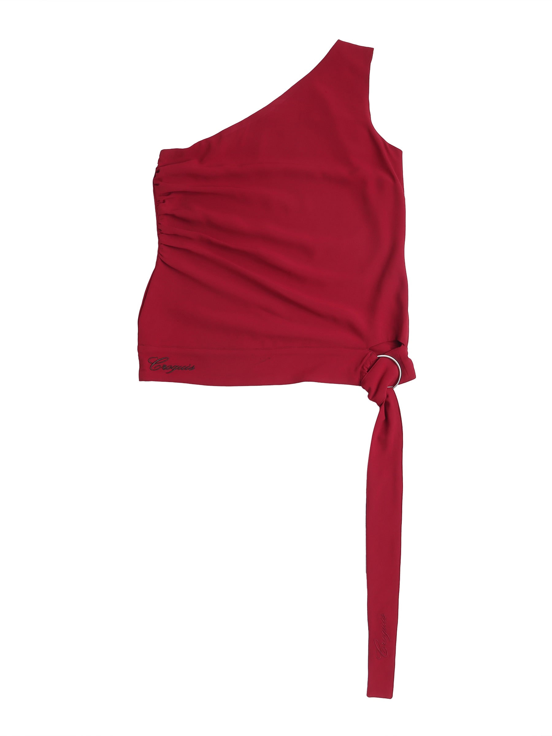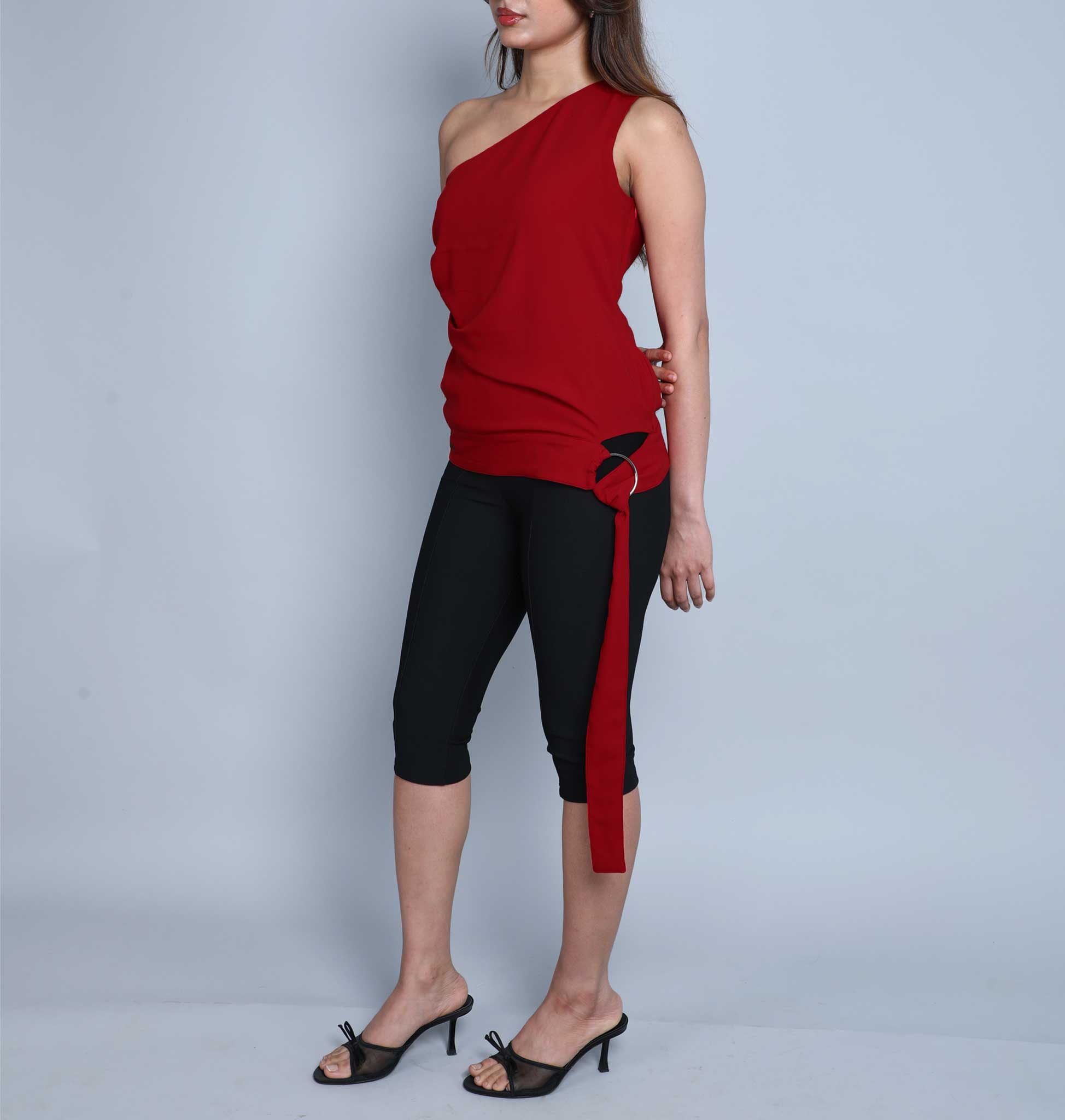 One Shoulder fitted top with gathered side detailing, Adjustable side tie with metal ring accent