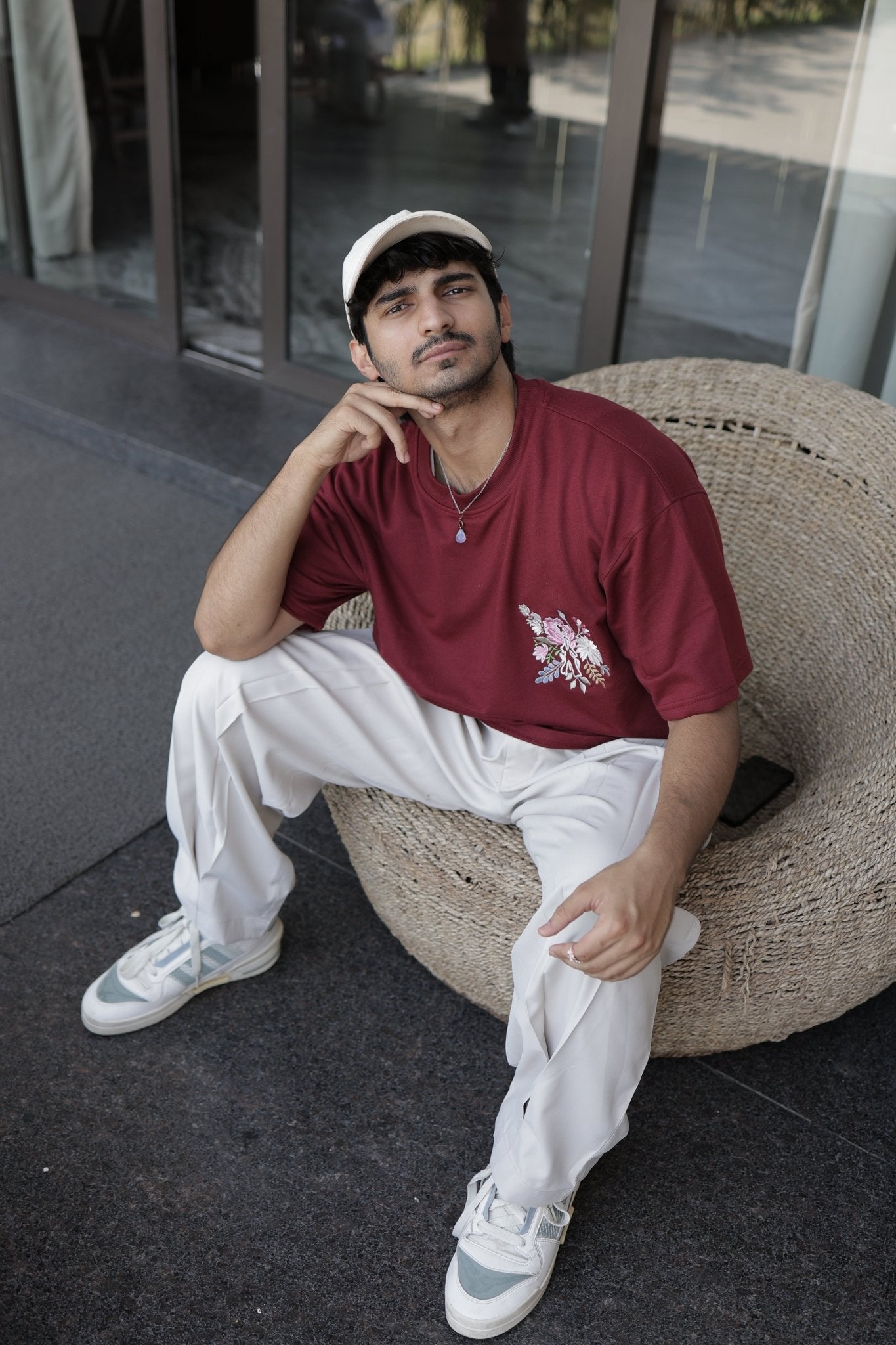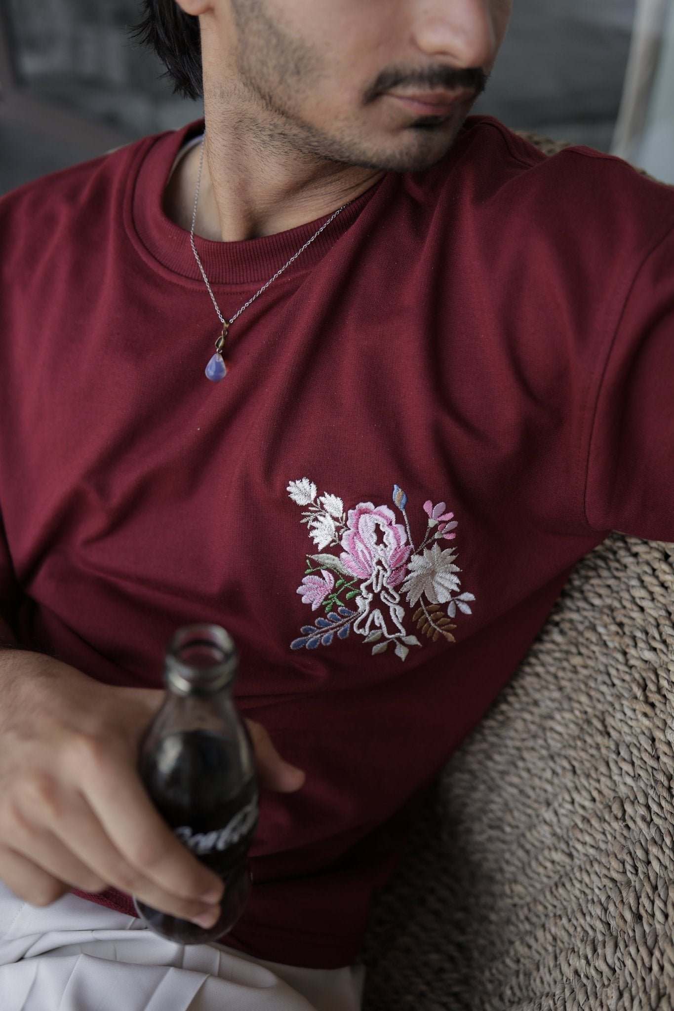 Red Forest T-shirt, a bold fusion of nature and streetwear. The front is detailed with forest artwork embroidery, while the back proudly displays the YB sign logo. Crafted from heavyweight French terry cotton, this tee is built to stand out with depth, texture, and meaning.
